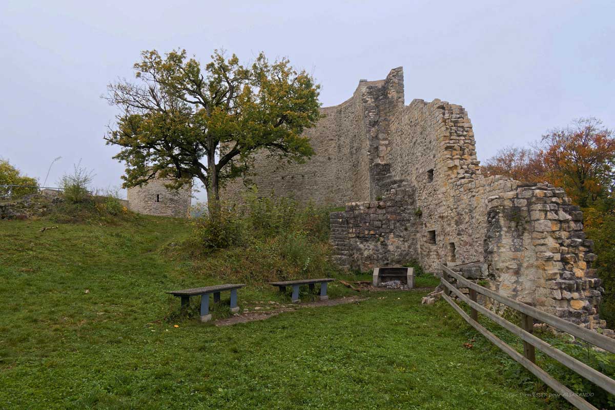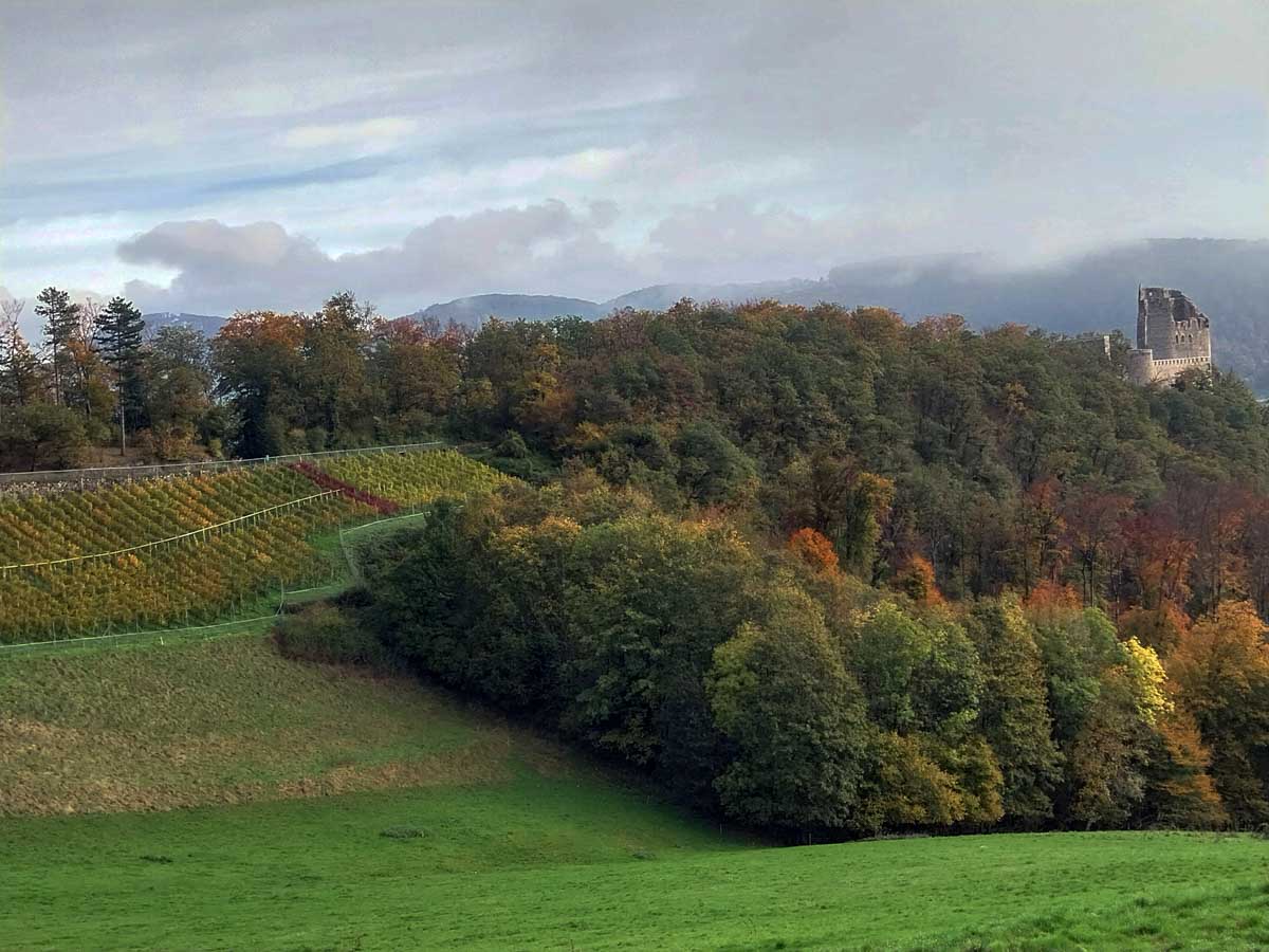 J’en étais où, du coup ? Ah oui, à Aesch. On a quitté Aesch et on a vu la ruine du jour, puisque tu pensais bien qu’ils allaient pas monter un château tout neuf juste pour nous. Le plus dur reste à faire, en prononcer le nom. Ben lance-toi, tiens, sinon tu vas encore me critiquer. Tu dis ? Répète ? Pfeffingen ? Non mais oh ! C’est pas une raison pour cracher dans mon pina… mon jus de raisin ! Eh oh, maintenant y’a des bulles dedans ! Oui je prends du jus de raisin avec mon repas. Parce que le malt et le houblon dans l’eau, bof, j’aime pas les grumeaux. Sauf quand c’est fermenté. Enfin donc on s’est fait la ruine de… prends ton parapluie : de Pfeffingen.