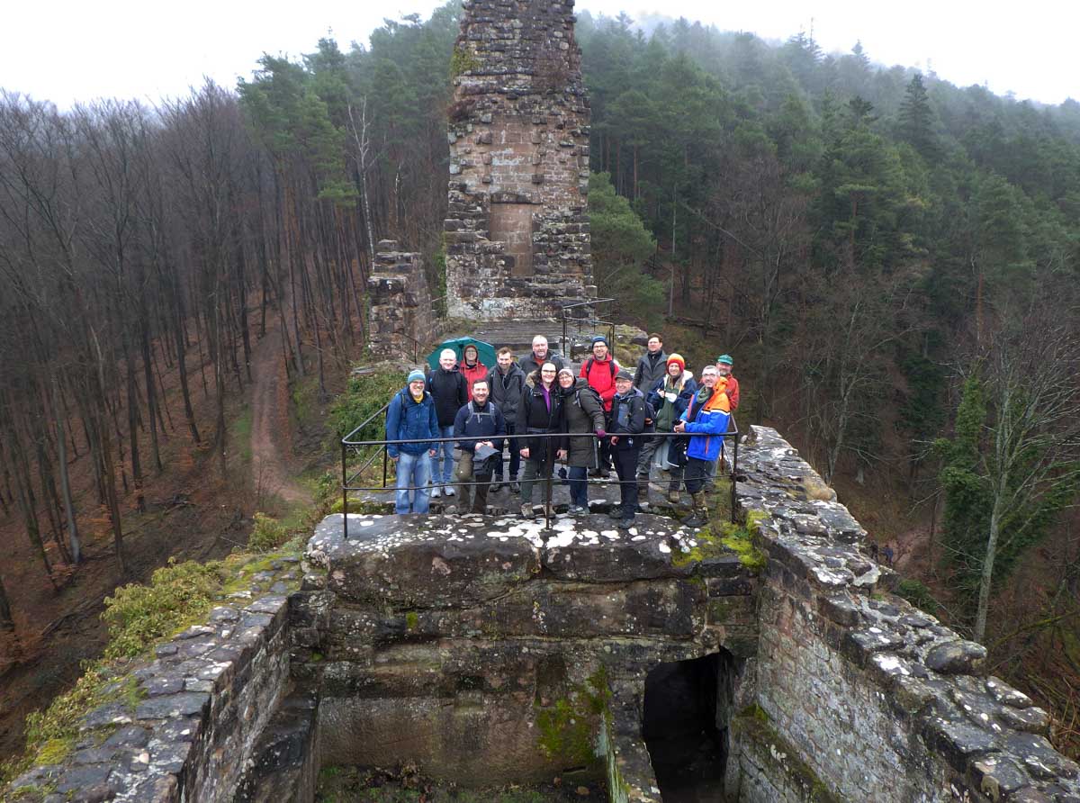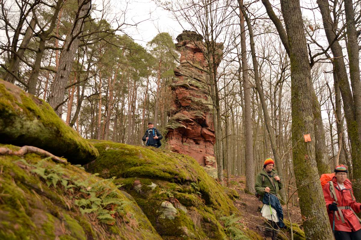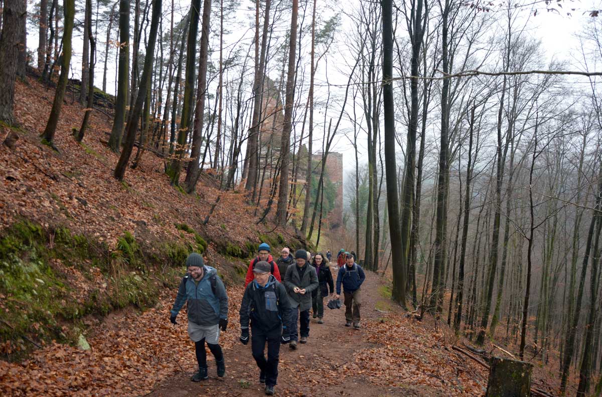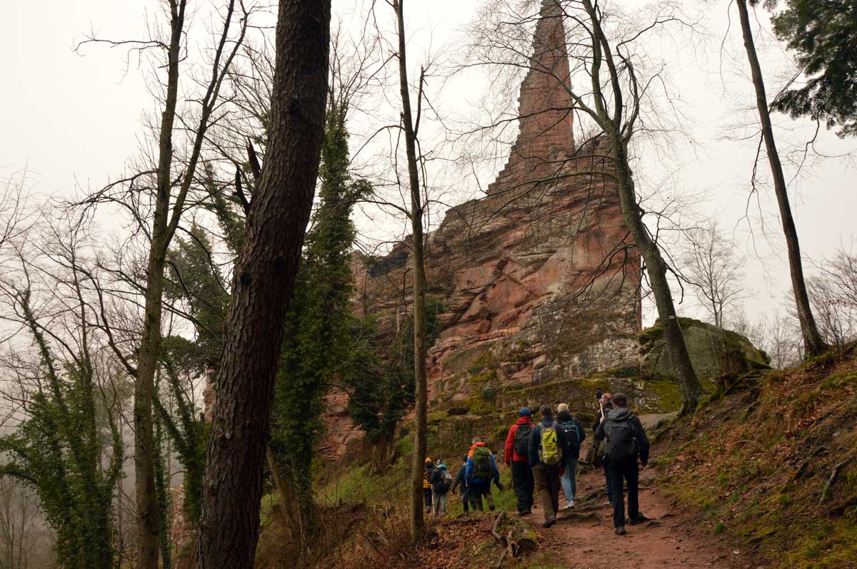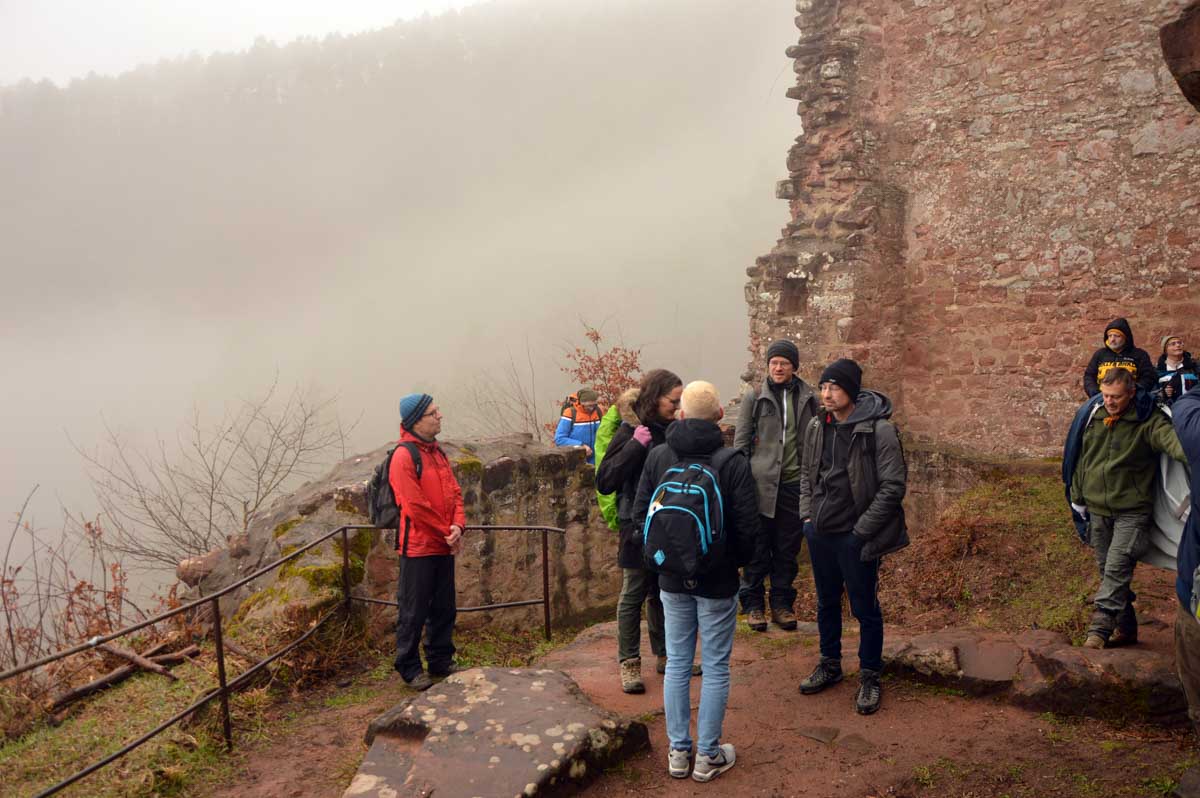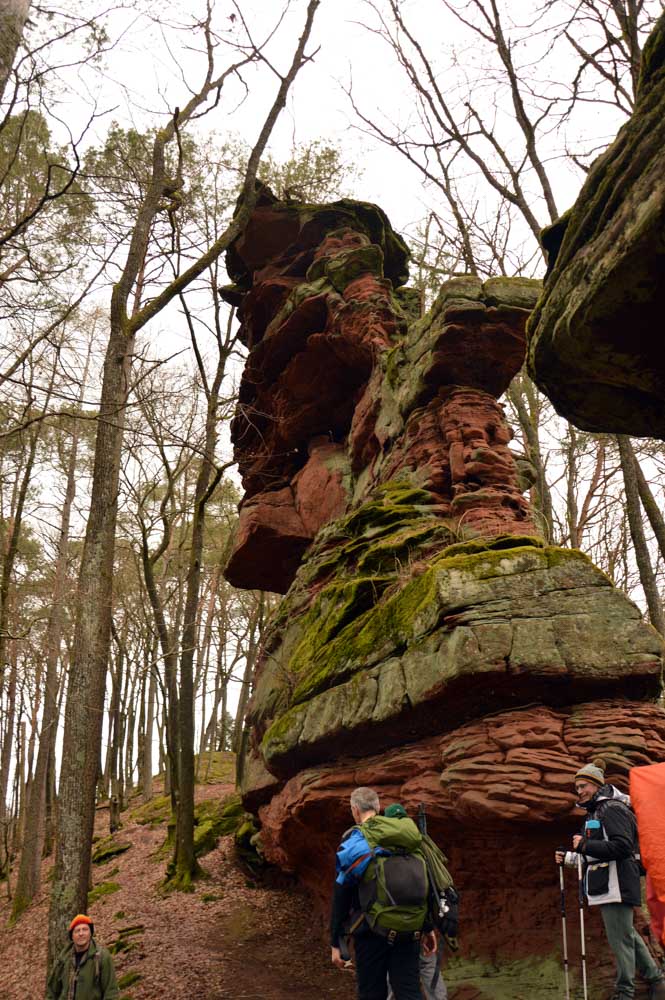 Mais bon, vous nous connaissez, on n’a pas pu s’empêcher de visiter deux ruines, le Petit Arnsbourg et le Wasigenstein, et de conclure le parcours par les superbes rochers de grès du Rumberg, évoluant ici tels des équilibristes naturels. J’ai essayé de prendre la même pose, je me soigne au Voltarène. Pour l’occasion, nous avions fait cette randonnée avec nos potes de Uferlos, de Karlsruhe, pour expérimenter un bilinguisme mêlé d’Anglais mais surtout plein de bonne humeur. En remerciant Eric pour l’organisation de l’accueil café et du pot Kaffee-Kuchen final.