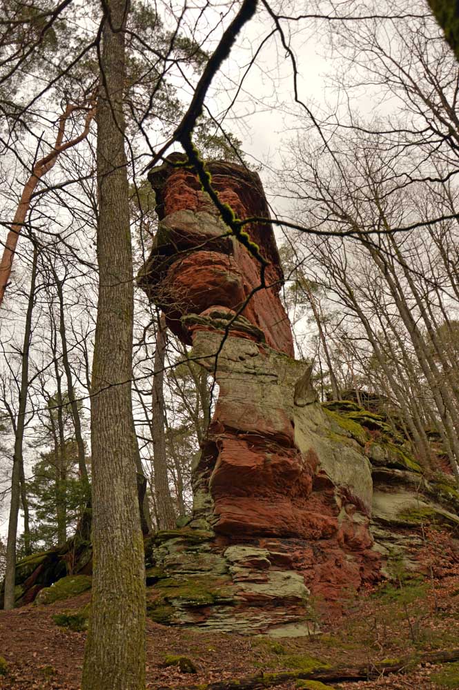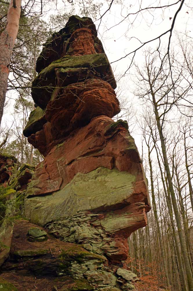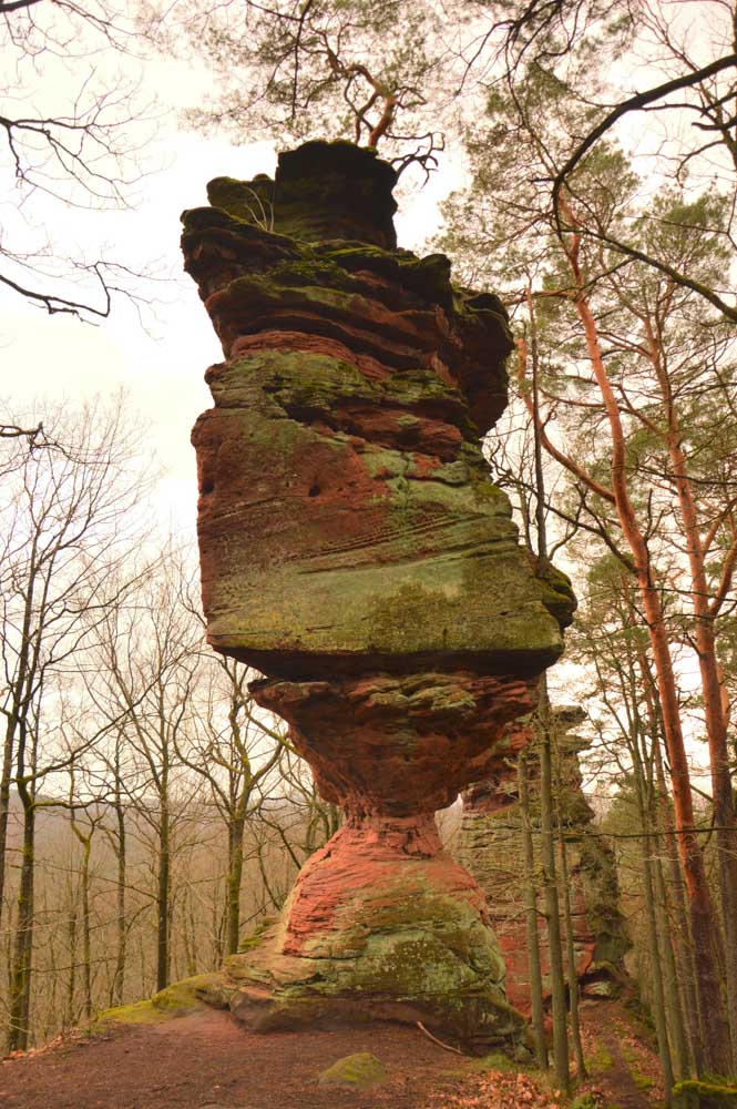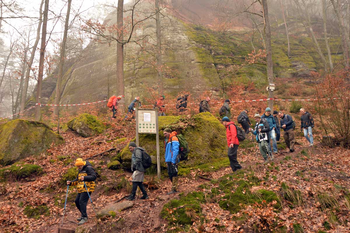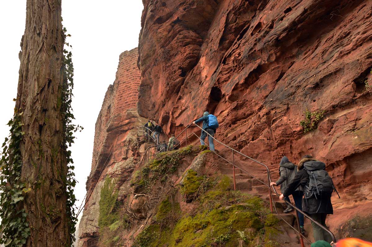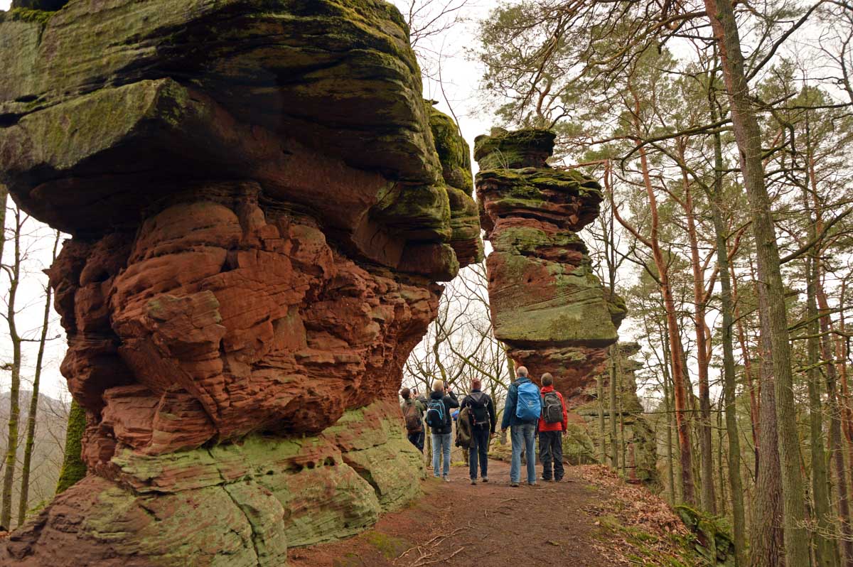 Mais bon, vous nous connaissez, on n’a pas pu s’empêcher de visiter deux ruines, le Petit Arnsbourg et le Wasigenstein, et de conclure le parcours par les superbes rochers de grès du Rumberg, évoluant ici tels des équilibristes naturels. J’ai essayé de prendre la même pose, je me soigne au Voltarène. Pour l’occasion, nous avions fait cette randonnée avec nos potes de Uferlos, de Karlsruhe, pour expérimenter un bilinguisme mêlé d’Anglais mais surtout plein de bonne humeur. En remerciant Eric pour l’organisation de l’accueil café et du pot Kaffee-Kuchen final.