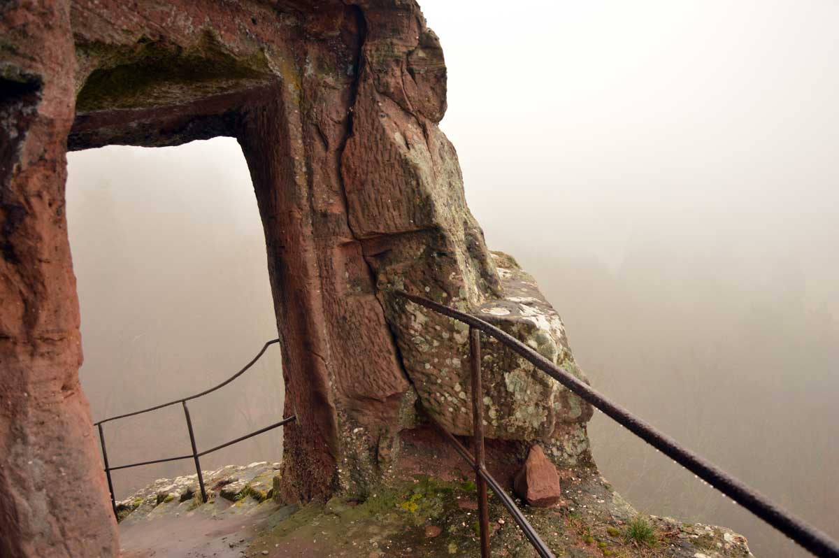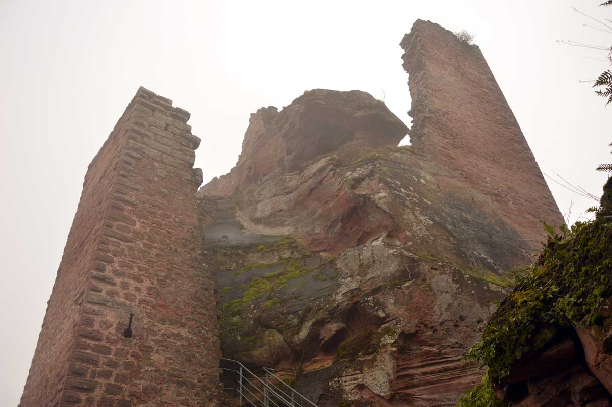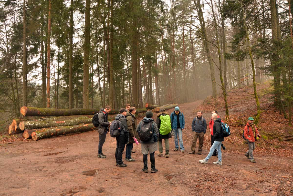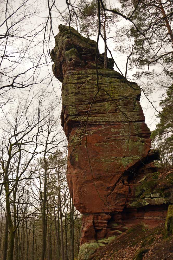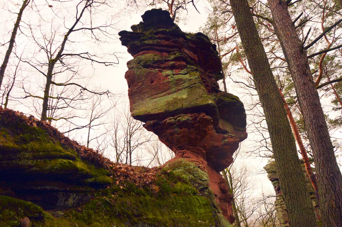 Mais bon, vous nous connaissez, on n’a pas pu s’empêcher de visiter deux ruines, le Petit Arnsbourg et le Wasigenstein, et de conclure le parcours par les superbes rochers de grès du Rumberg, évoluant ici tels des équilibristes naturels. J’ai essayé de prendre la même pose, je me soigne au Voltarène. Pour l’occasion, nous avions fait cette randonnée avec nos potes de Uferlos, de Karlsruhe, pour expérimenter un bilinguisme mêlé d’Anglais mais surtout plein de bonne humeur. En remerciant Eric pour l’organisation de l’accueil café et du pot Kaffee-Kuchen final.