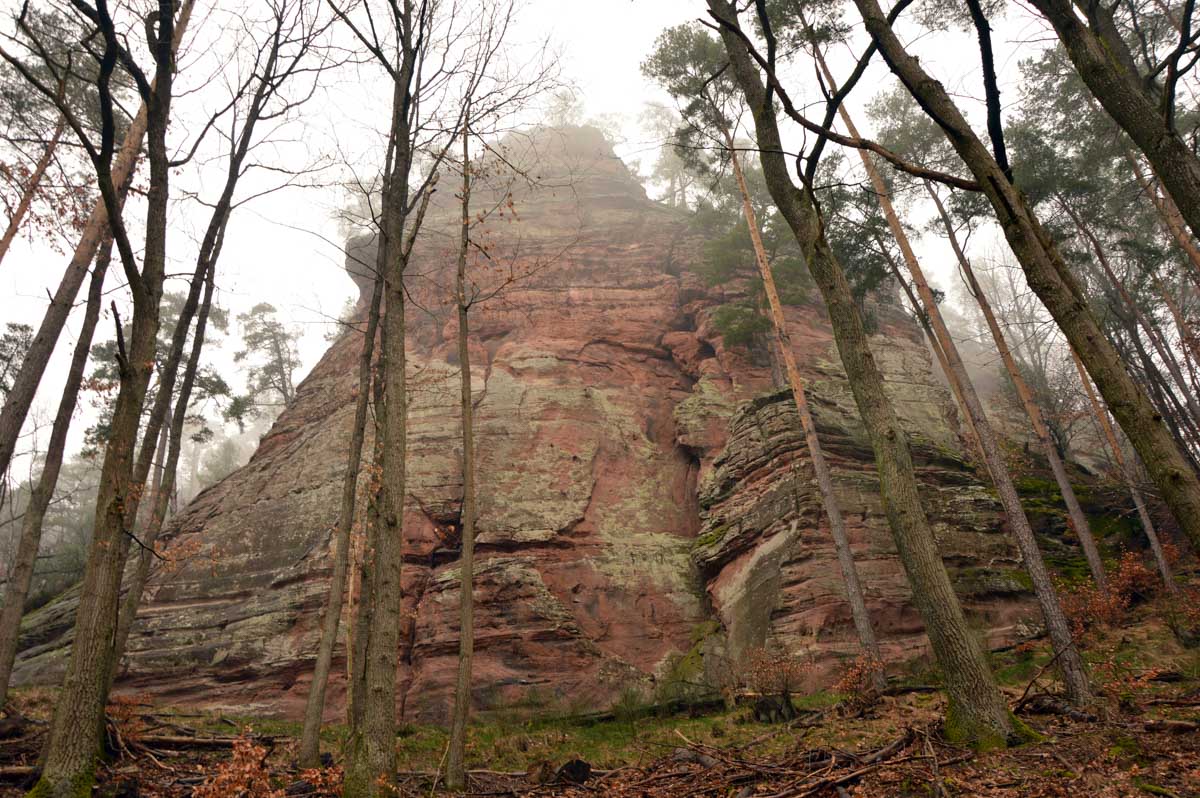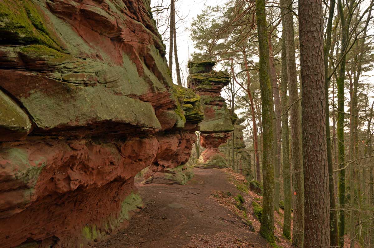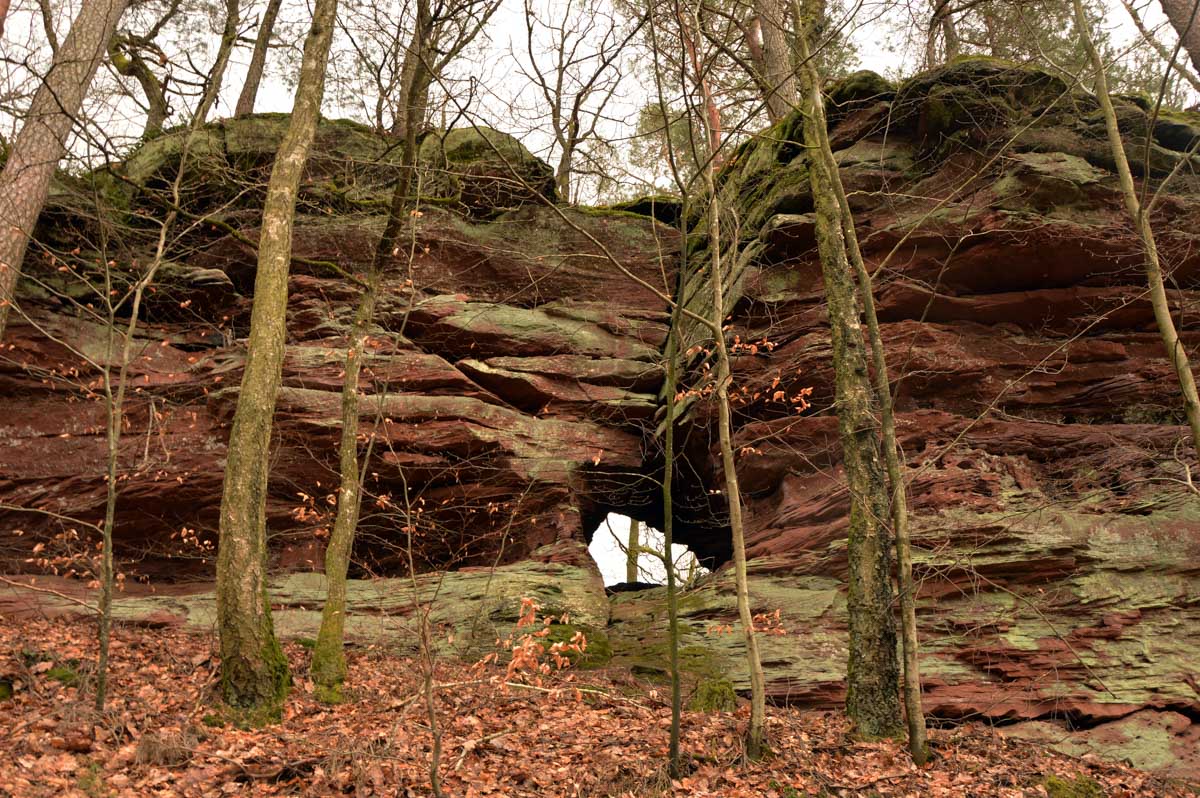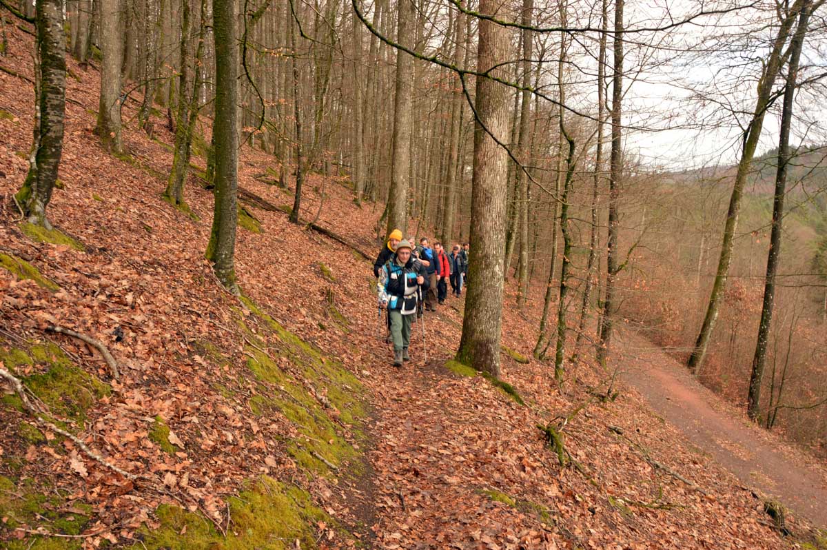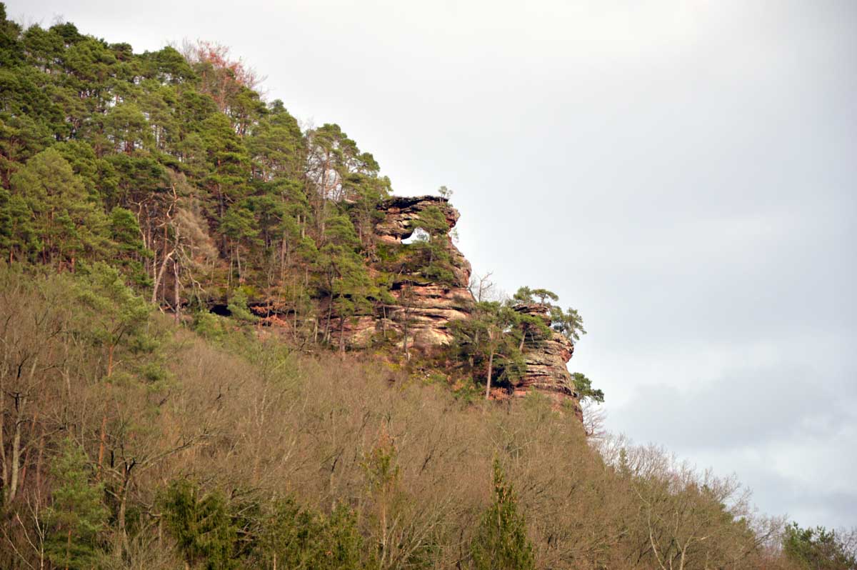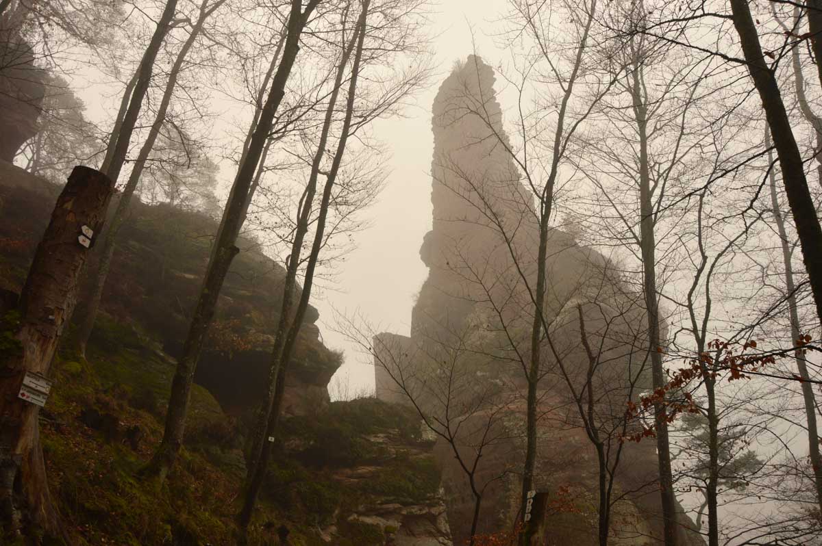 Mais bon, vous nous connaissez, on n’a pas pu s’empêcher de visiter deux ruines, le Petit Arnsbourg et le Wasigenstein, et de conclure le parcours par les superbes rochers de grès du Rumberg, évoluant ici tels des équilibristes naturels. J’ai essayé de prendre la même pose, je me soigne au Voltarène. Pour l’occasion, nous avions fait cette randonnée avec nos potes de Uferlos, de Karlsruhe, pour expérimenter un bilinguisme mêlé d’Anglais mais surtout plein de bonne humeur. En remerciant Eric pour l’organisation de l’accueil café et du pot Kaffee-Kuchen final.