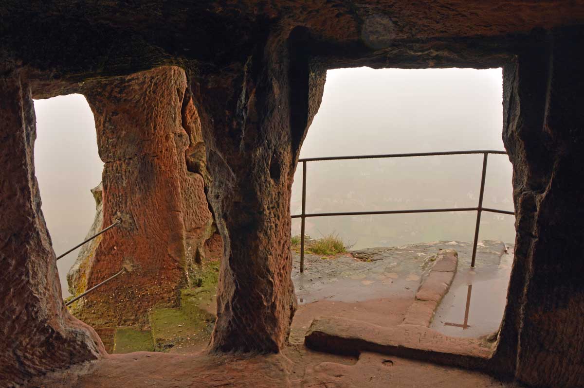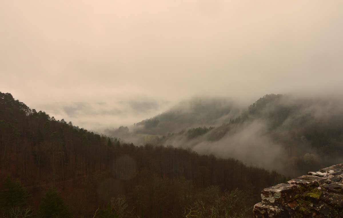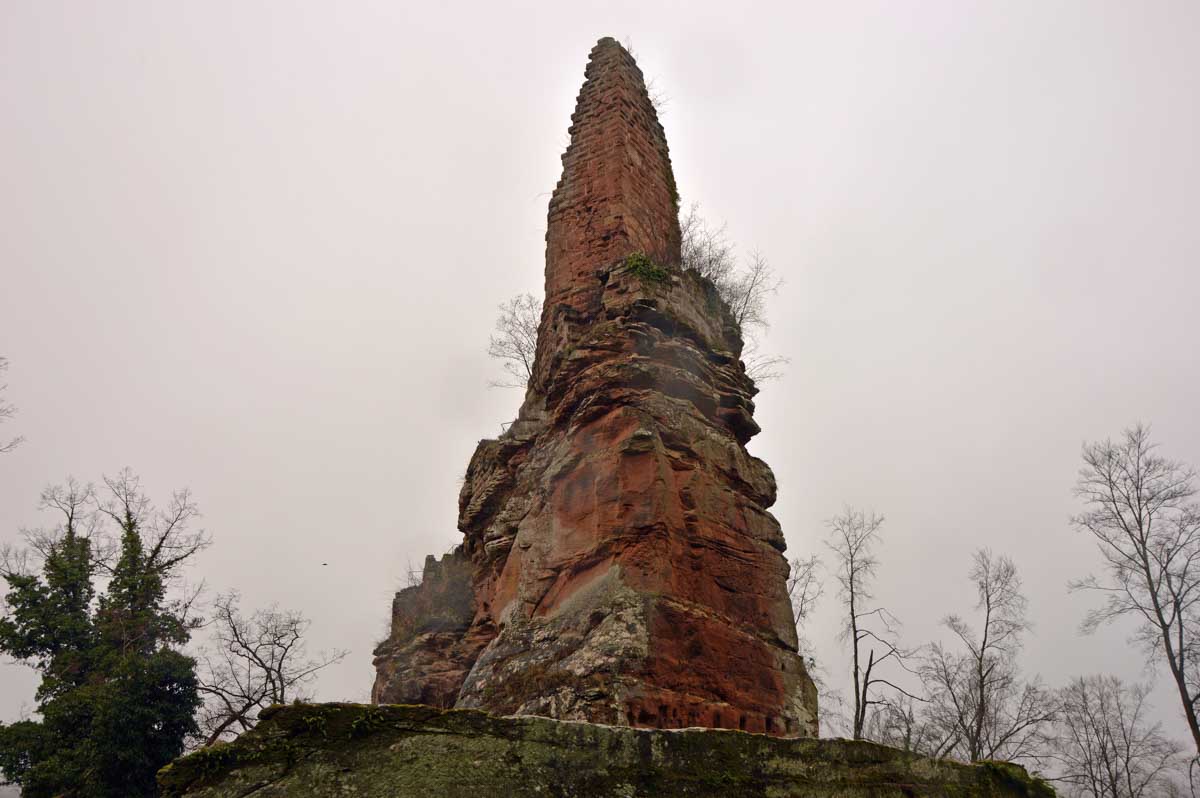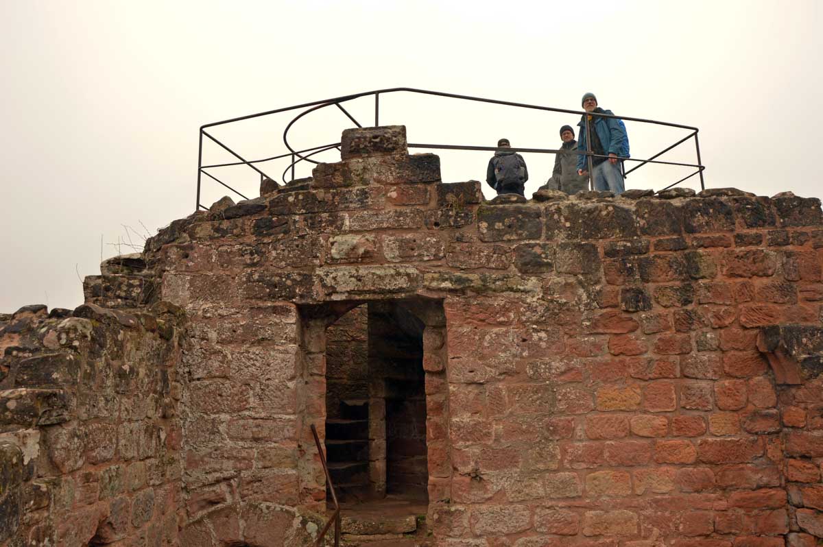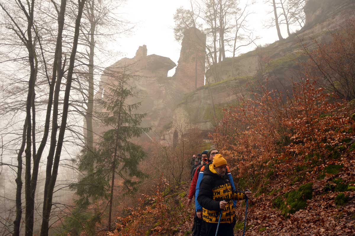 Mais bon, vous nous connaissez, on n’a pas pu s’empêcher de visiter deux ruines, le Petit Arnsbourg et le Wasigenstein, et de conclure le parcours par les superbes rochers de grès du Rumberg, évoluant ici tels des équilibristes naturels. J’ai essayé de prendre la même pose, je me soigne au Voltarène. Pour l’occasion, nous avions fait cette randonnée avec nos potes de Uferlos, de Karlsruhe, pour expérimenter un bilinguisme mêlé d’Anglais mais surtout plein de bonne humeur. En remerciant Eric pour l’organisation de l’accueil café et du pot Kaffee-Kuchen final.