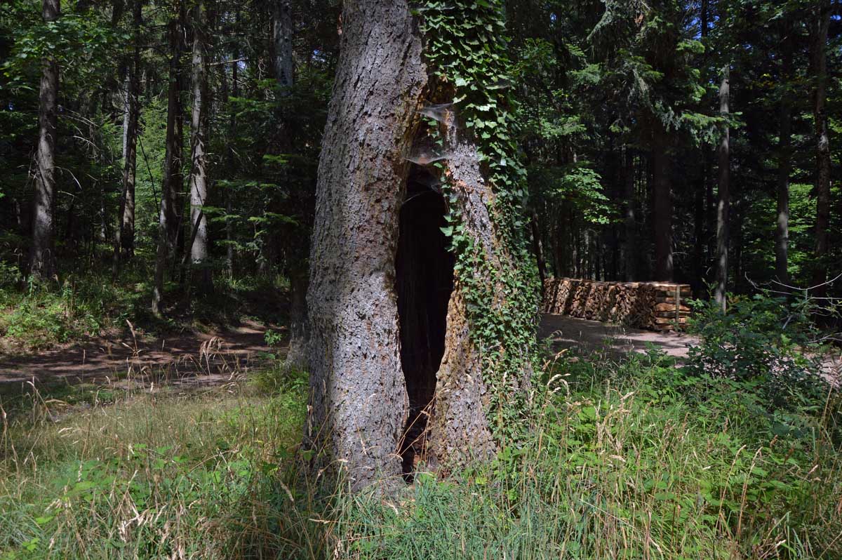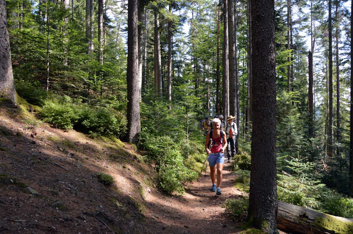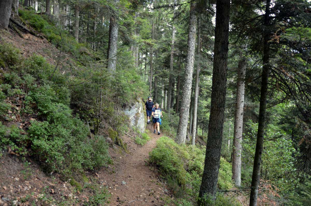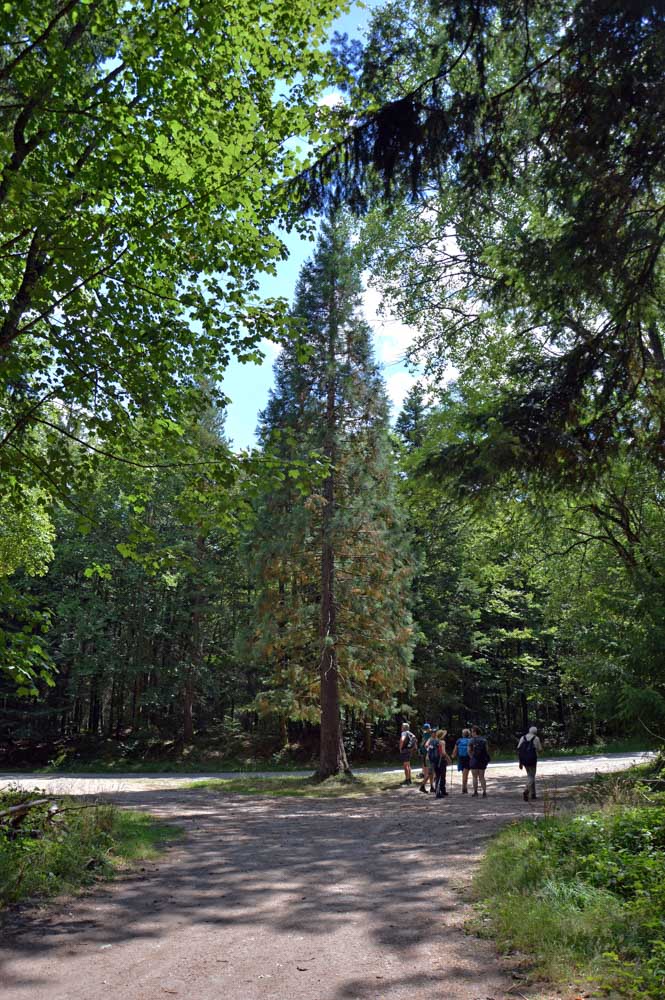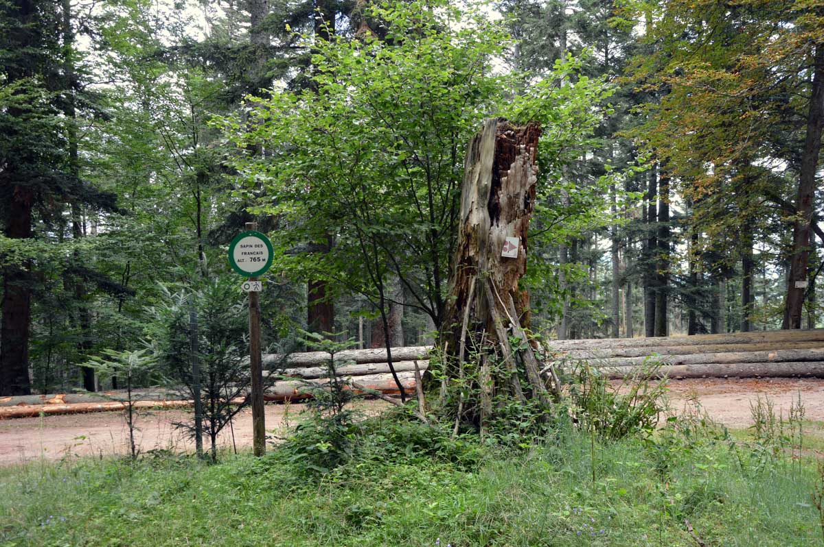 Puis voilà la descente toujours en forêt, avec le Sapin des Français, du moins ce qu’il en reste, et rapidement, une sorte de méfiance s’est installée… Ne serions-pas descendus plus bas qu’Aubure ? Saint-Alexis en personne nous l’a confirmé, puisqu’il habite dans sa chapelle, à côté de l’auberge, à 650 mètres. Aïe… Du coup hop, nous voilà dans un raidillon qui nous a propulsés d’un coup au-delà de 700 mètres, puis c’est un nouveau sentier comme on les aime, tapissé d’aiguilles de pins, qui nous a emmenés tranquillement vers le Col du Kalblin. Ou comment remonter à 865 mètres presque sans s’en apercevoir.