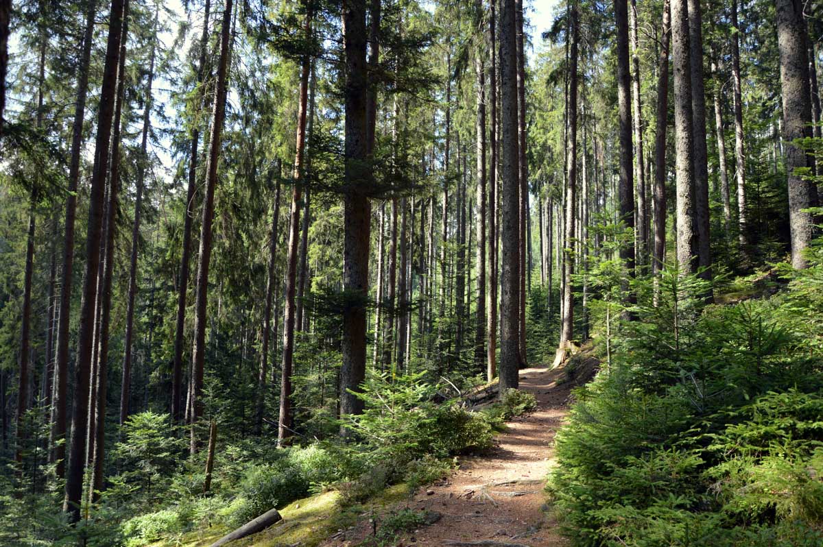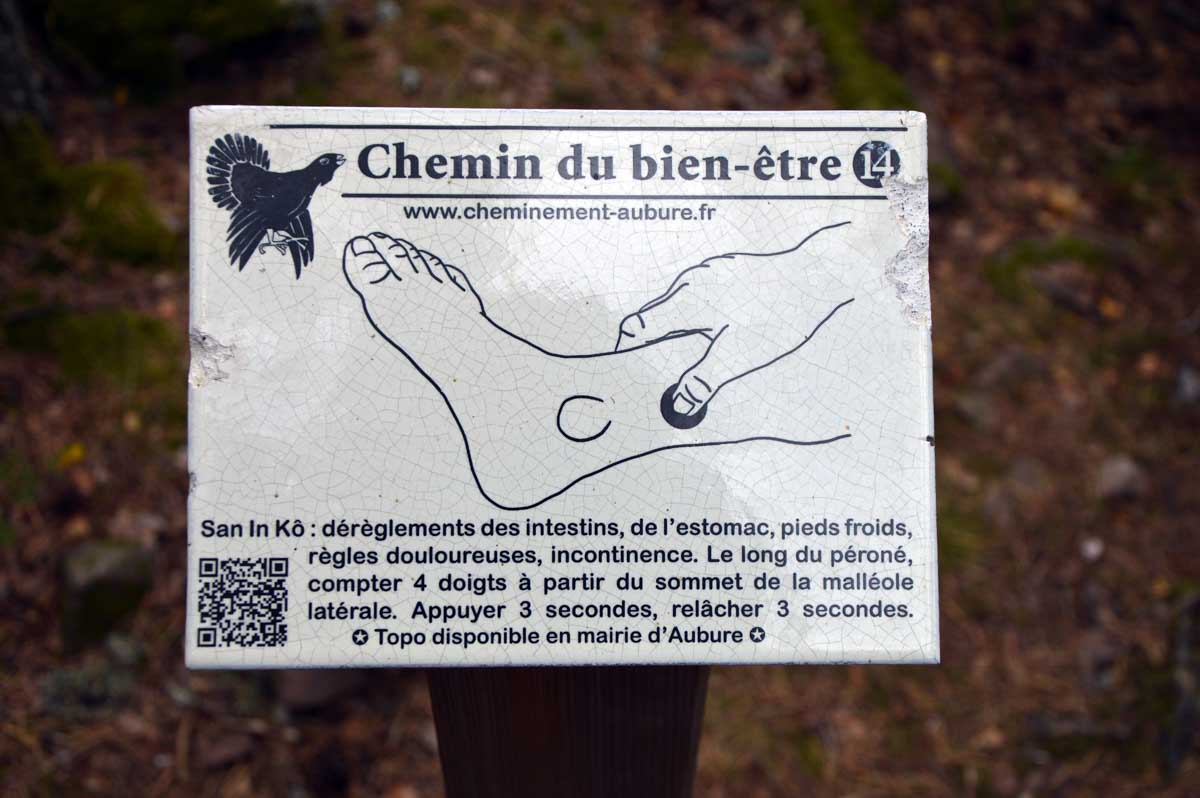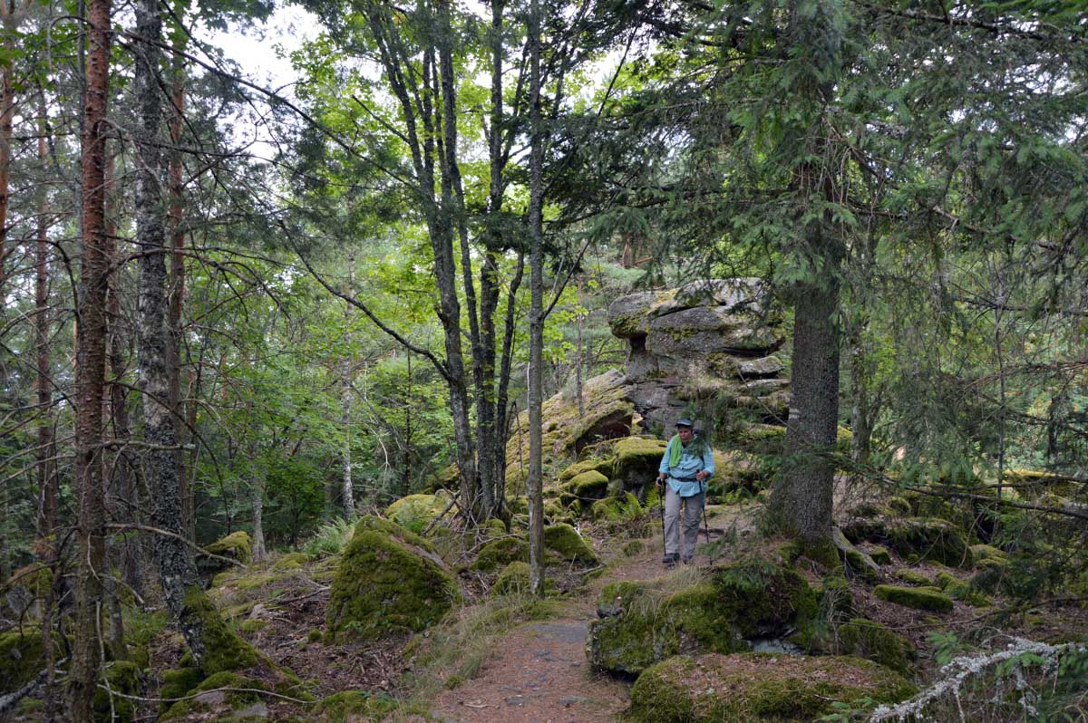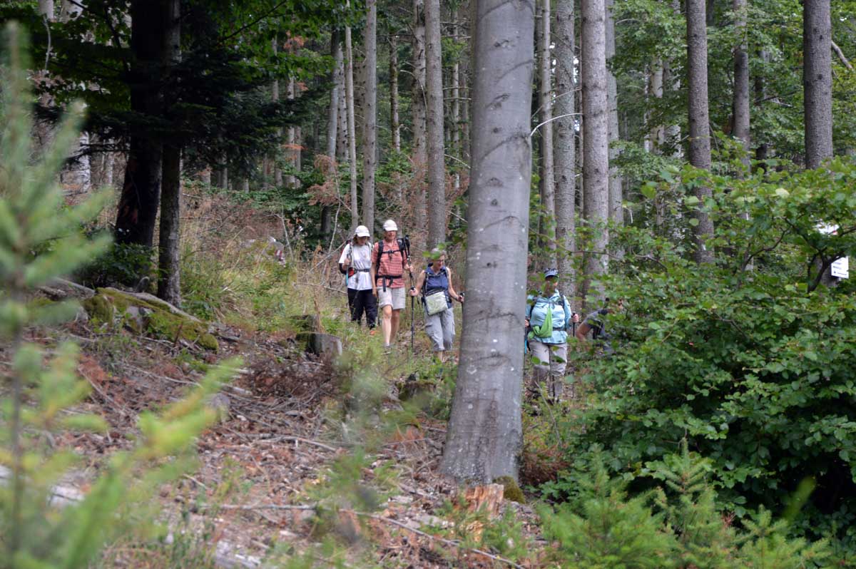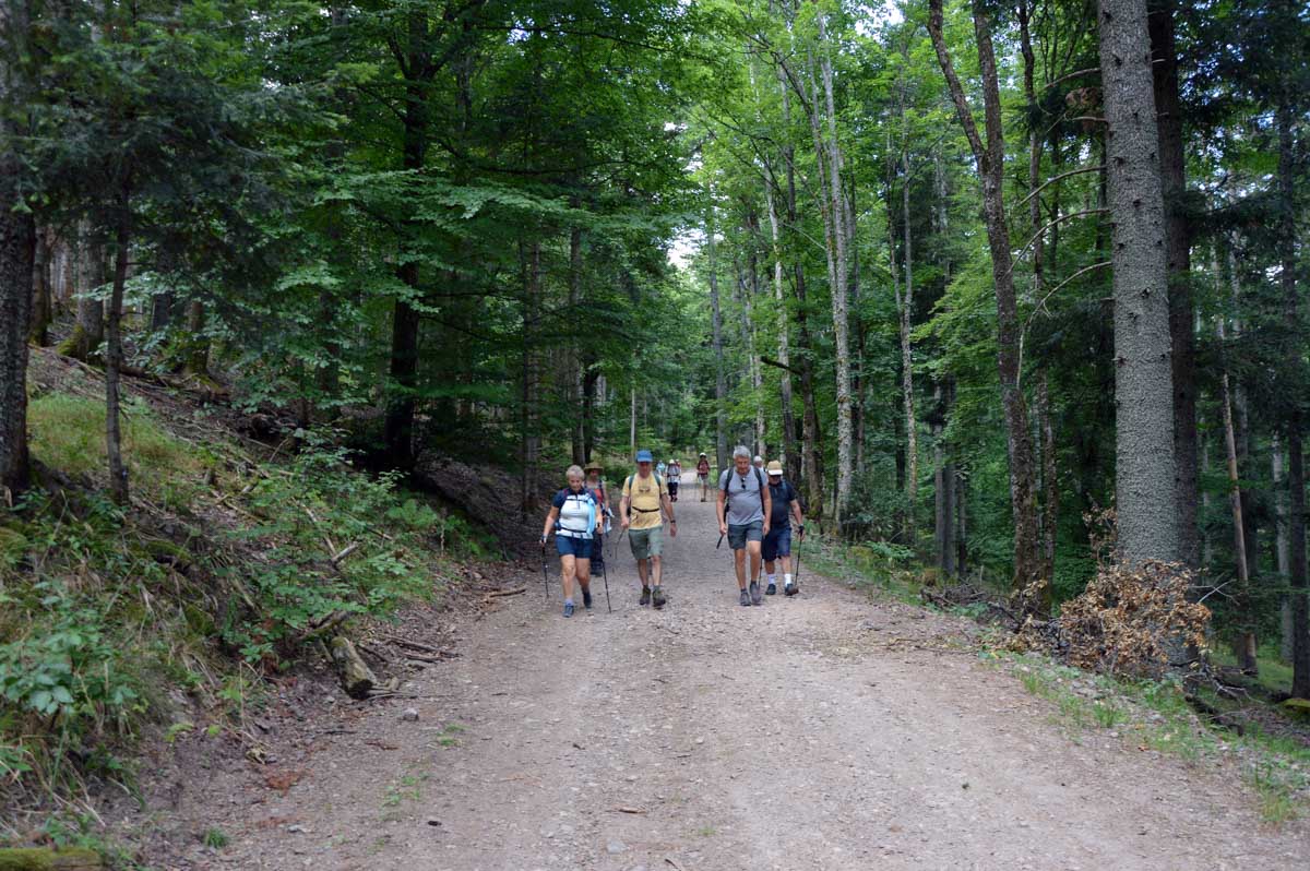 Puis voilà la descente toujours en forêt, avec le Sapin des Français, du moins ce qu’il en reste, et rapidement, une sorte de méfiance s’est installée… Ne serions-pas descendus plus bas qu’Aubure ? Saint-Alexis en personne nous l’a confirmé, puisqu’il habite dans sa chapelle, à côté de l’auberge, à 650 mètres. Aïe… Du coup hop, nous voilà dans un raidillon qui nous a propulsés d’un coup au-delà de 700 mètres, puis c’est un nouveau sentier comme on les aime, tapissé d’aiguilles de pins, qui nous a emmenés tranquillement vers le Col du Kalblin. Ou comment remonter à 865 mètres presque sans s’en apercevoir.