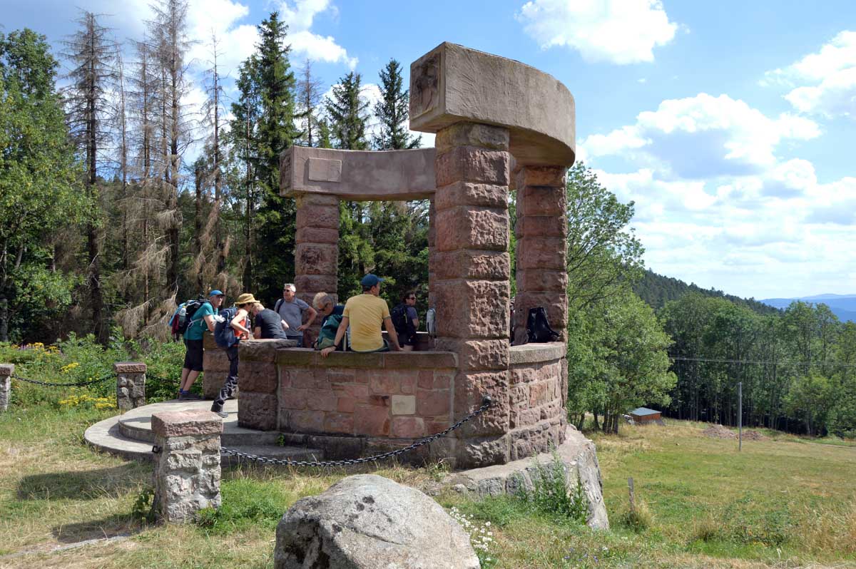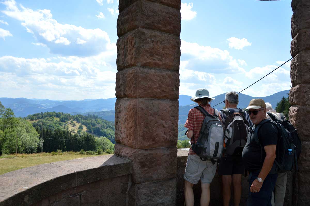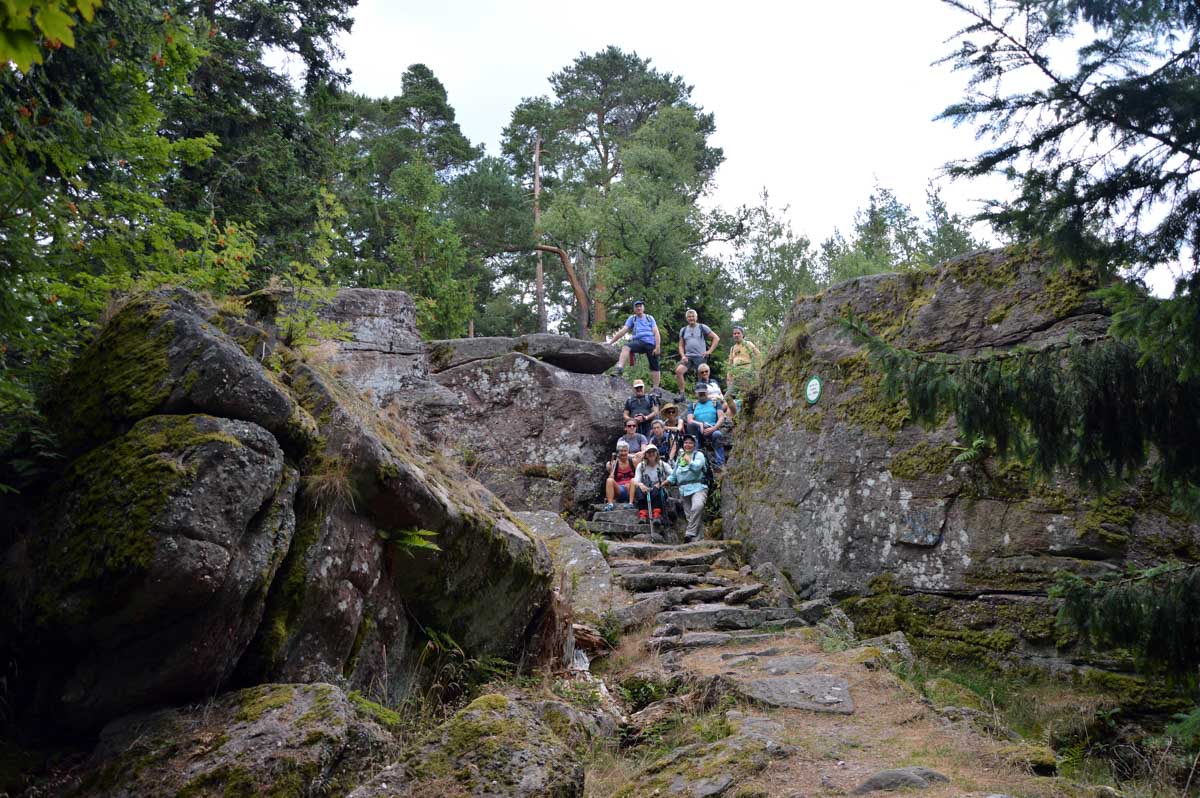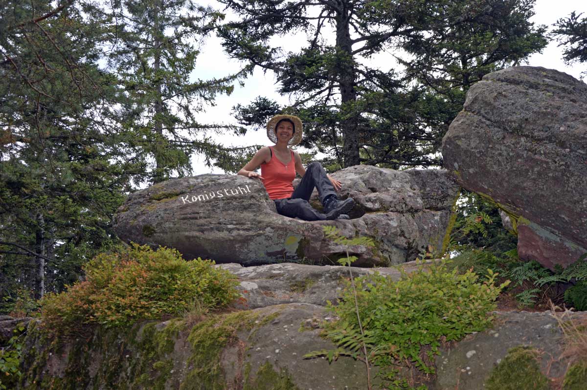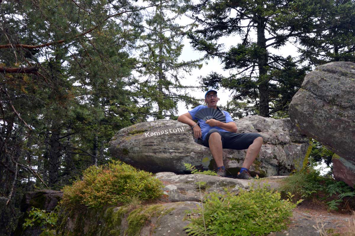 L’avantage, c’est une température un peu moins insupportable qu’en plaine, et d’agréables sentiers dans des forêts de pins, avec des montées douces pour découvrir la Roche du Tétras et l’étonnant Koenigsstuhl, à 938 mètres, où comme son nom le suggère, siégeait un jour un roi, sous réserve que la légende repose sur du vrai. Ou carrément le diable, dans une autre version. En tous les cas, l’occupant avait le fessier charnu.