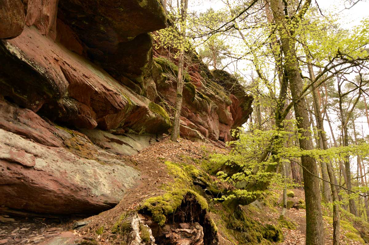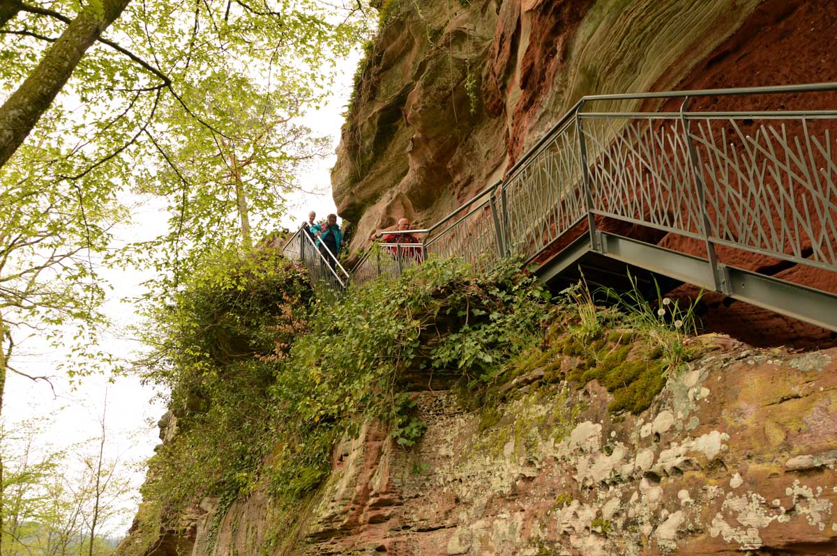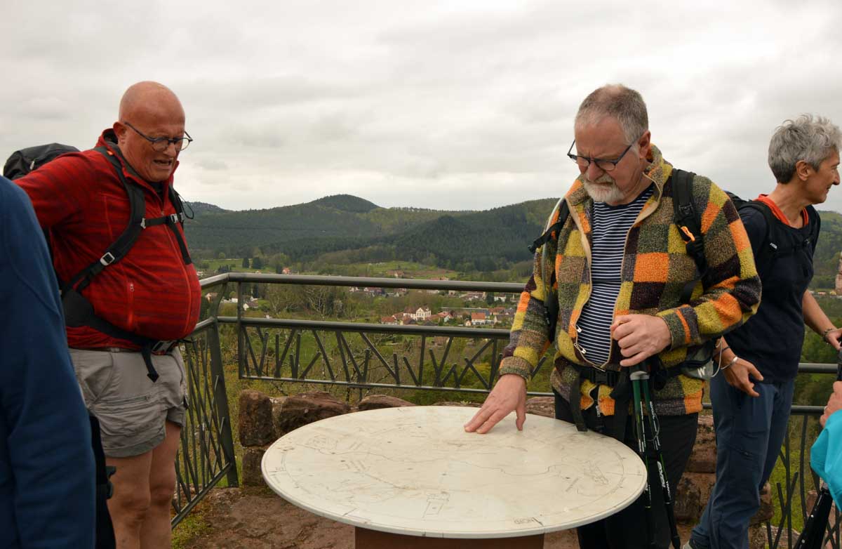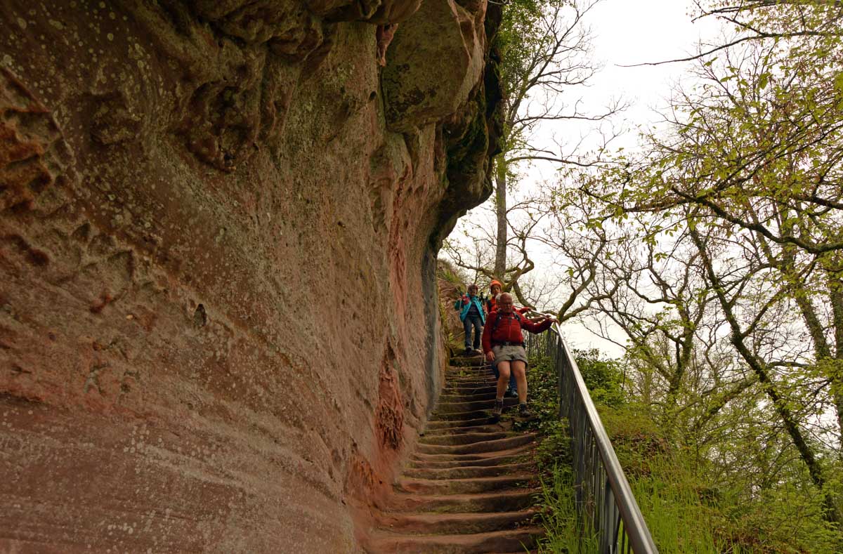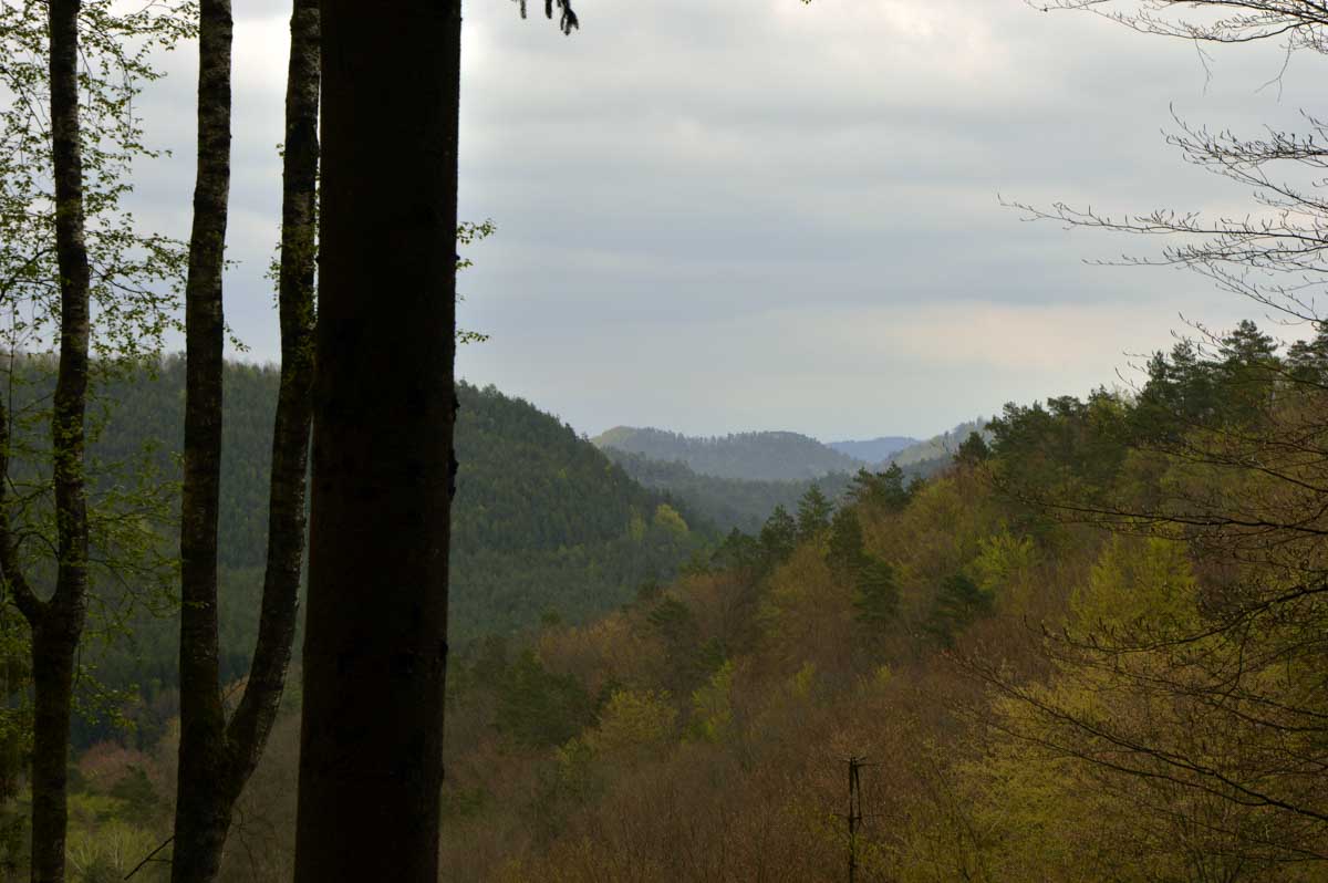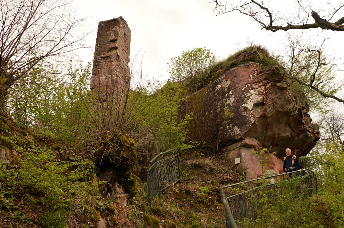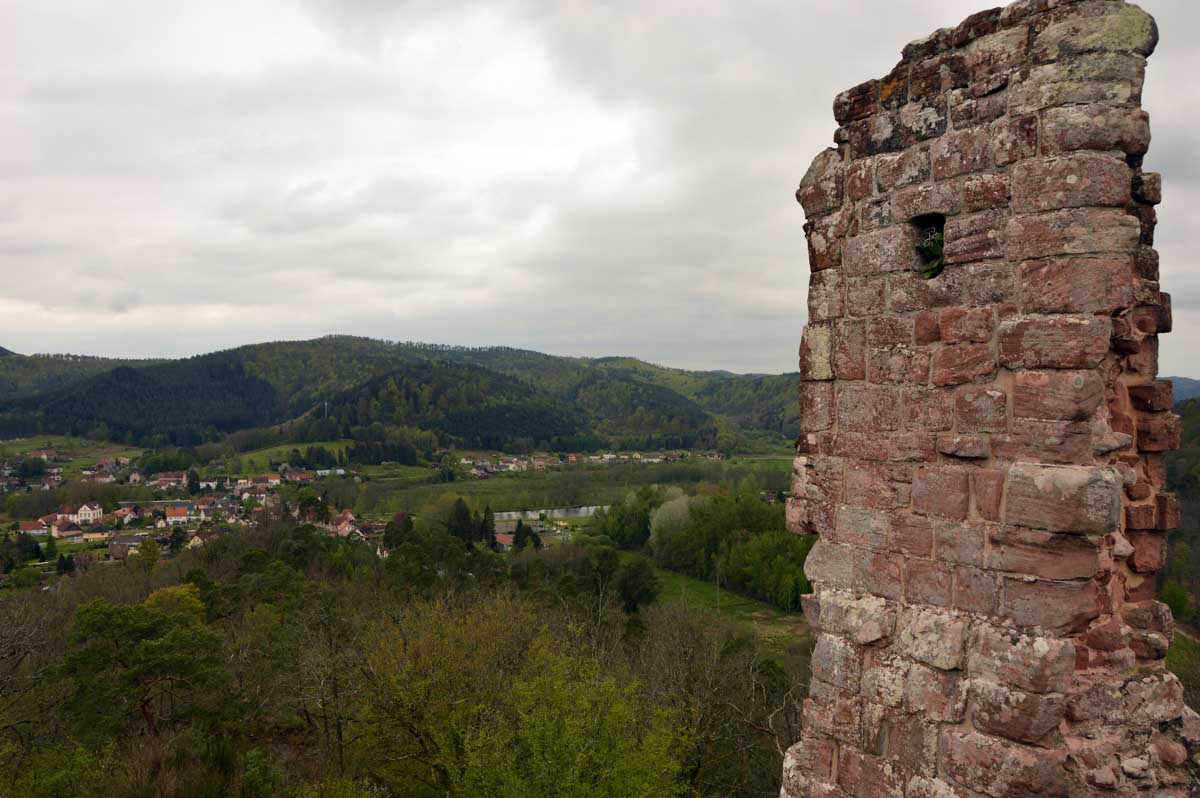 Une vue sur Baerenthal nous fut offerte (c’est bien écrit, non ?) depuis la ruine du Ramstein. L’en reste un bout de mur mais surtout des pièces creusées dans le grès. Ils n’avaient pas peur des caves humides à l’époque, mais il s’en fout… enfin peu leur challait (?), ils mettaient en prison qui ne leur plaisait pas.