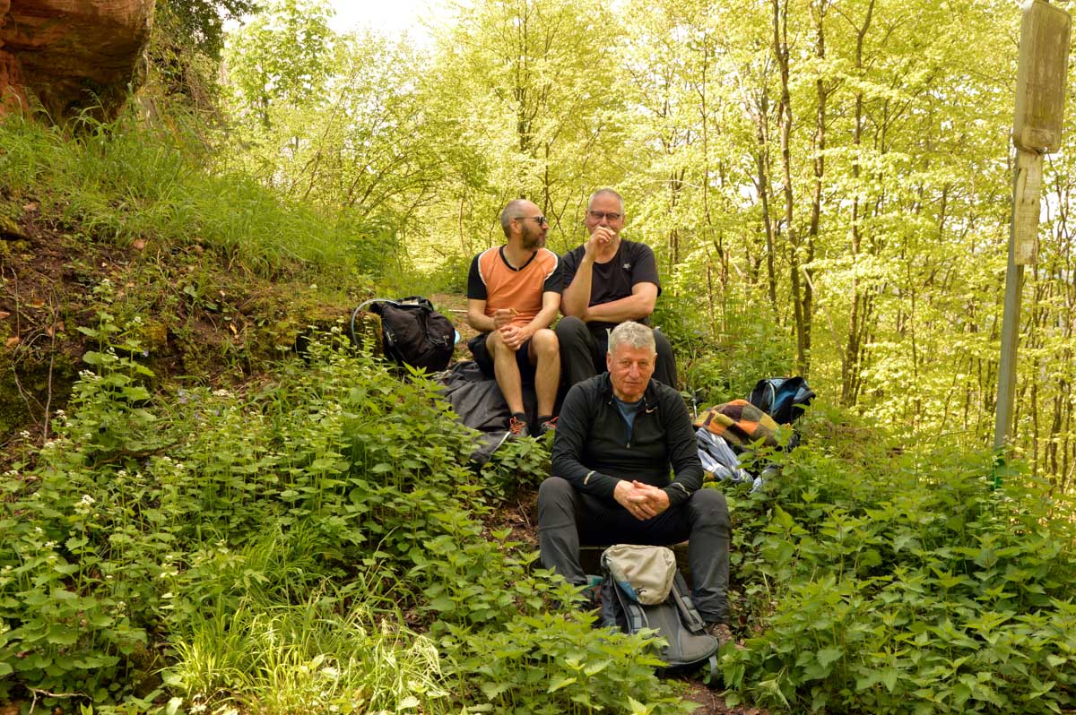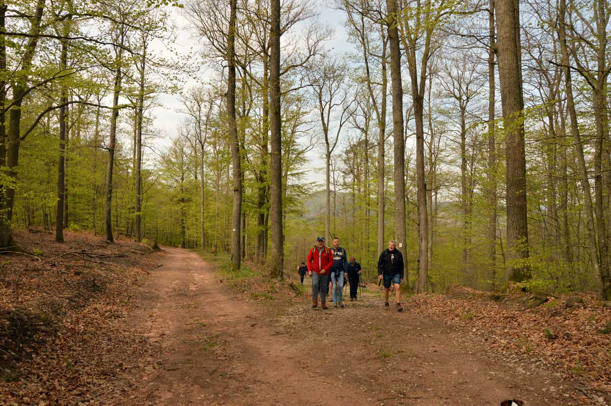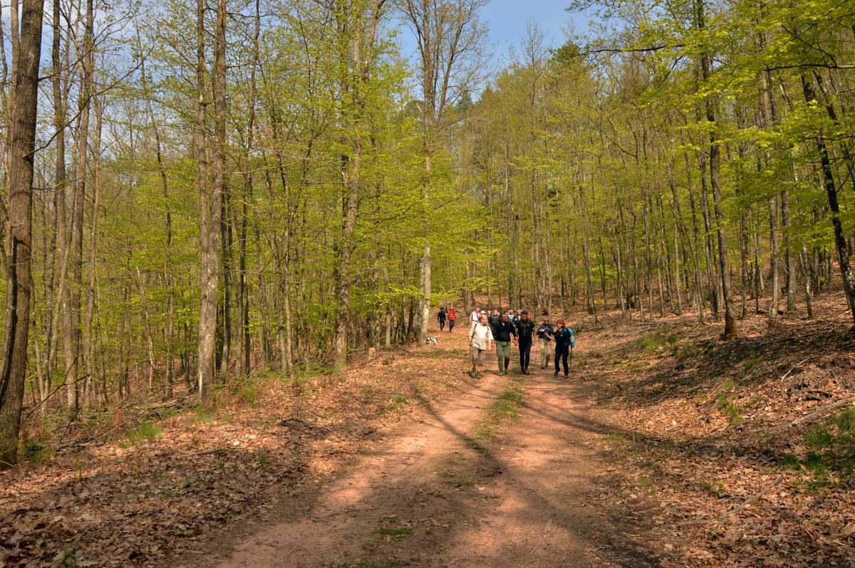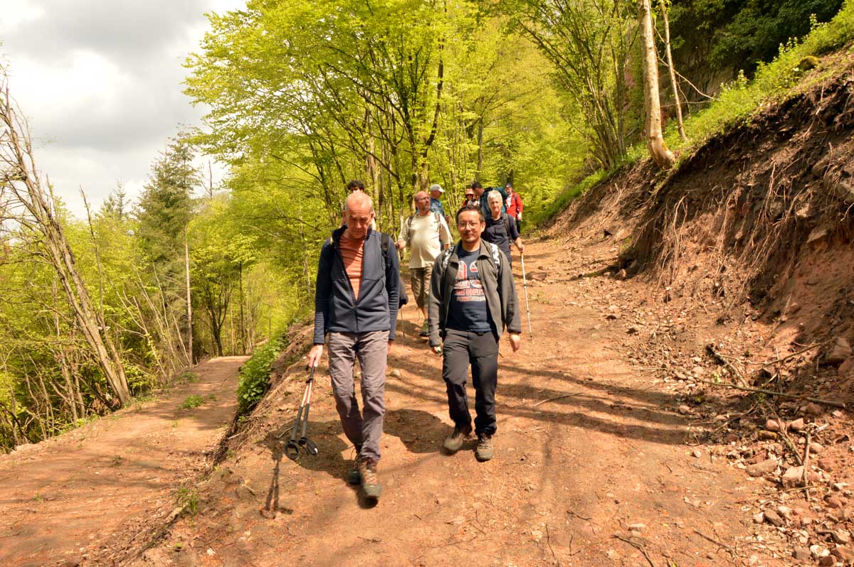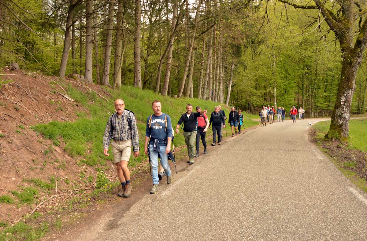 Craignant un concert de casseroles pour ce 1er mai, le président s’est empressé d’occuper ses troupes en les faisant nettoyer le logis, avant de démarrer sans temps mort, sur les chapeaux de roue et surtout en chaussures de randonnée, pour un véritable bain de forêt vers le carrefour du Kreuzberg, le Col du Grand Hirschthal (380 mètres d’altitude quand même !) et le Col du Schlangenthal. Ça nous amusait moins : ça veut dire la vallée des serpents.