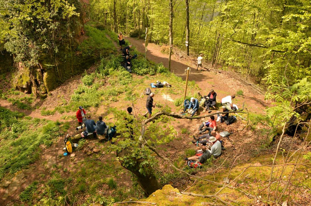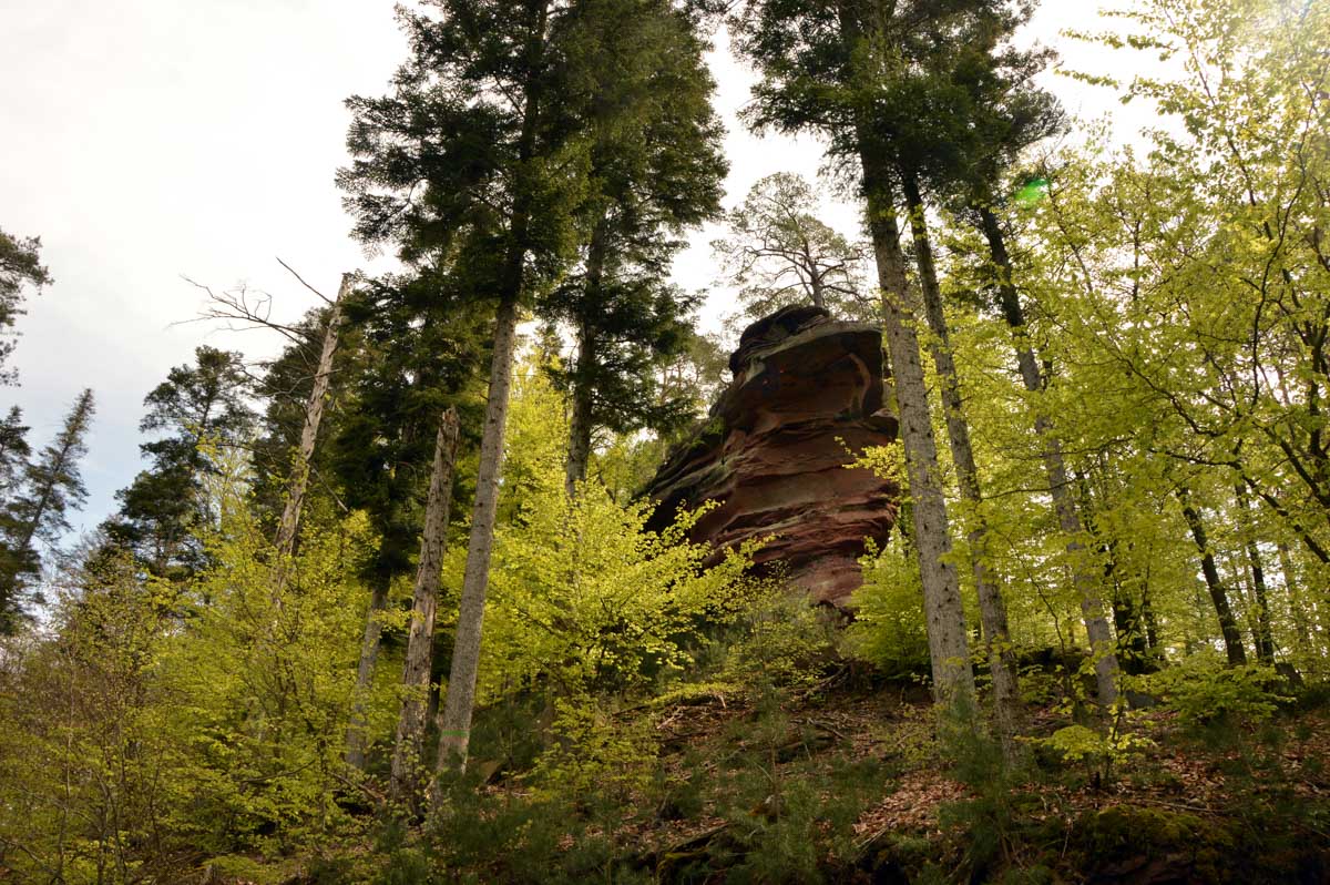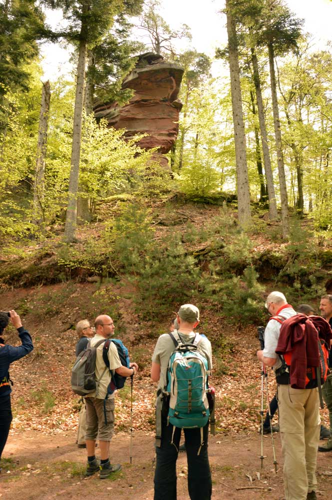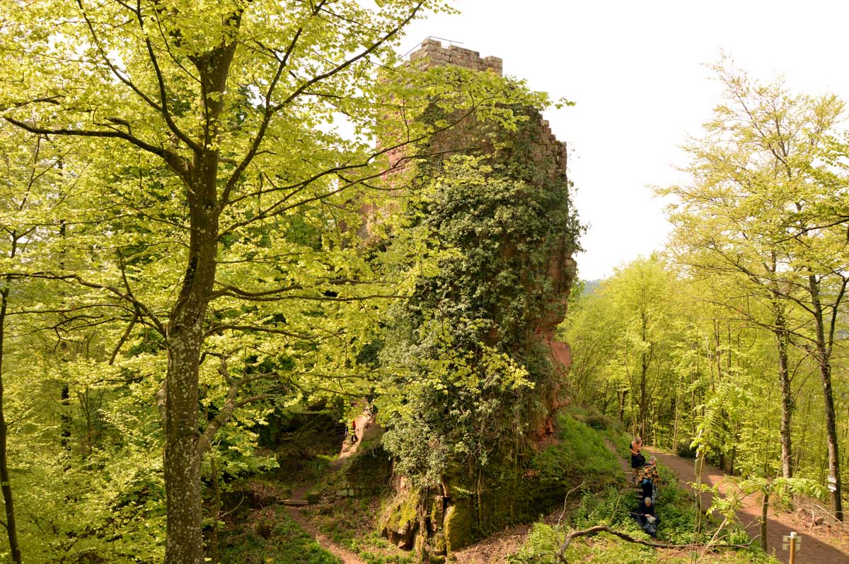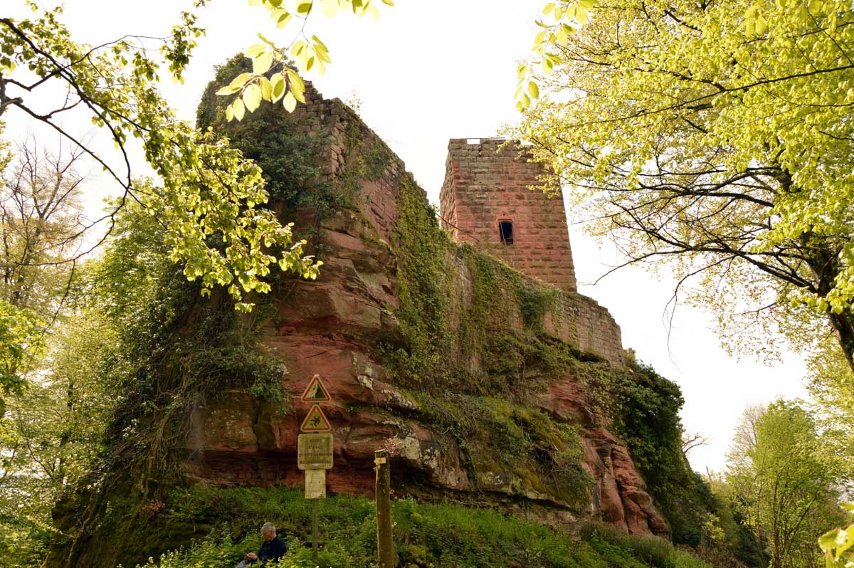 Et voici déjà, ou enfin (selon l’état des estomacs et des maux de tête) notre quatrième et dernière vraie montée du jour, jusqu’au château du Grand Arnsbourg. Enfin on s’entend, ici quand on parle de château, c’est un gros rocher, quelques restes de murs, qu’on pourrait croire construits vite fait pour amuser les randonneurs. Mais non, érigé vers le 13ème siècle, il a été détruit pendant la Guerre de Trente Ans, et aujourd’hui, il est fermé aux marcheurs. Mais on l’aime bien quand même.