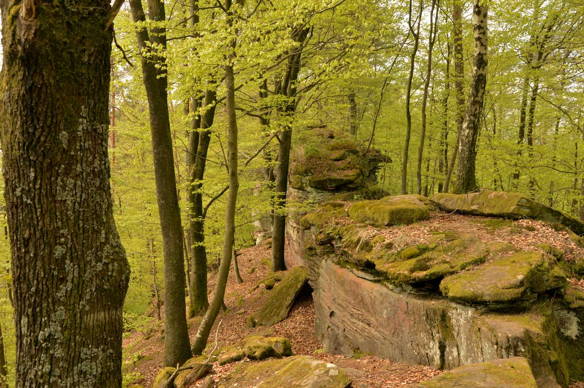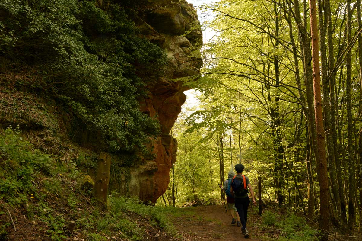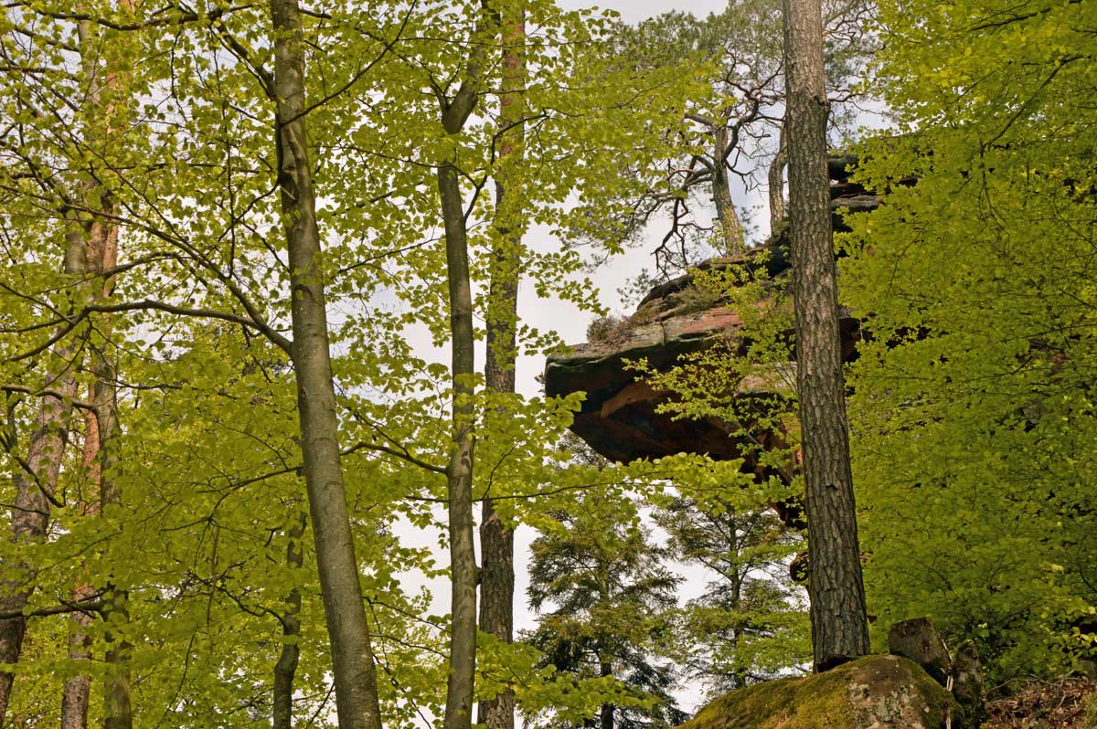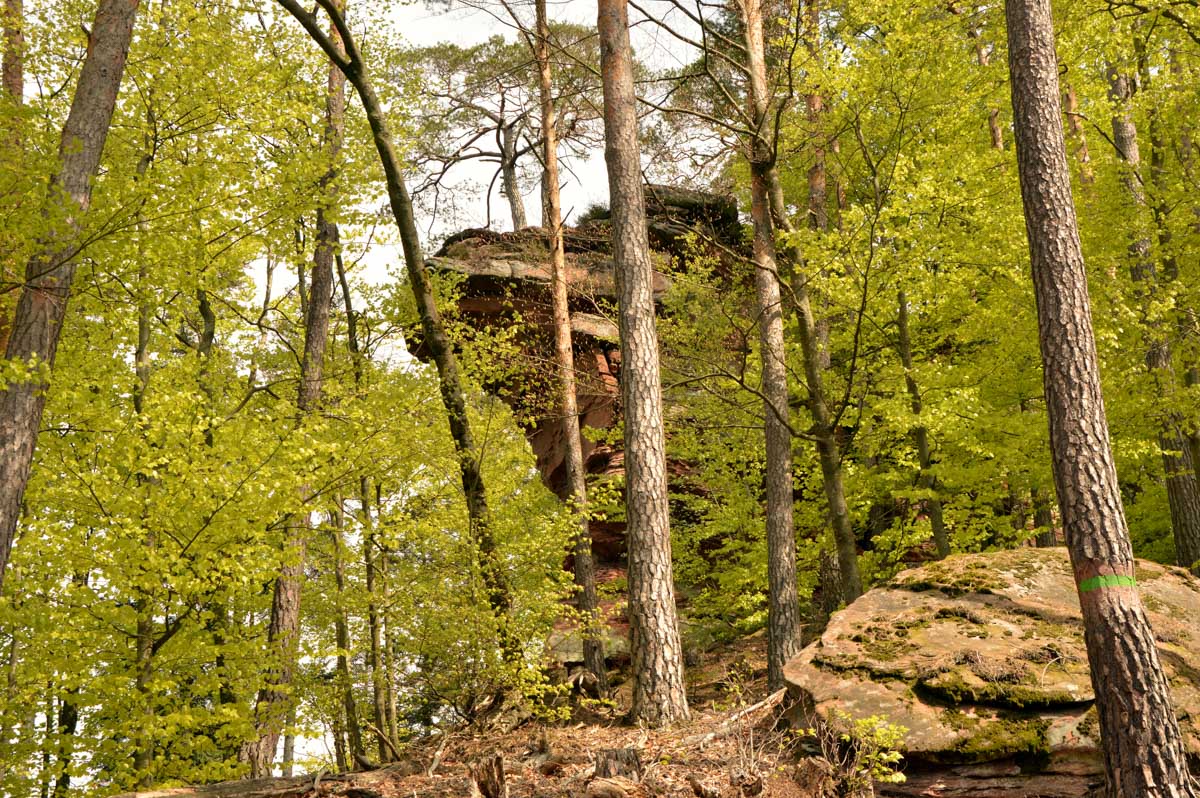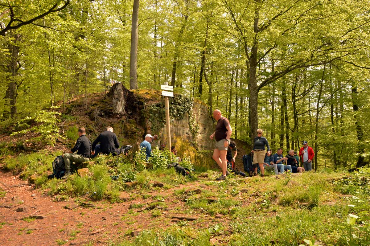 Et voici déjà, ou enfin (selon l’état des estomacs et des maux de tête) notre quatrième et dernière vraie montée du jour, jusqu’au château du Grand Arnsbourg. Enfin on s’entend, ici quand on parle de château, c’est un gros rocher, quelques restes de murs, qu’on pourrait croire construits vite fait pour amuser les randonneurs. Mais non, érigé vers le 13ème siècle, il a été détruit pendant la Guerre de Trente Ans, et aujourd’hui, il est fermé aux marcheurs. Mais on l’aime bien quand même.