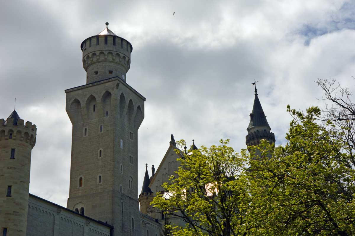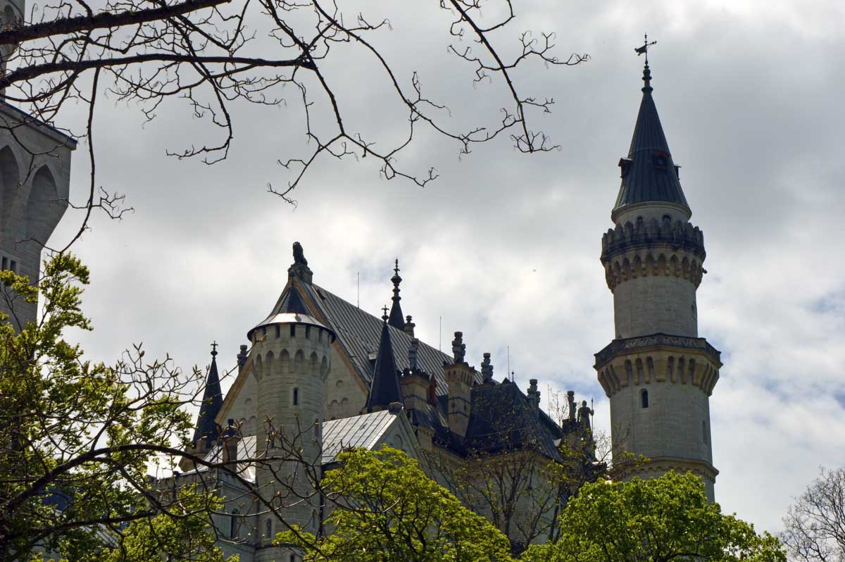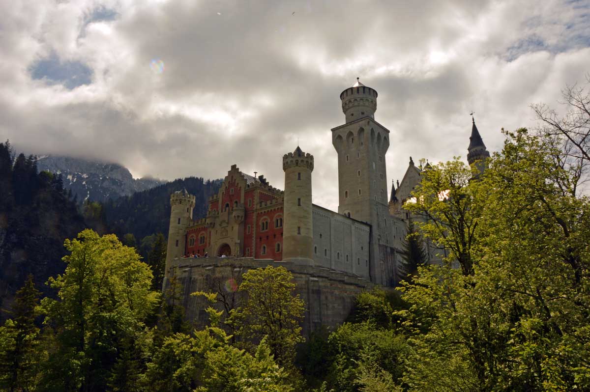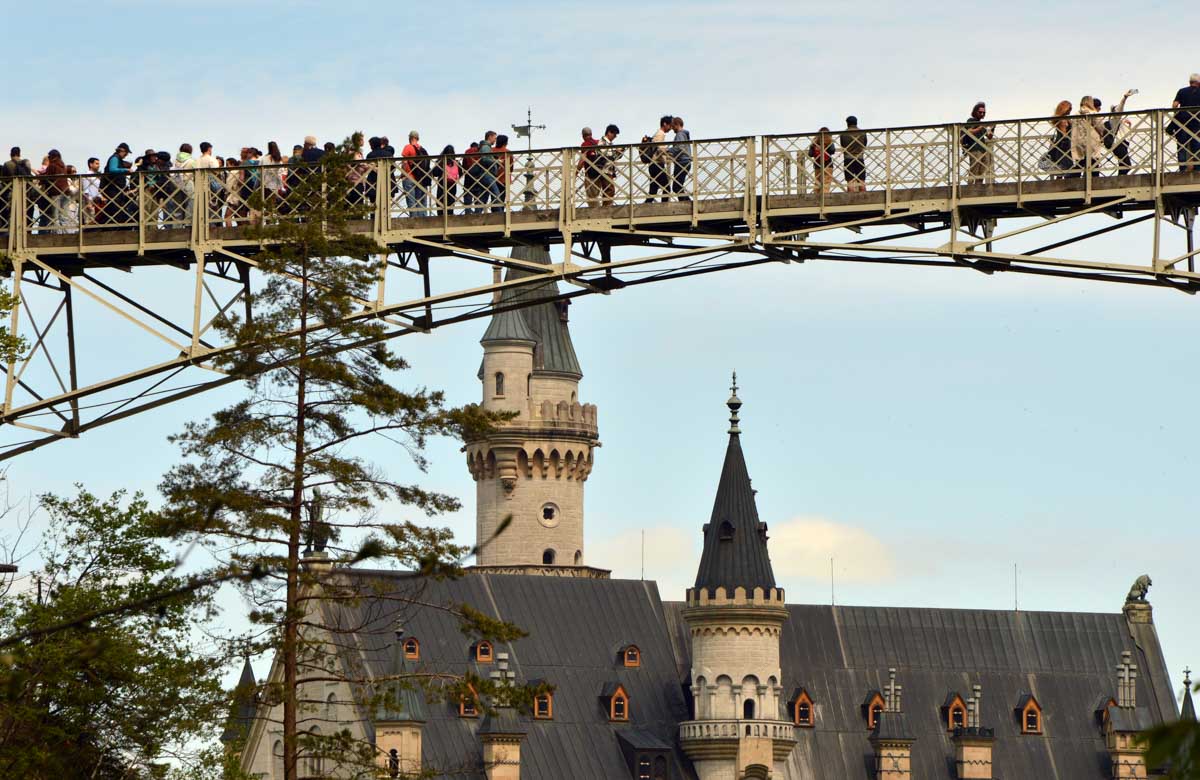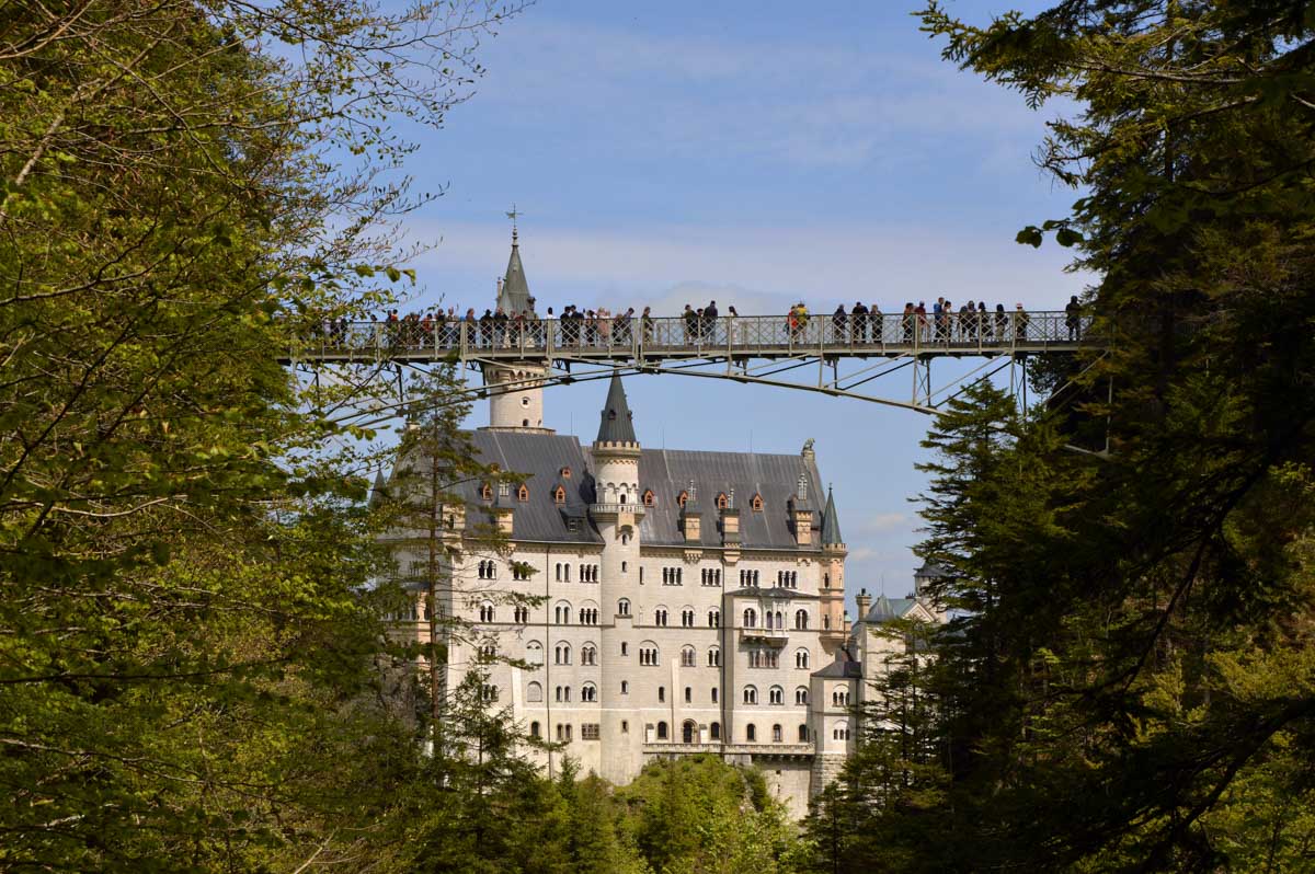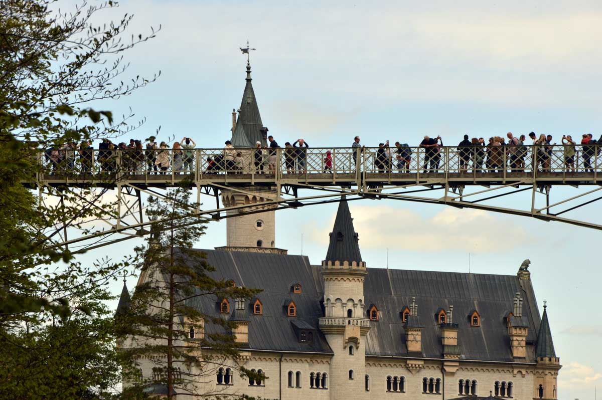 Nous parcourûmes donc le sentier en balcon depuis Füssen jusqu’au très beau Alpsee, pour nous trouver mêlés aux touristes, alors que nous on est des randonneurs. Histoire de grimper sans savoir pourquoi (comme d’hab’) et de faire la queue pour nous poster sur la Maria-Brücke. Inutile de te préciser qu’y en a qui ont cru utile de le baptiser le Pont du Diable. D’un côté t’as le torrent tout là en bas, au moins des centaines de mètres, et de l’autre, oh la vache ! Oh le machin ! Tu te prends le Neuschwanstein dans la figure ! Ouah ! La Belle au Bois Dormant peut se rendormir, Cendrillon peut retourner au bal et Blanche-Neige peut aller convoiter le huitième nain et accoucher du neuvième, nous on a le vrai truc en vue. Construit entre 1869 et 1886, romantique en plein, moi je me serais bien imaginée y habiter. Depuis ma tour, je scruterais à la jumelle les prétendants qui me prétendraient en shorts en cuir.