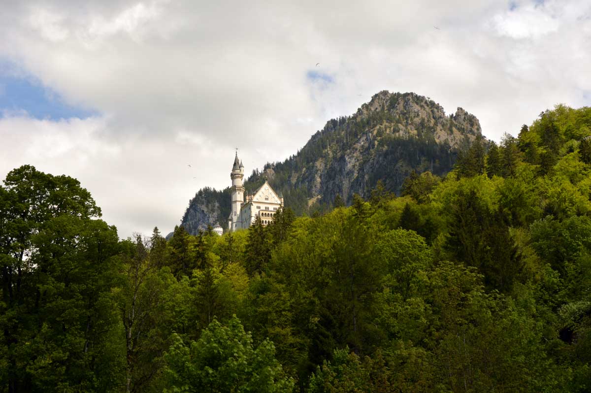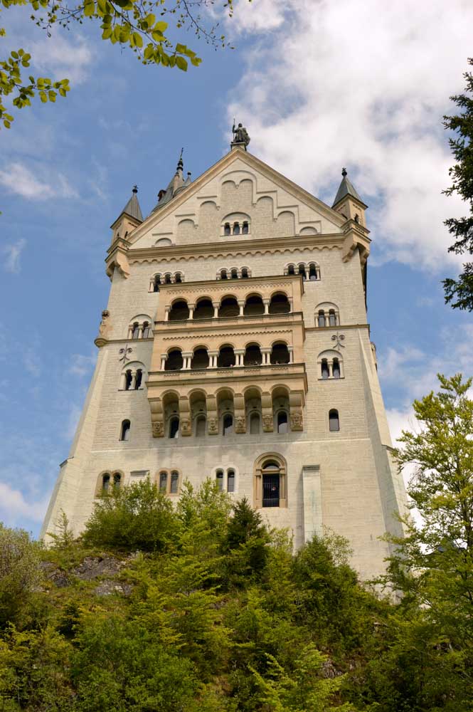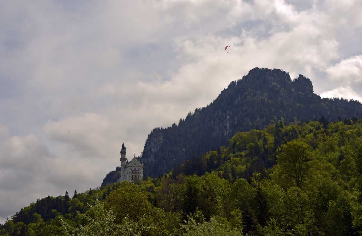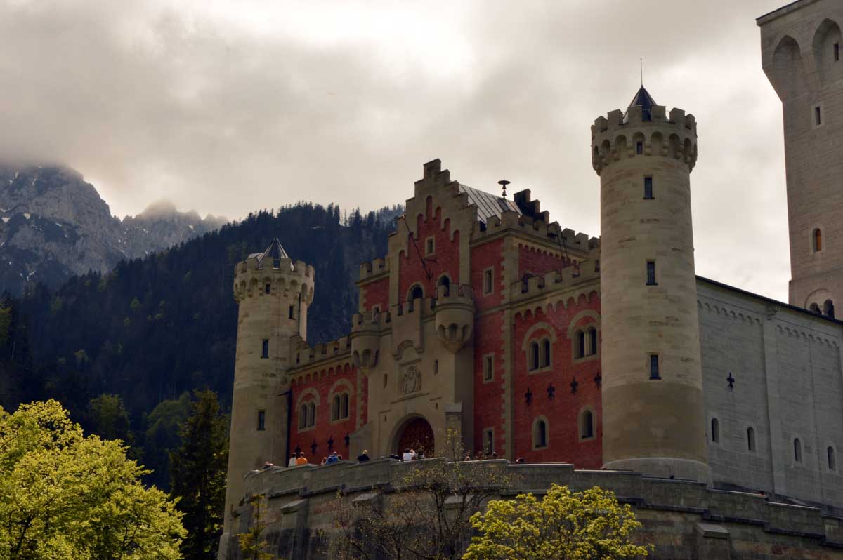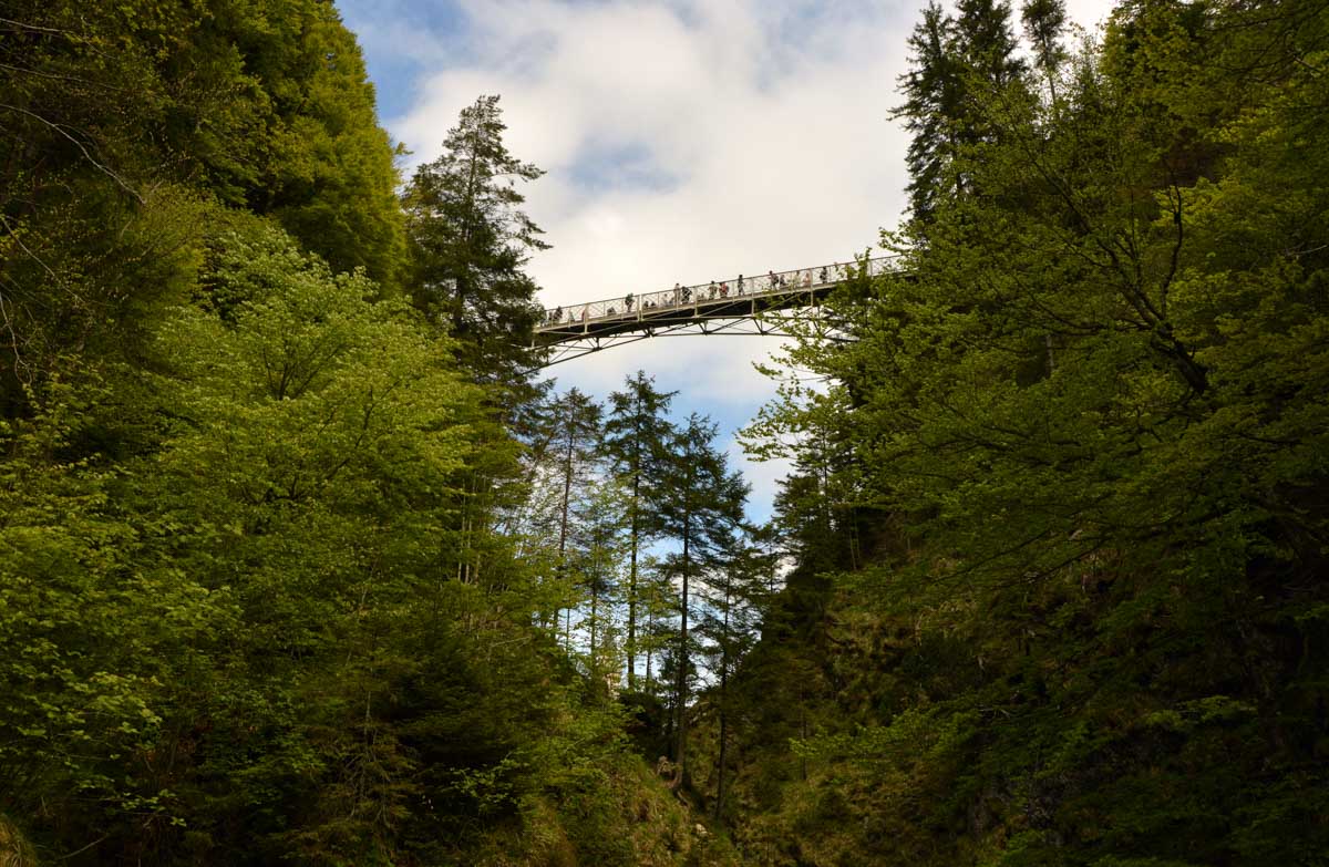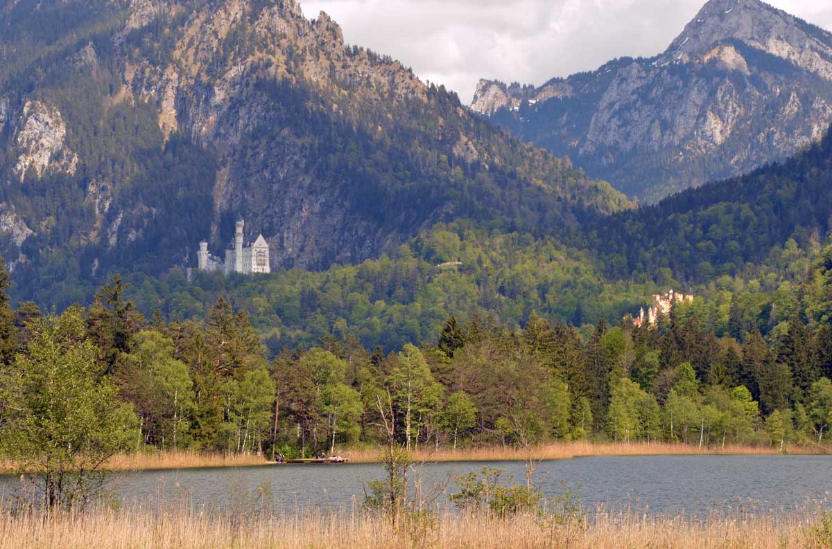 Nous parcourûmes donc le sentier en balcon depuis Füssen jusqu’au très beau Alpsee, pour nous trouver mêlés aux touristes, alors que nous on est des randonneurs. Histoire de grimper sans savoir pourquoi (comme d’hab’) et de faire la queue pour nous poster sur la Maria-Brücke. Inutile de te préciser qu’y en a qui ont cru utile de le baptiser le Pont du Diable. D’un côté t’as le torrent tout là en bas, au moins des centaines de mètres, et de l’autre, oh la vache ! Oh le machin ! Tu te prends le Neuschwanstein dans la figure ! Ouah ! La Belle au Bois Dormant peut se rendormir, Cendrillon peut retourner au bal et Blanche-Neige peut aller convoiter le huitième nain et accoucher du neuvième, nous on a le vrai truc en vue. Construit entre 1869 et 1886, romantique en plein, moi je me serais bien imaginée y habiter. Depuis ma tour, je scruterais à la jumelle les prétendants qui me prétendraient en shorts en cuir.