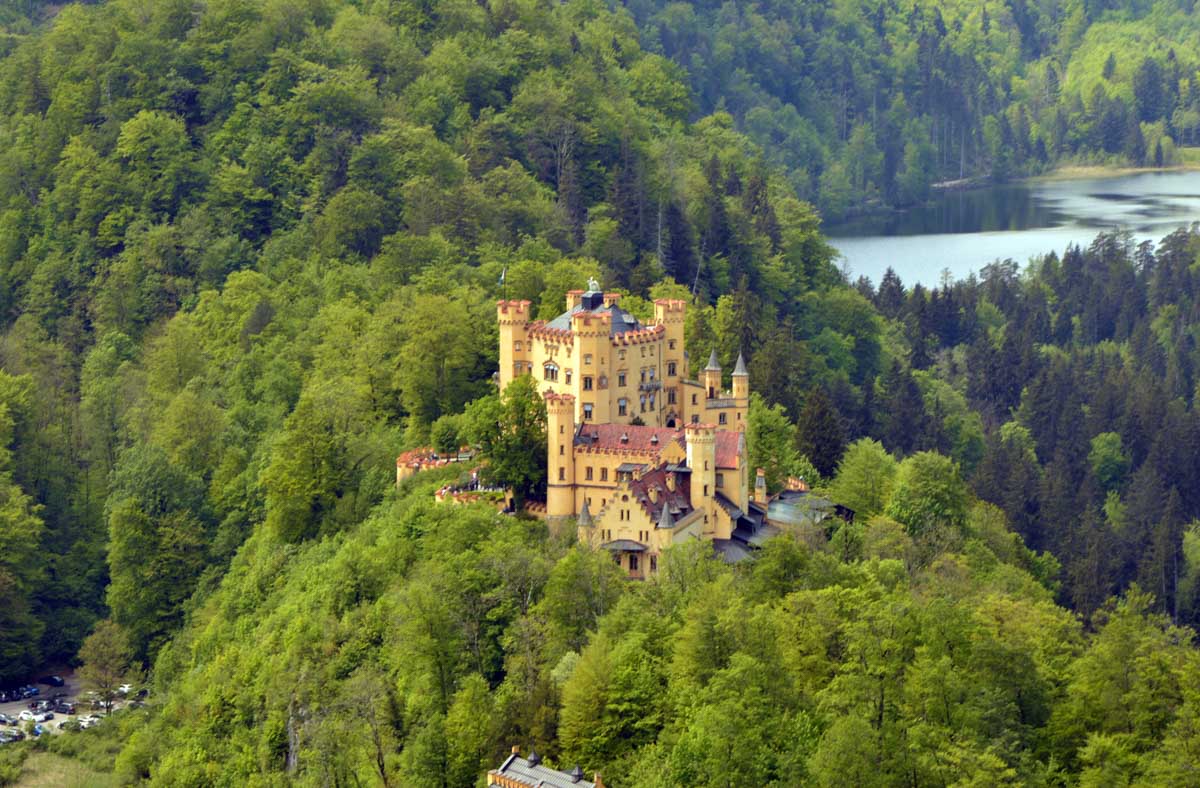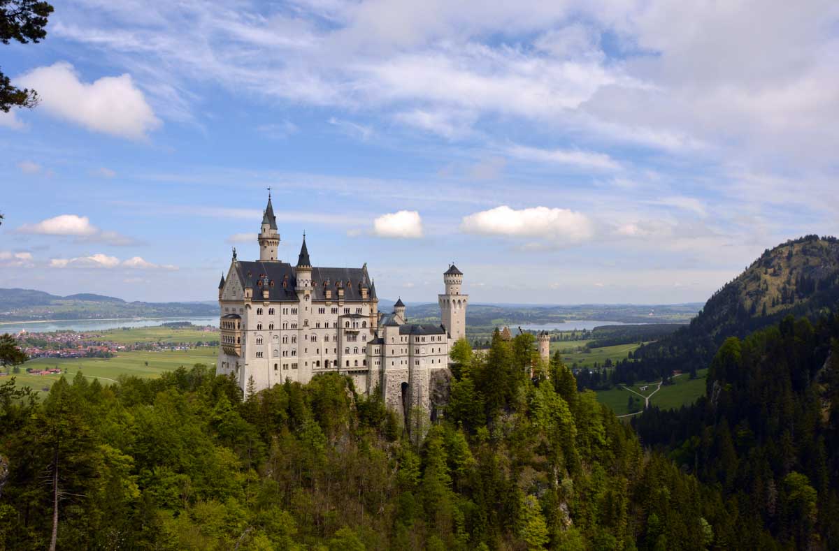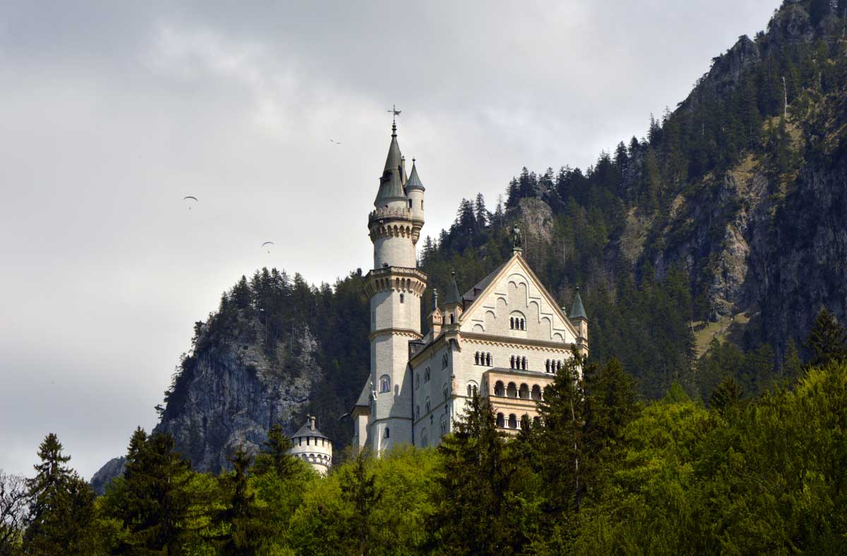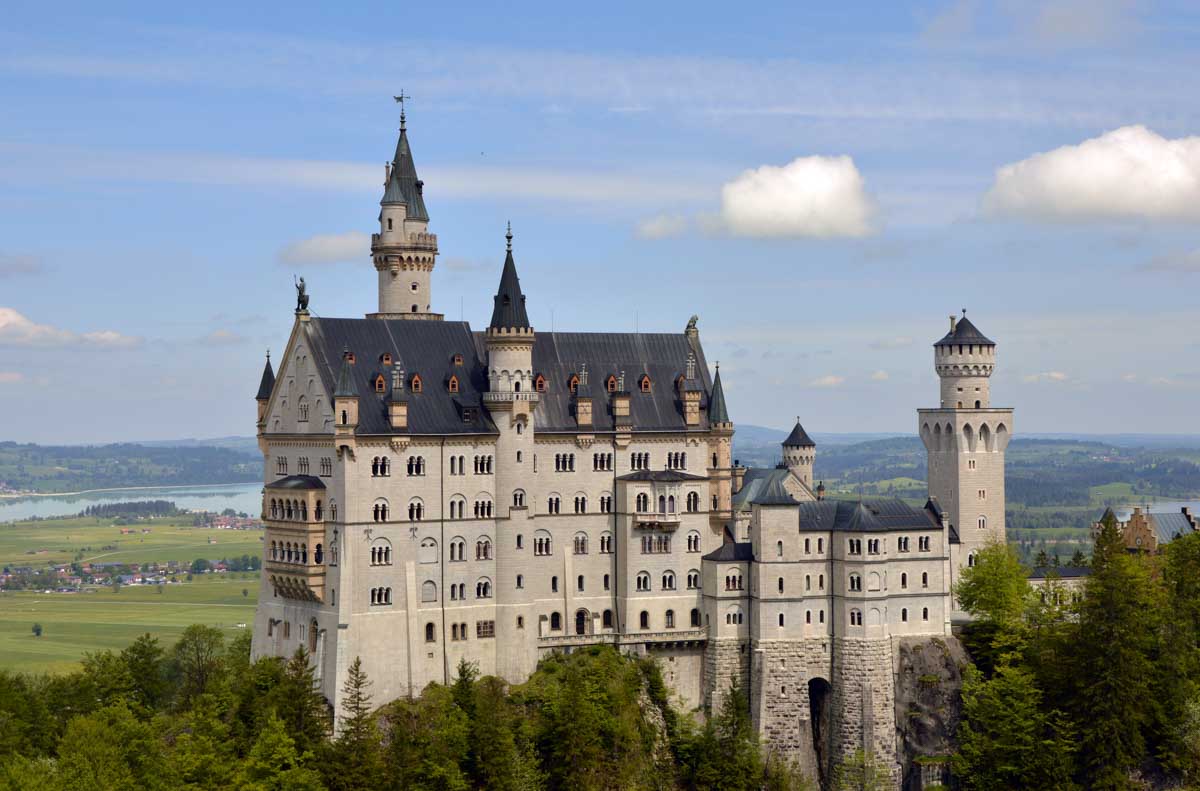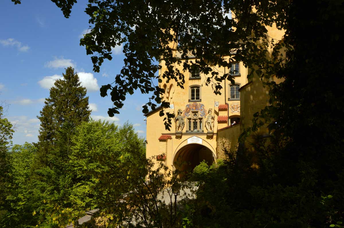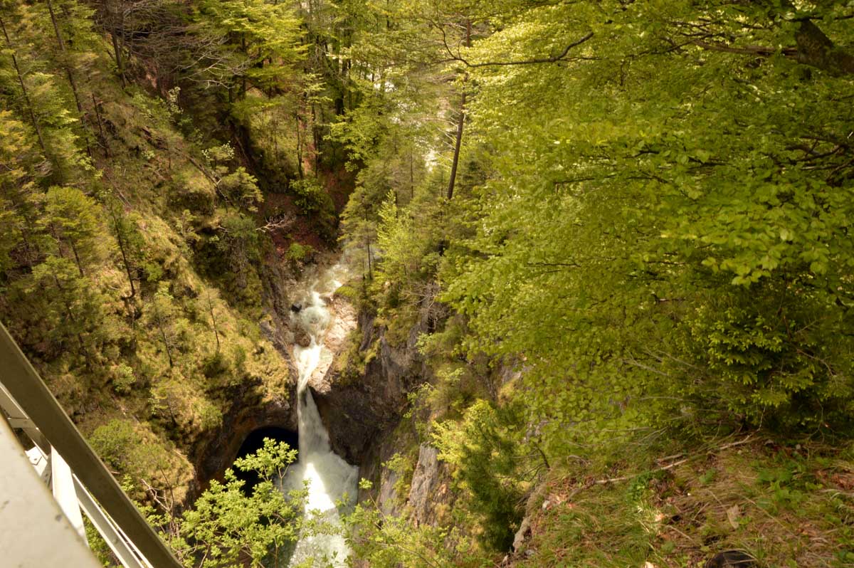 Nous parcourûmes donc le sentier en balcon depuis Füssen jusqu’au très beau Alpsee, pour nous trouver mêlés aux touristes, alors que nous on est des randonneurs. Histoire de grimper sans savoir pourquoi (comme d’hab’) et de faire la queue pour nous poster sur la Maria-Brücke. Inutile de te préciser qu’y en a qui ont cru utile de le baptiser le Pont du Diable. D’un côté t’as le torrent tout là en bas, au moins des centaines de mètres, et de l’autre, oh la vache ! Oh le machin ! Tu te prends le Neuschwanstein dans la figure ! Ouah ! La Belle au Bois Dormant peut se rendormir, Cendrillon peut retourner au bal et Blanche-Neige peut aller convoiter le huitième nain et accoucher du neuvième, nous on a le vrai truc en vue. Construit entre 1869 et 1886, romantique en plein, moi je me serais bien imaginée y habiter. Depuis ma tour, je scruterais à la jumelle les prétendants qui me prétendraient en shorts en cuir.