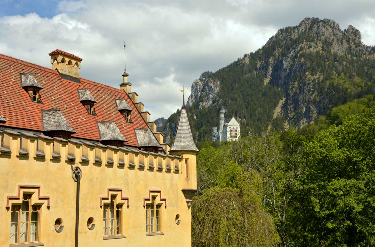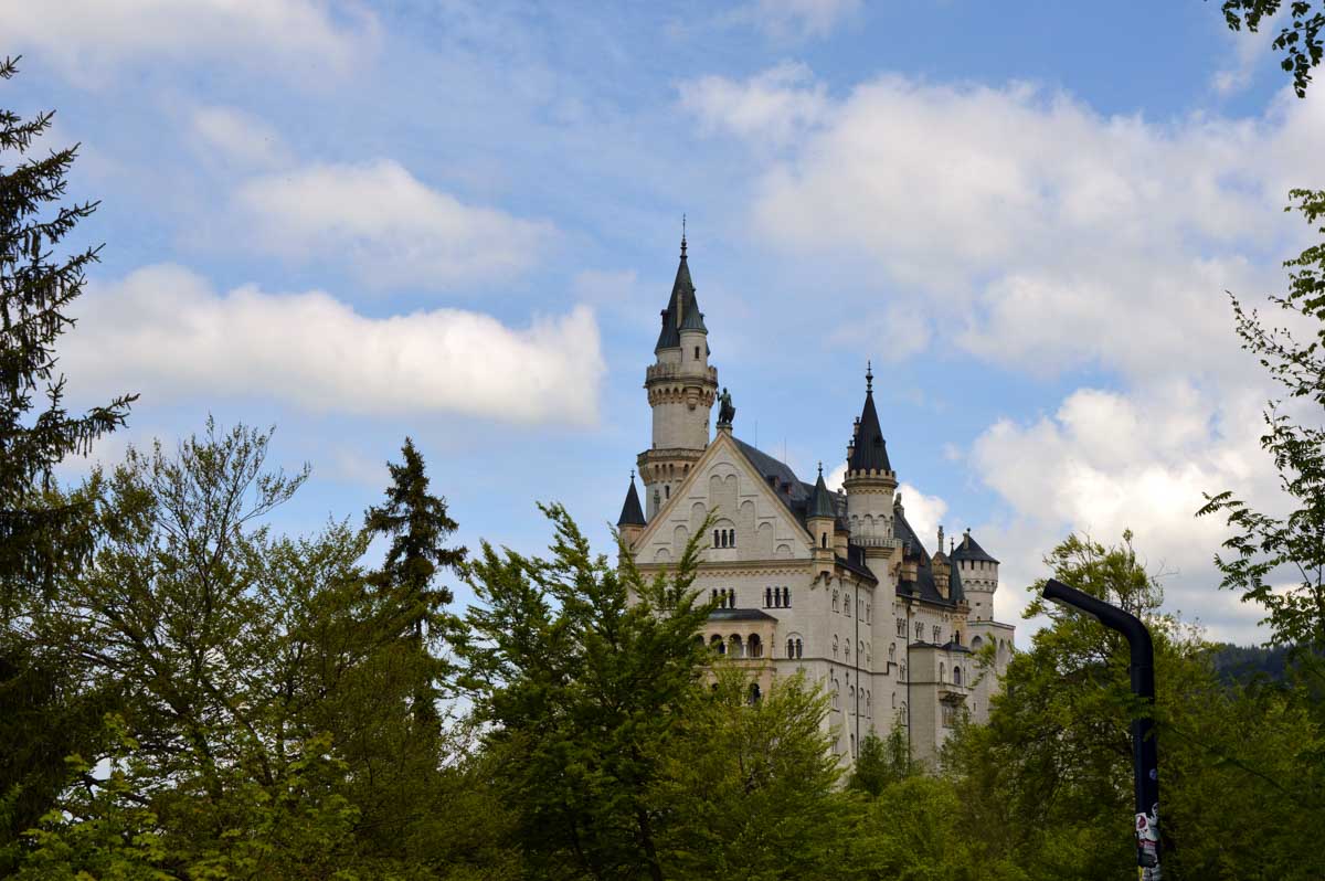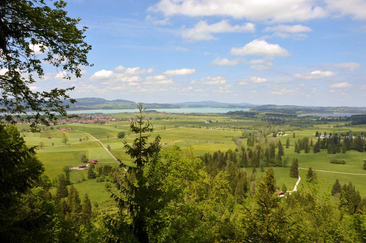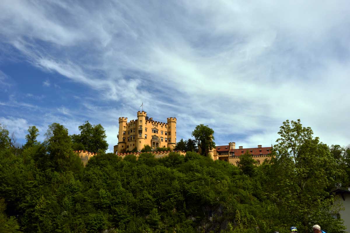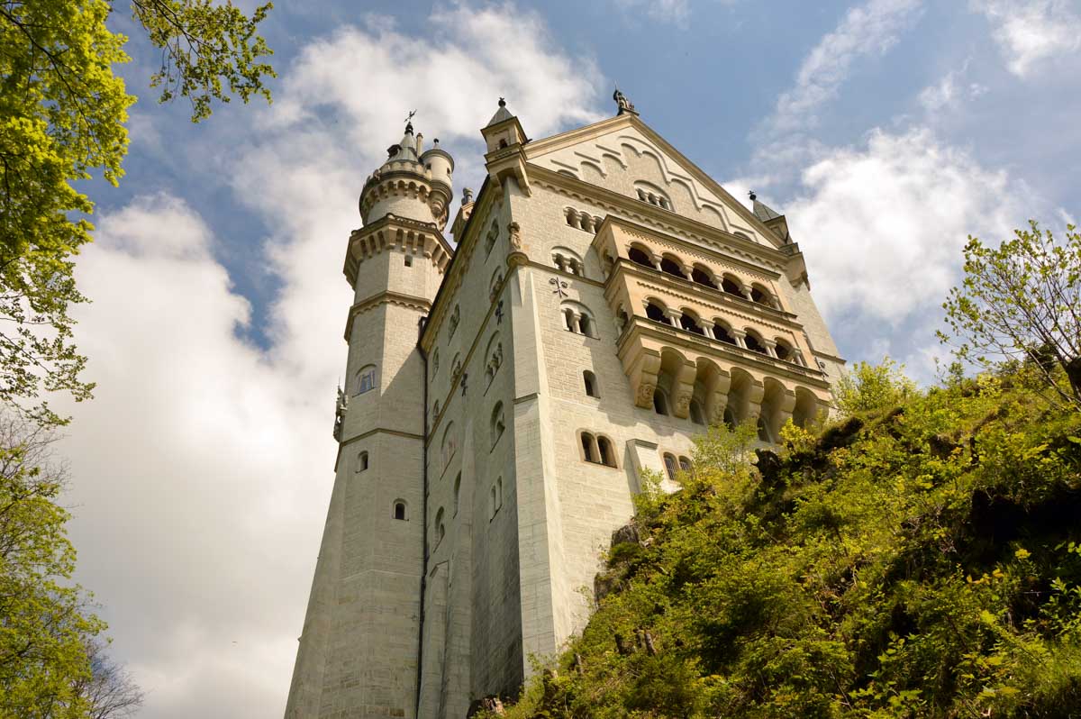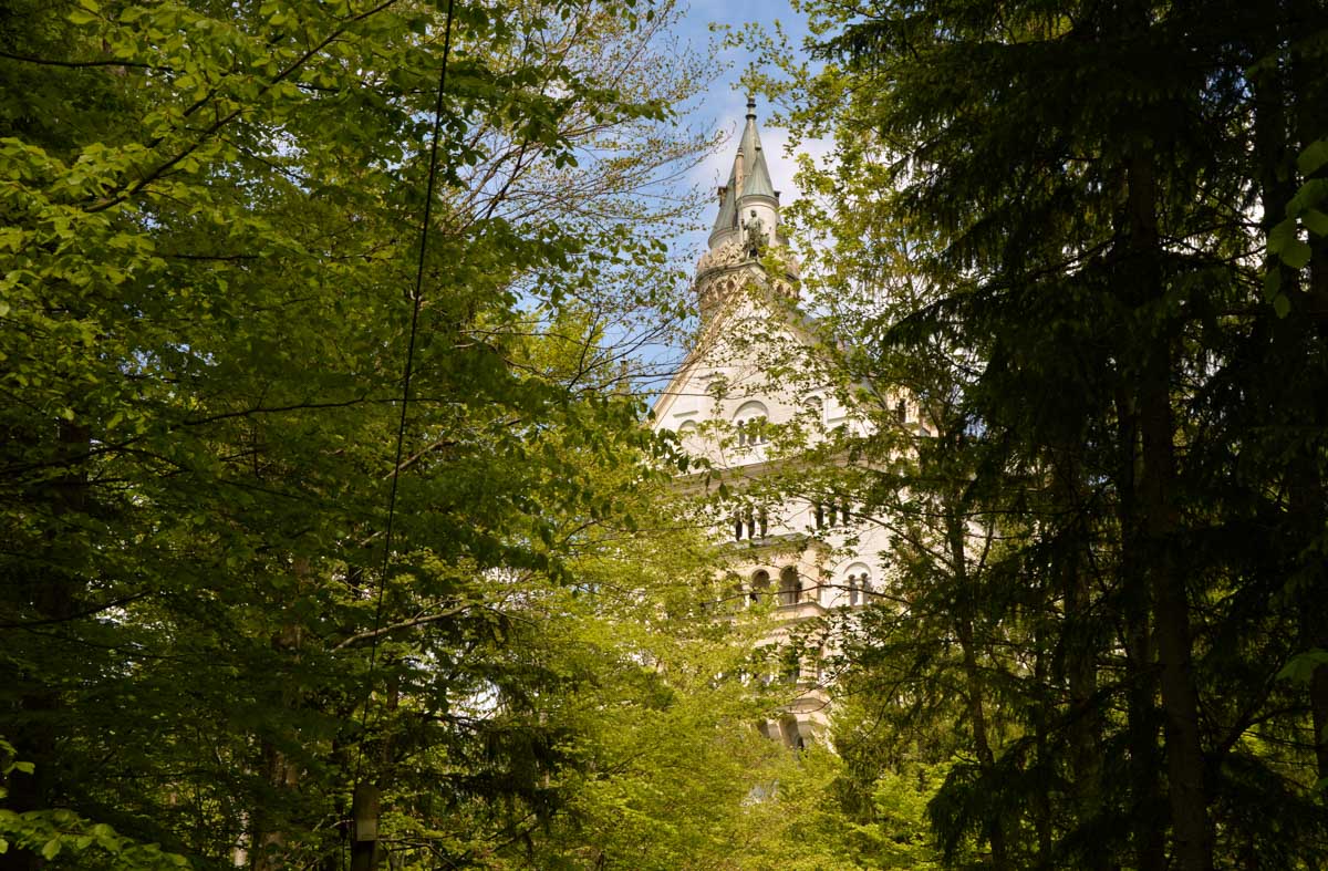 Nous parcourûmes donc le sentier en balcon depuis Füssen jusqu’au très beau Alpsee, pour nous trouver mêlés aux touristes, alors que nous on est des randonneurs. Histoire de grimper sans savoir pourquoi (comme d’hab’) et de faire la queue pour nous poster sur la Maria-Brücke. Inutile de te préciser qu’y en a qui ont cru utile de le baptiser le Pont du Diable. D’un côté t’as le torrent tout là en bas, au moins des centaines de mètres, et de l’autre, oh la vache ! Oh le machin ! Tu te prends le Neuschwanstein dans la figure ! Ouah ! La Belle au Bois Dormant peut se rendormir, Cendrillon peut retourner au bal et Blanche-Neige peut aller convoiter le huitième nain et accoucher du neuvième, nous on a le vrai truc en vue. Construit entre 1869 et 1886, romantique en plein, moi je me serais bien imaginée y habiter. Depuis ma tour, je scruterais à la jumelle les prétendants qui me prétendraient en shorts en cuir.