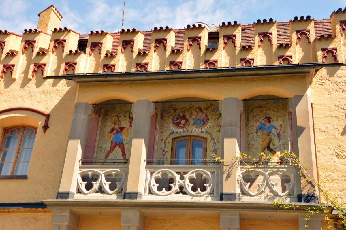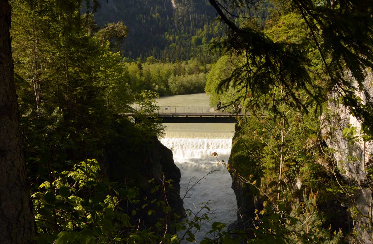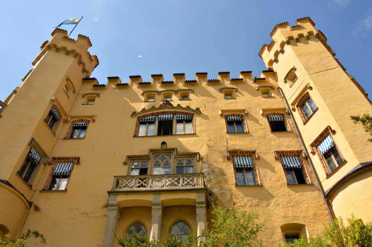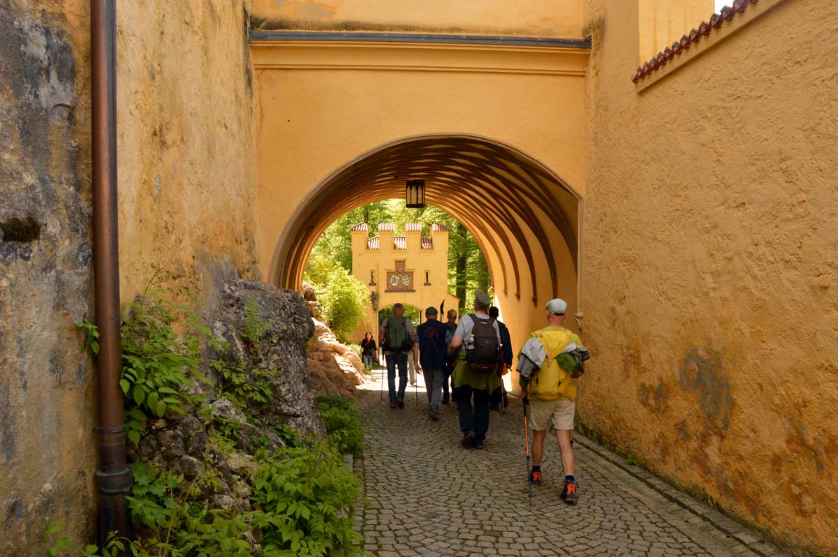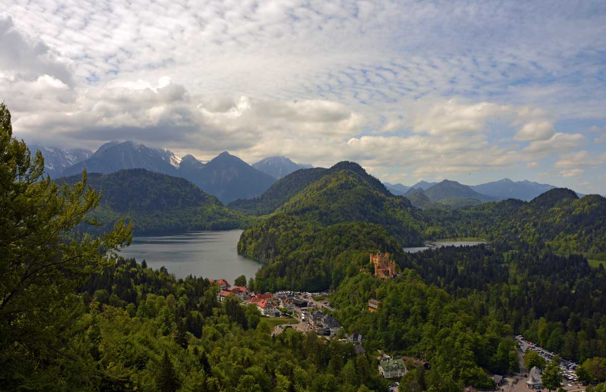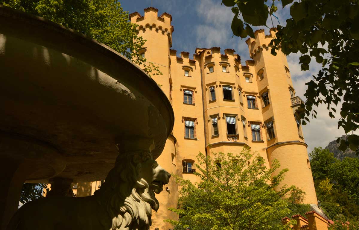 Nous parcourûmes donc le sentier en balcon depuis Füssen jusqu’au très beau Alpsee, pour nous trouver mêlés aux touristes, alors que nous on est des randonneurs. Histoire de grimper sans savoir pourquoi (comme d’hab’) et de faire la queue pour nous poster sur la Maria-Brücke. Inutile de te préciser qu’y en a qui ont cru utile de le baptiser le Pont du Diable. D’un côté t’as le torrent tout là en bas, au moins des centaines de mètres, et de l’autre, oh la vache ! Oh le machin ! Tu te prends le Neuschwanstein dans la figure ! Ouah ! La Belle au Bois Dormant peut se rendormir, Cendrillon peut retourner au bal et Blanche-Neige peut aller convoiter le huitième nain et accoucher du neuvième, nous on a le vrai truc en vue. Construit entre 1869 et 1886, romantique en plein, moi je me serais bien imaginée y habiter. Depuis ma tour, je scruterais à la jumelle les prétendants qui me prétendraient en shorts en cuir.