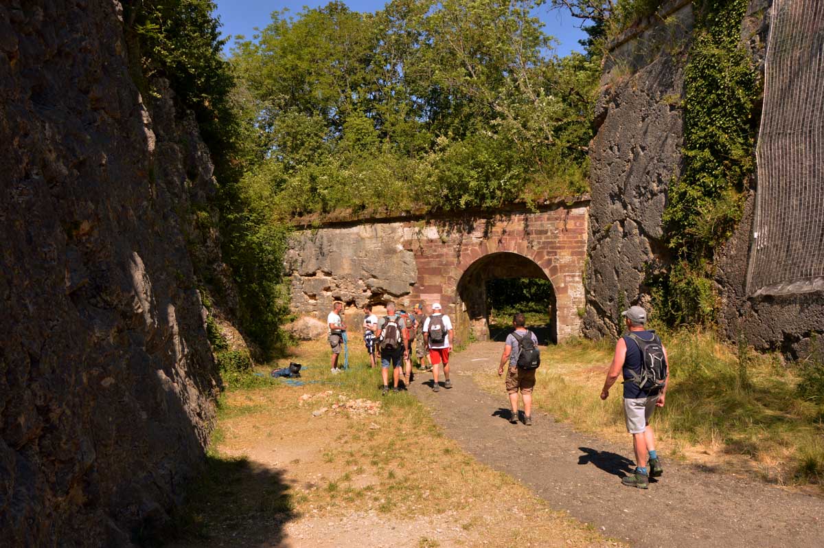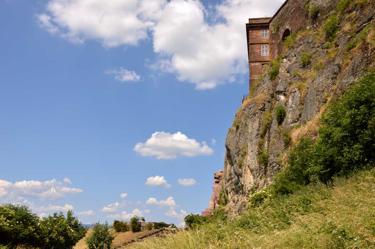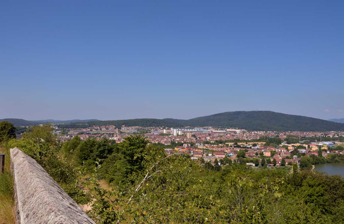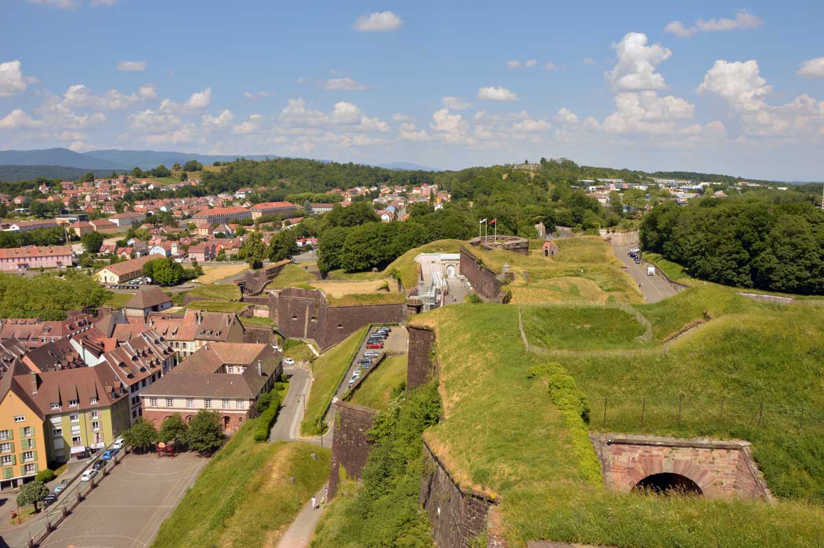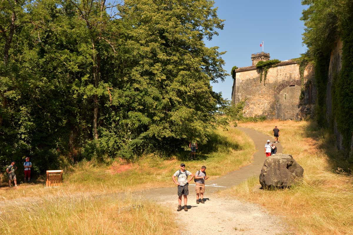 C’était chouette, alternance nature et ville, en commençant par la promenade à l’ombre vers le Fort de la Justice puis le Fort de la Miotte qui donnent le ton : Belfort se trouve dans sa fameuse trouée (alors qu’à Bâle ça s’appelle un trou, mais bon), qui permet le passage de la plaine du Rhin vers la Bourgogne, entre les Vosges, le Rhin et le Jura. La Miotte date des années 1830 et servait à défendre la Ville.