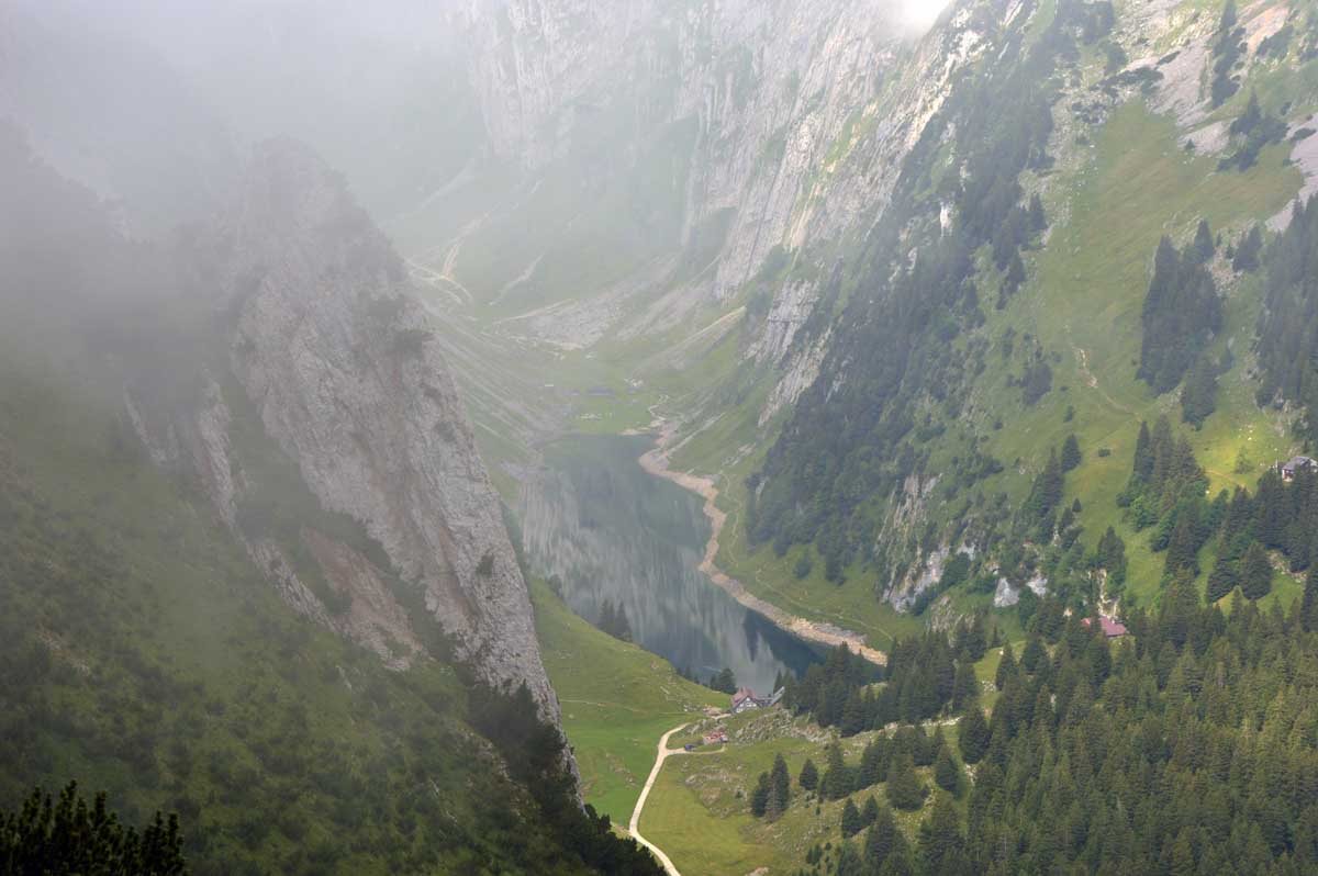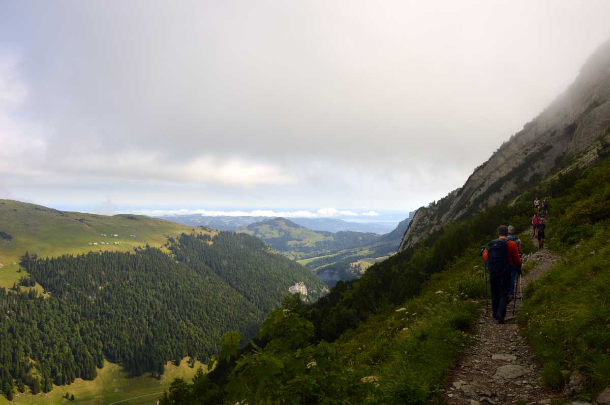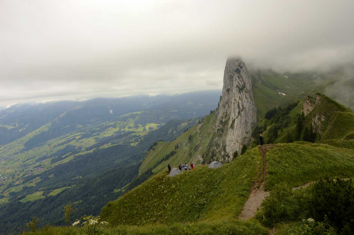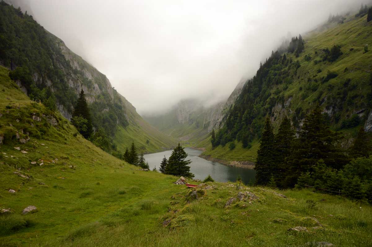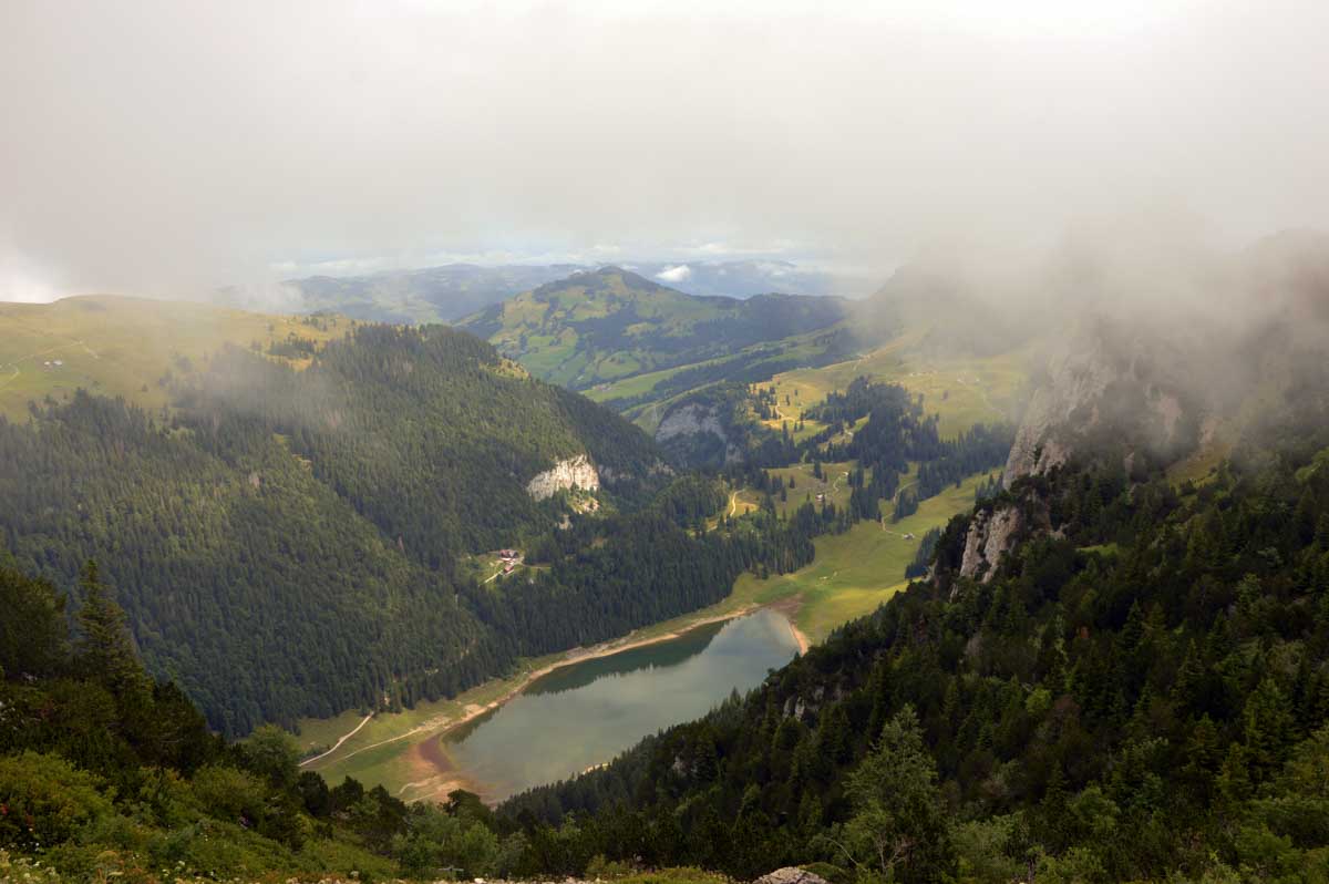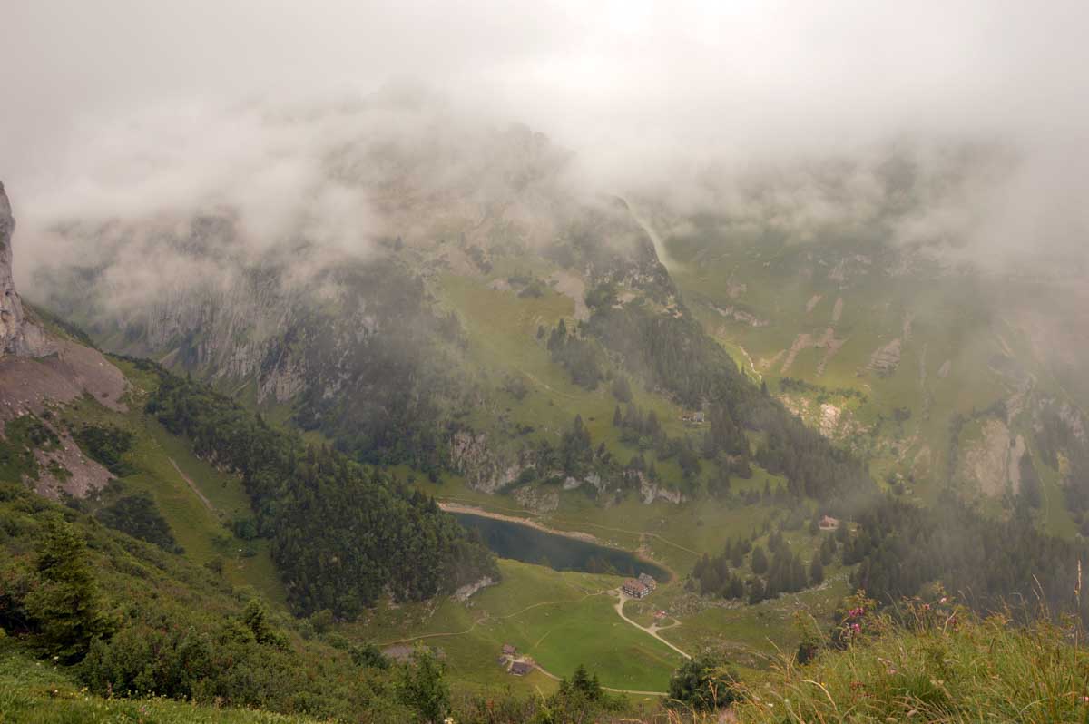 On dira ce qu’on voudra, le meilleur réveil c’est avec un café et la vue sur le Fahlensee depuis l’auberge du Bollenwees. Dont on allait s’éloigner, vers le haut évidemment, vers un nouveau col (j’les compte plus). Petite bruine, mais j’allais pas râler après deux jours de chaleur. A peine trois quarts d’heure plus tard, nous voilà au vertigineux Col du Saxerlücke avec la vue sur le Rhin, sur l’Autriche en face, et probablement même le Lichtenstein.