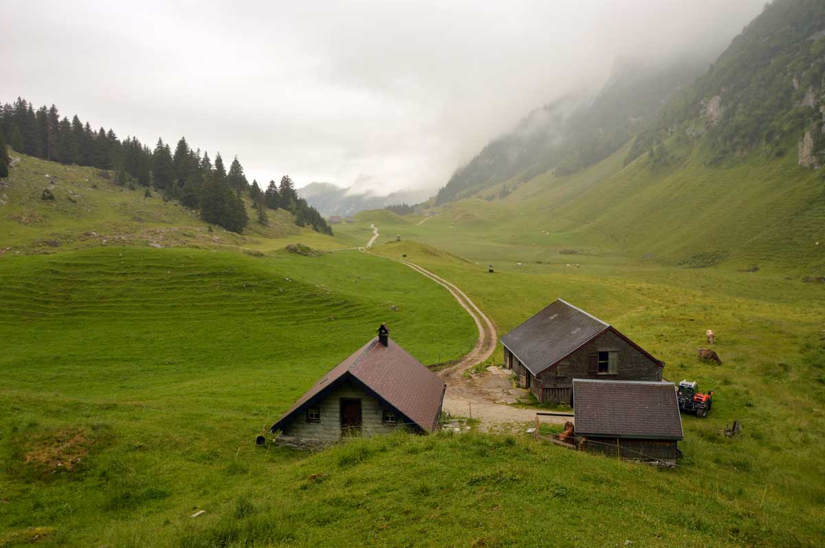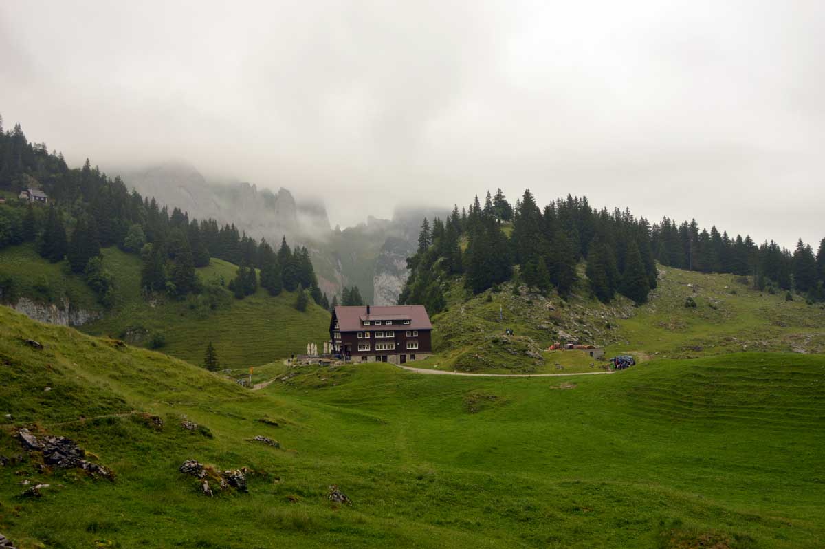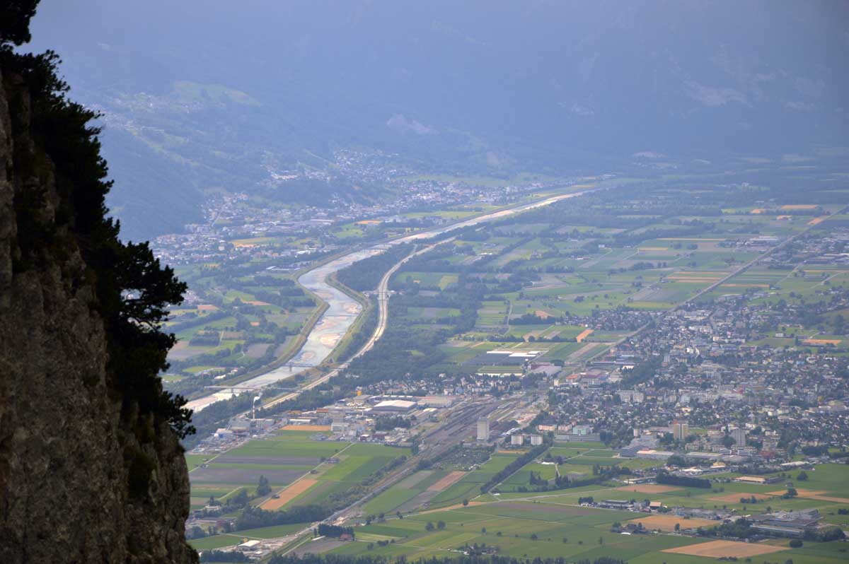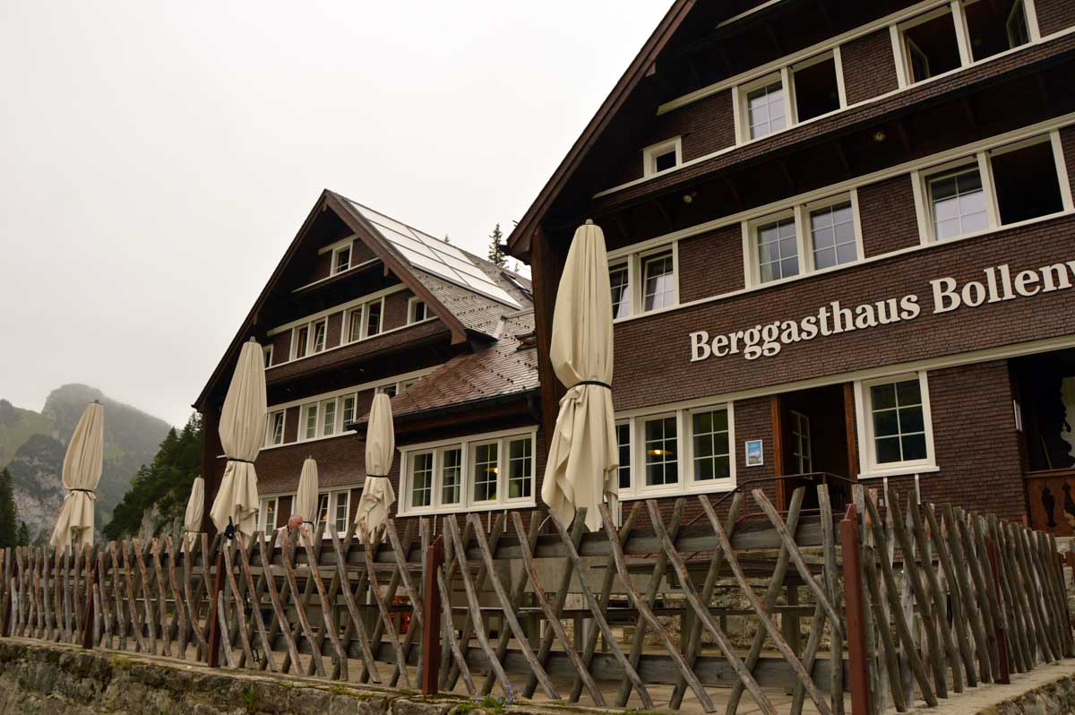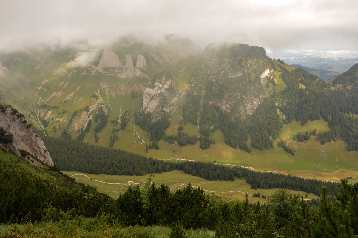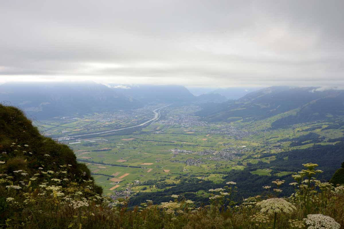 On dira ce qu’on voudra, le meilleur réveil c’est avec un café et la vue sur le Fahlensee depuis l’auberge du Bollenwees. Dont on allait s’éloigner, vers le haut évidemment, vers un nouveau col (j’les compte plus). Petite bruine, mais j’allais pas râler après deux jours de chaleur. A peine trois quarts d’heure plus tard, nous voilà au vertigineux Col du Saxerlücke avec la vue sur le Rhin, sur l’Autriche en face, et probablement même le Lichtenstein.
