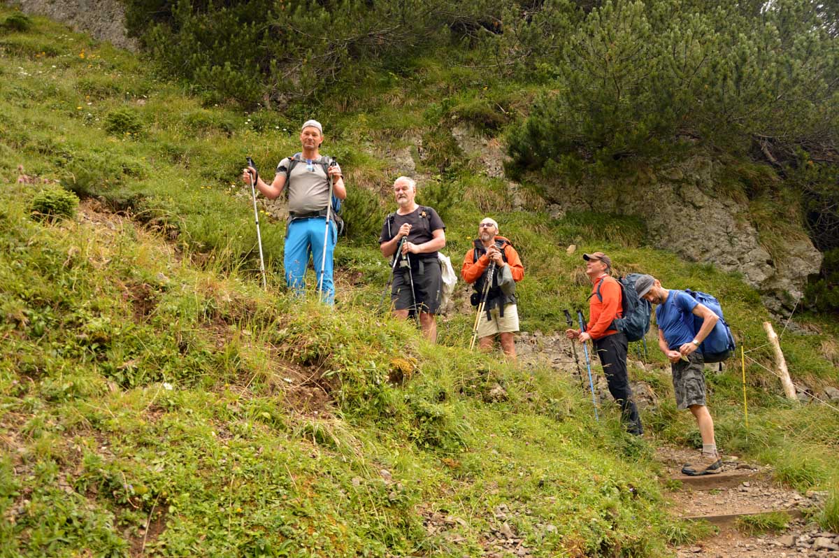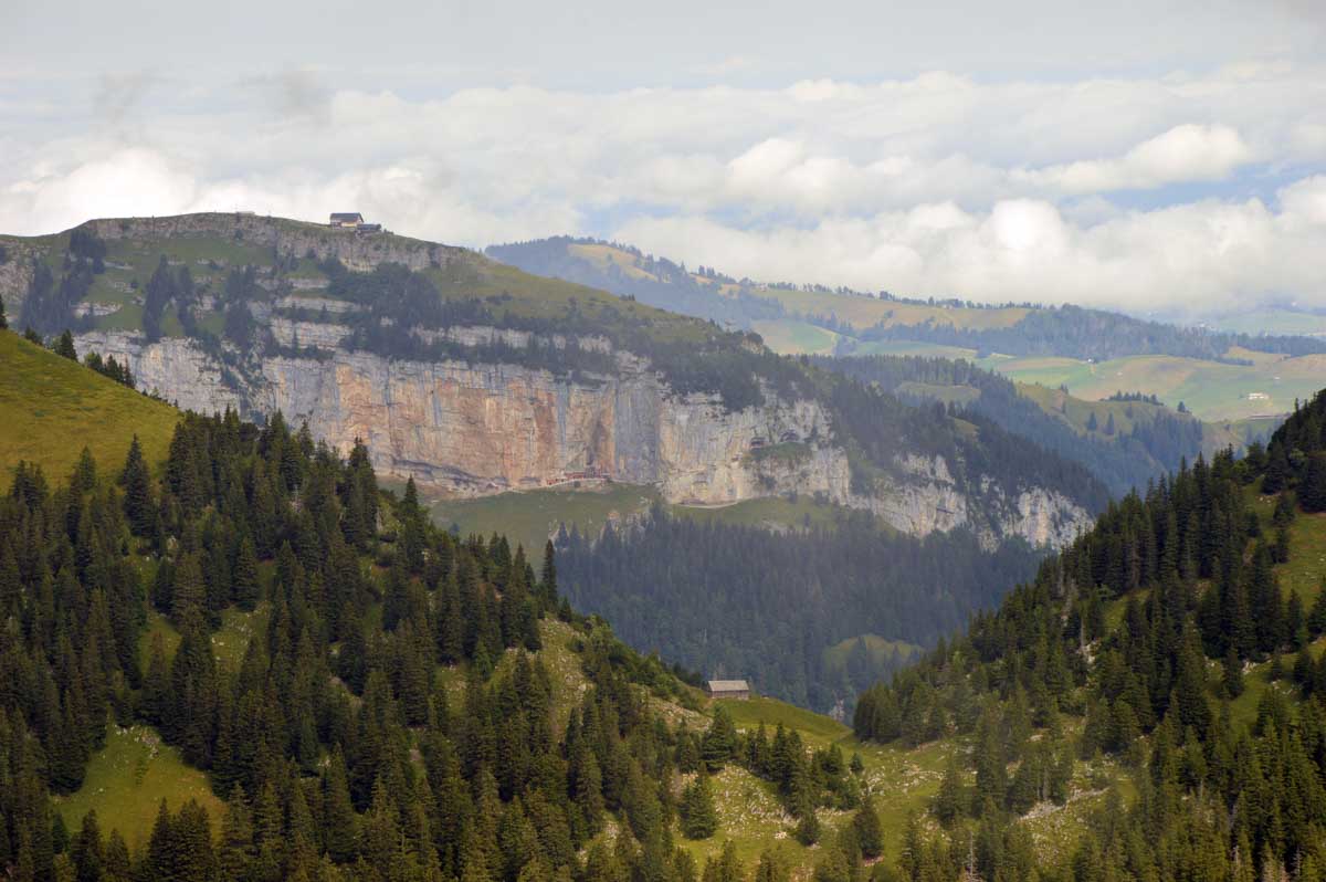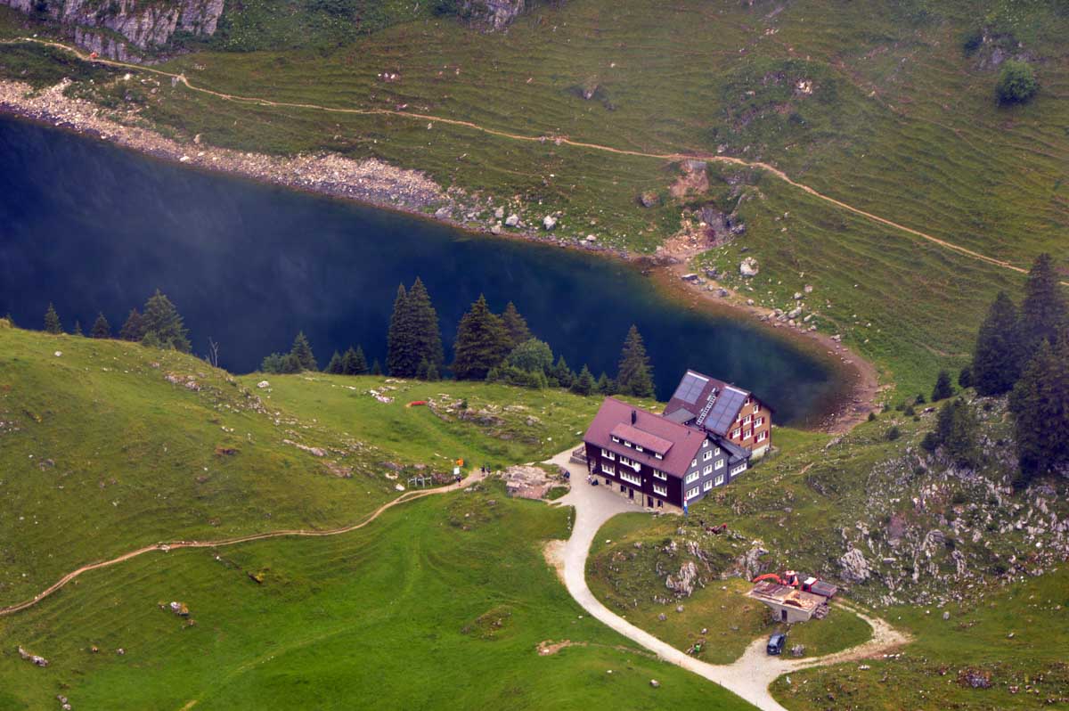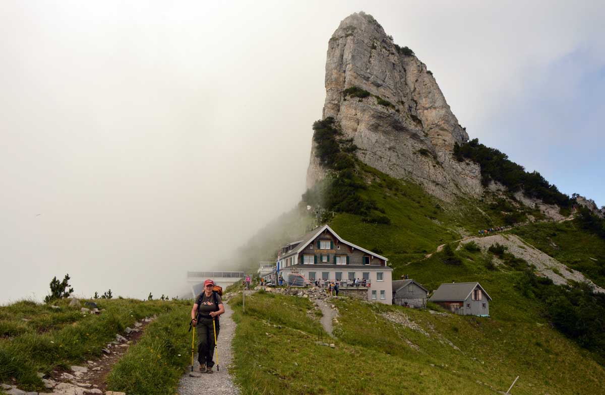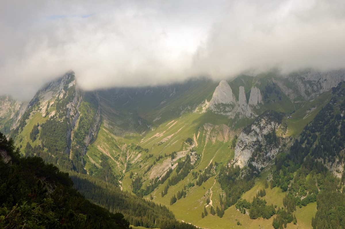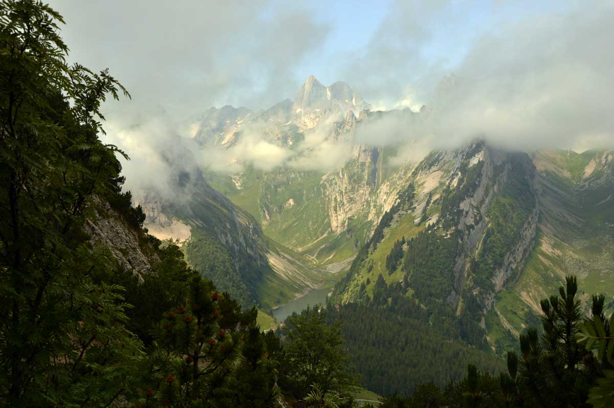 On dira ce qu’on voudra, le meilleur réveil c’est avec un café et la vue sur le Fahlensee depuis l’auberge du Bollenwees. Dont on allait s’éloigner, vers le haut évidemment, vers un nouveau col (j’les compte plus). Petite bruine, mais j’allais pas râler après deux jours de chaleur. A peine trois quarts d’heure plus tard, nous voilà au vertigineux Col du Saxerlücke avec la vue sur le Rhin, sur l’Autriche en face, et probablement même le Lichtenstein.