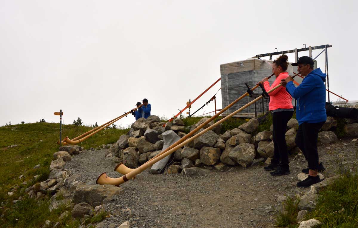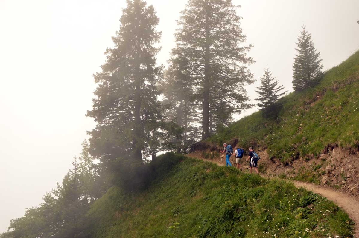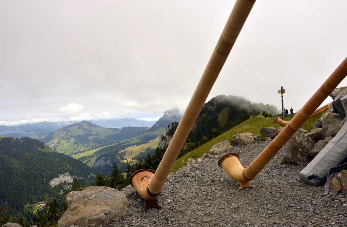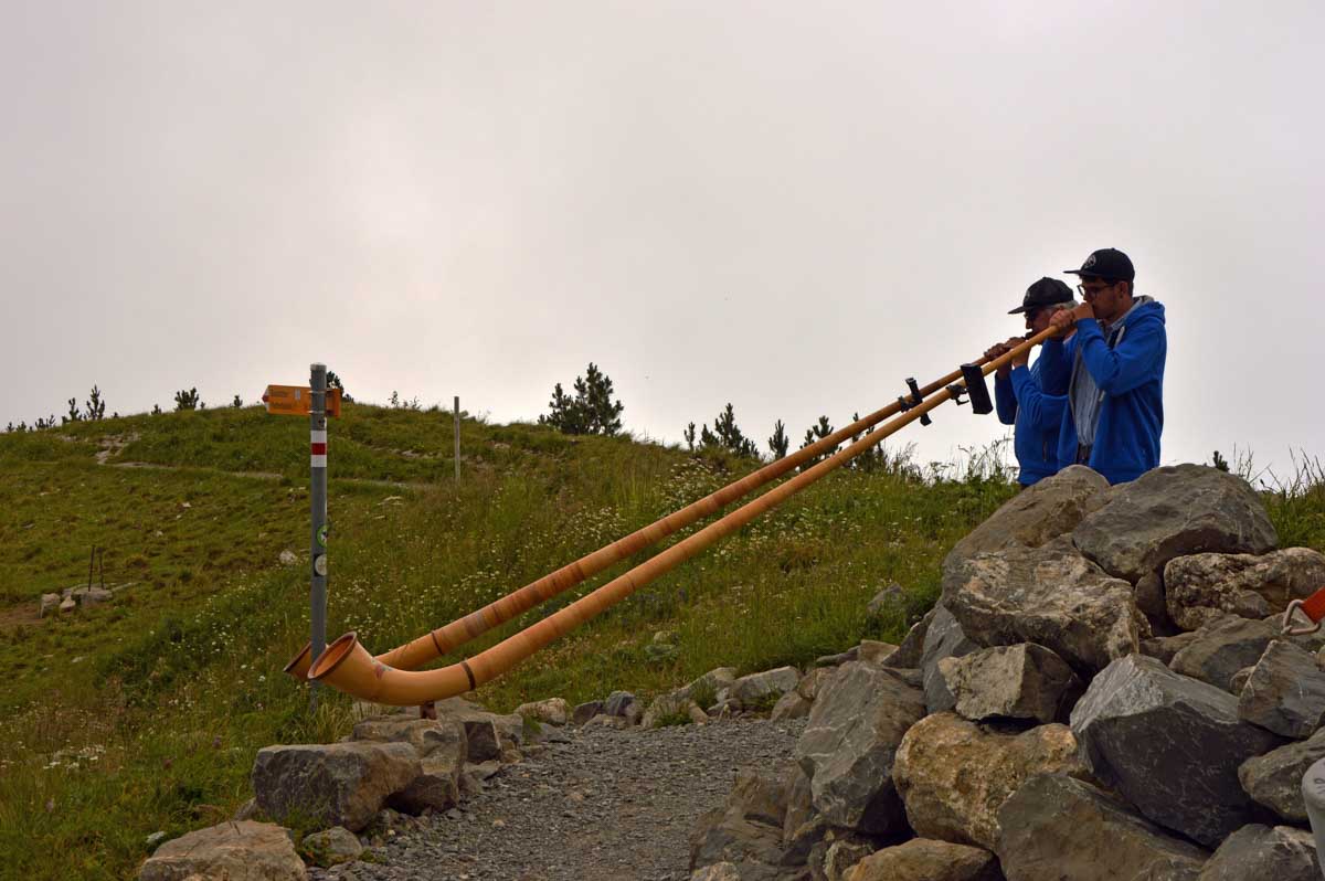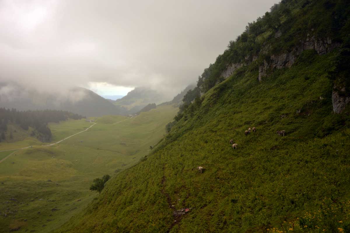 Explication : plusieurs orchestres de cors des Alpes s’étaient retrouvés là-haut en costumes ! Pour nous, déjeuner sur des bancs face à la vue sur le brouillard et puis direction le téléphérique. Oui parce que nous on grimpe à pied et on descend en cabine ! Tu verras quand tu y seras, tu feras pareil pour t’épargner la descente ! Encore un petit effort pour deux kilomètres jusqu’à Schwende dans des prés verts (rien à voir avec le poète) et voici venu le moment de changer de chaussures.