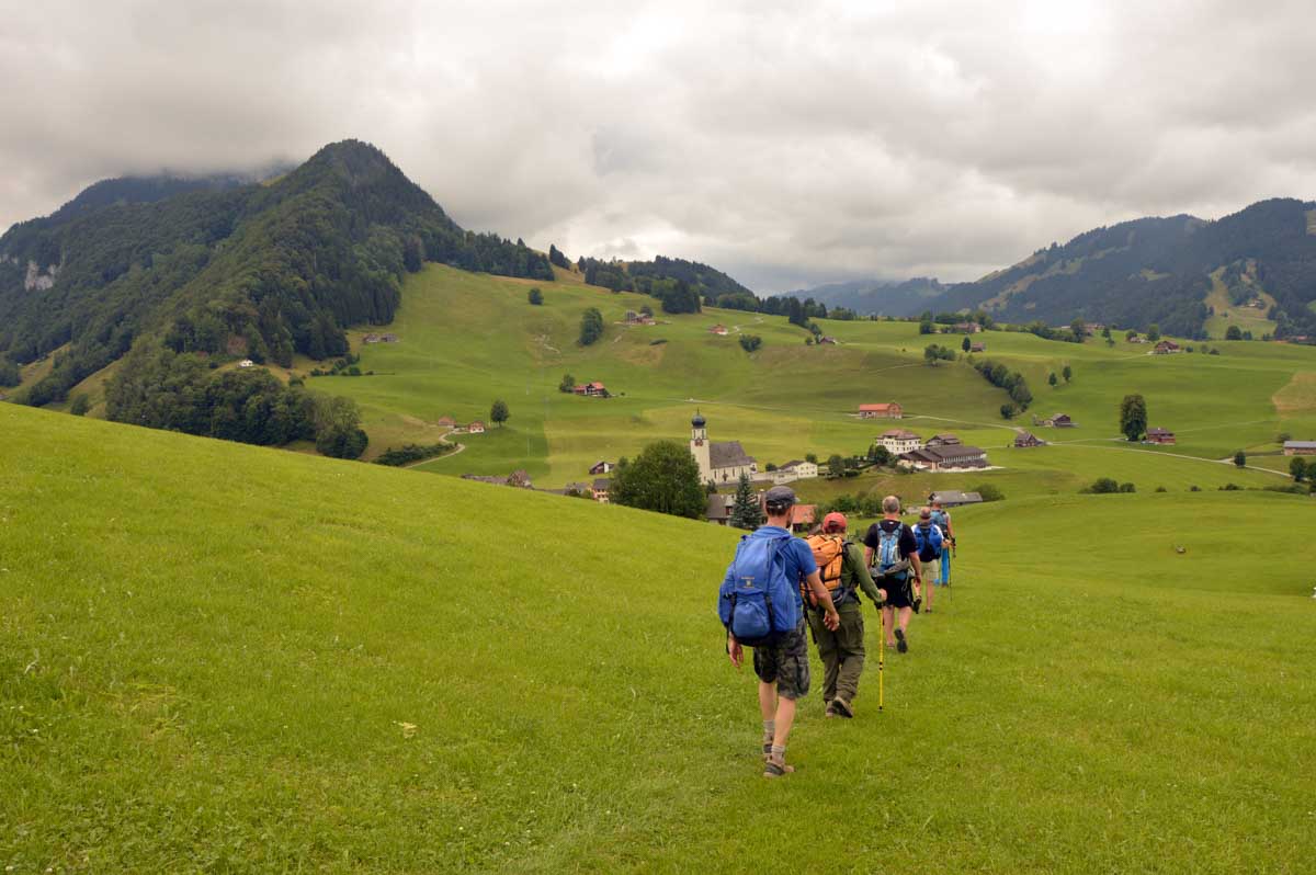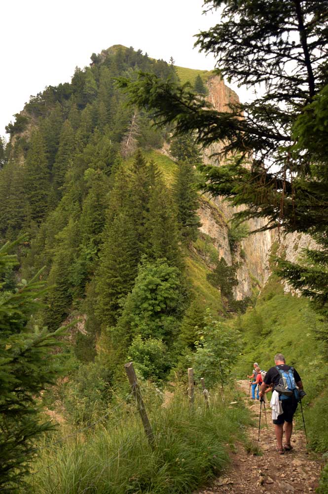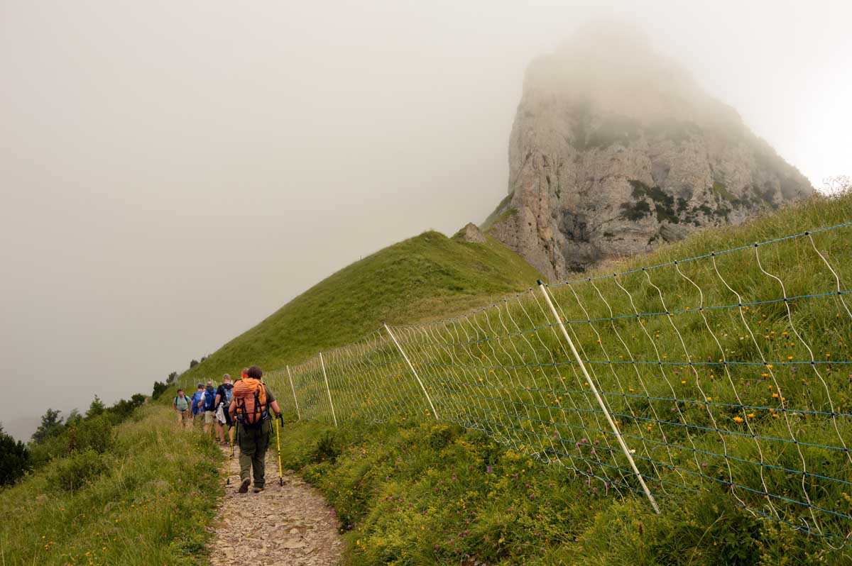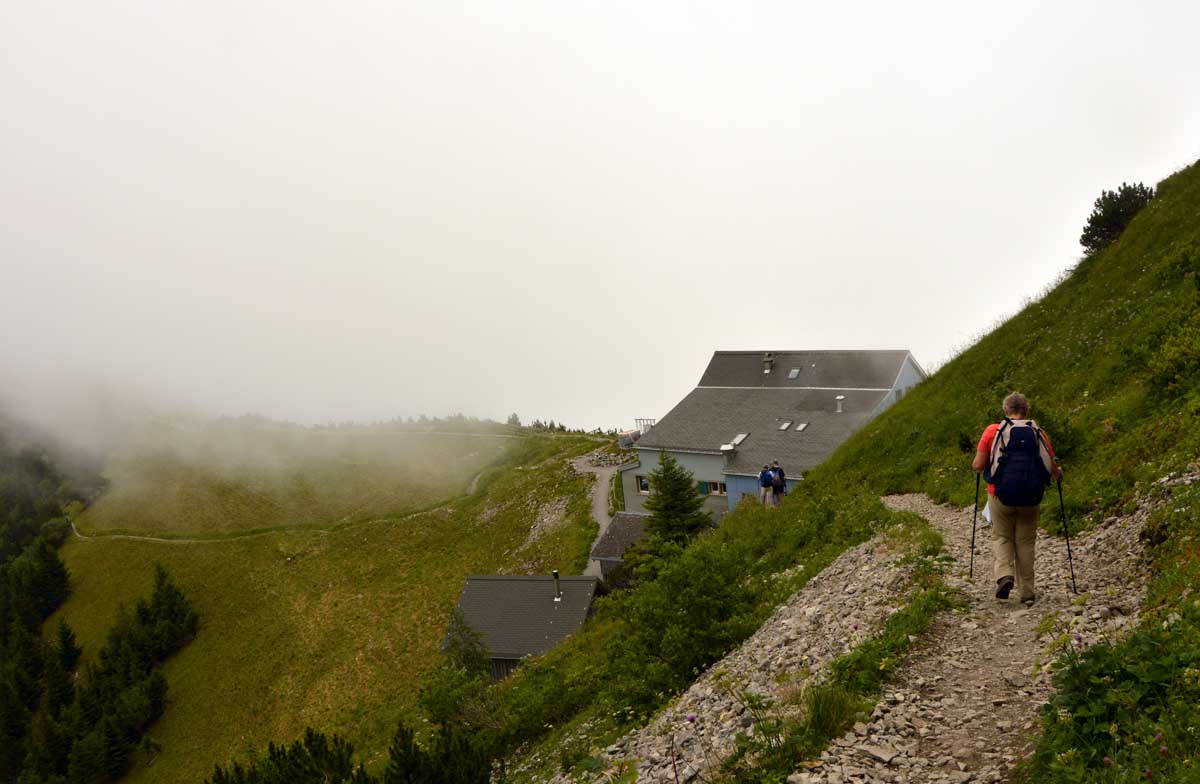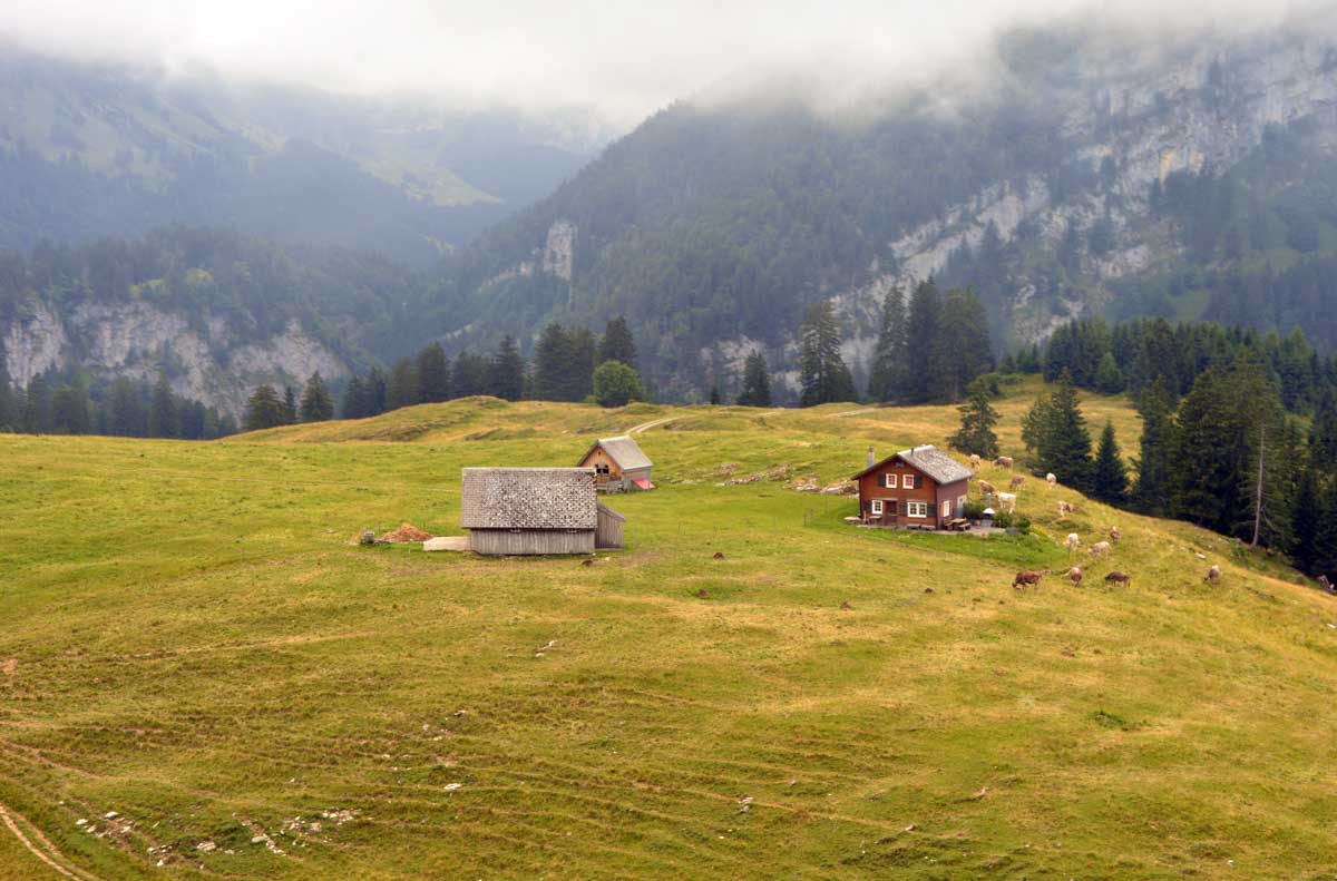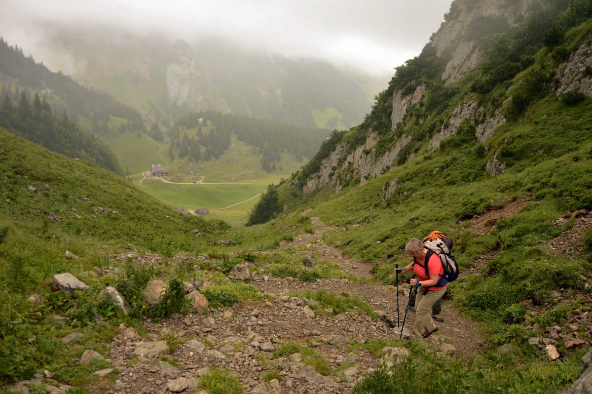 Explication : plusieurs orchestres de cors des Alpes s’étaient retrouvés là-haut en costumes ! Pour nous, déjeuner sur des bancs face à la vue sur le brouillard et puis direction le téléphérique. Oui parce que nous on grimpe à pied et on descend en cabine ! Tu verras quand tu y seras, tu feras pareil pour t’épargner la descente ! Encore un petit effort pour deux kilomètres jusqu’à Schwende dans des prés verts (rien à voir avec le poète) et voici venu le moment de changer de chaussures.