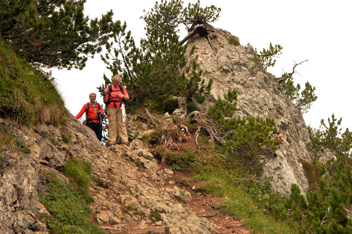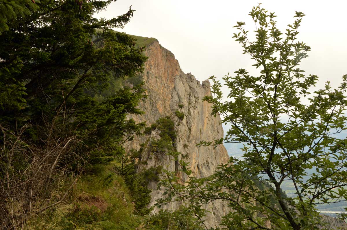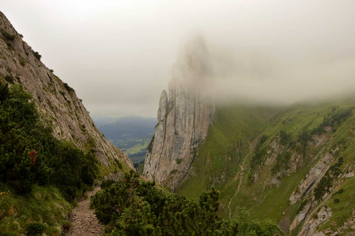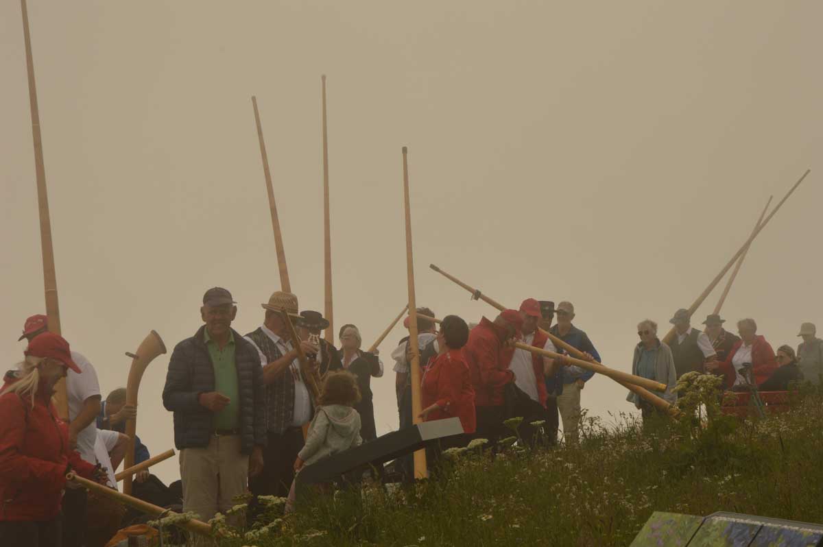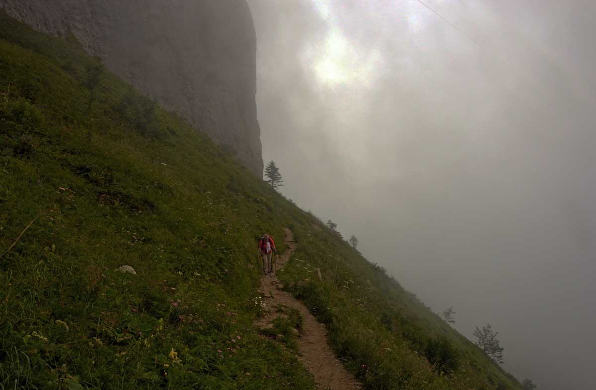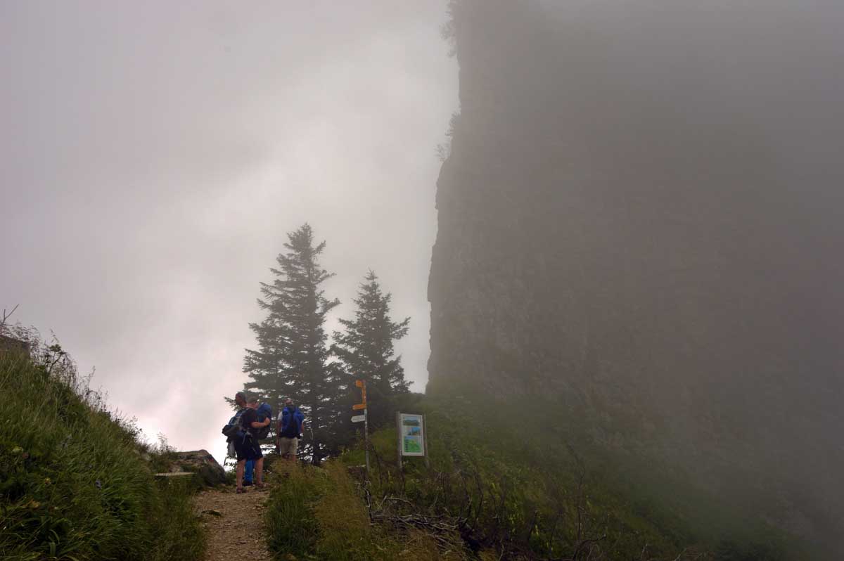 Et je monte, et je descends, et je remonte, et je redescends, toujours sous les immenses rochers qui composent la crête. Puis la montée franche et raide ne laissait plus de doute : bien que planqué dans le brouillard, c’était bien le Hoher Kasten à 1794 m qu’on était en train de gravir ! Et tout à coup, dans la purée de pois, des sons surgis de nulle part, fantomatiques, irréels, (j’aimerais mettre symptomatiques, mais ça ne veut rien dire ici) nous guidaient vers le sommet. De longues ondes sonores nous parvenaient de plus en plus nettes tels des appels d’une créature fantastique (je mets du suspens, hein ?).