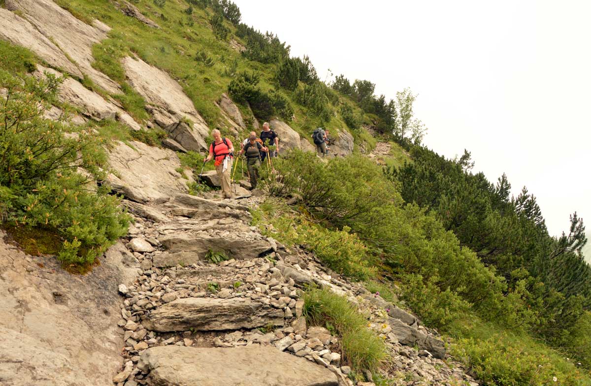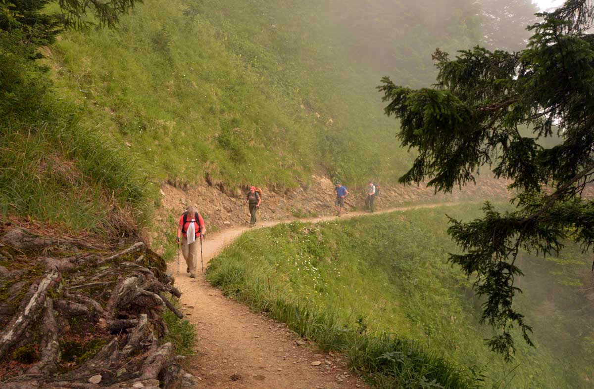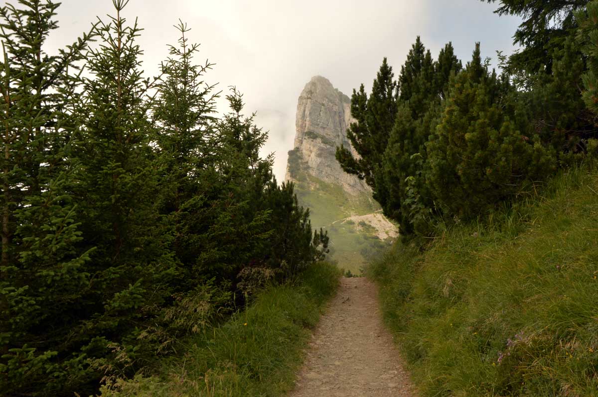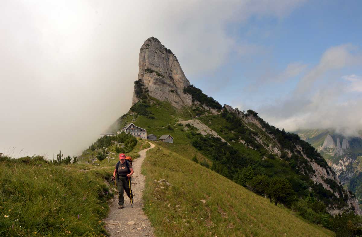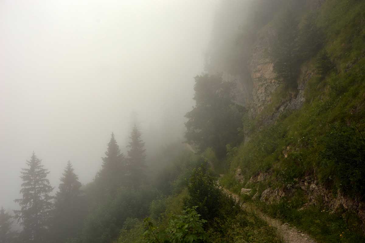 Et que je te monte encore sur un joli sentier en lacets avant de me retrouver sur un autre sentier en balcon avec tout en bas, l’auberge de la veille. Là, c’était une succession de falaises et de pics que nous avons contournés sur notre confortable chemin. Même dans le brouillard, ils sont impressionnants ! Cette fois, ce sont les Dolomites qui étaient évoquées. Mais franchement, ils auraient pu mettre ça moins haut, avec un peu de plat autour, ça aurait pas été plus mal.