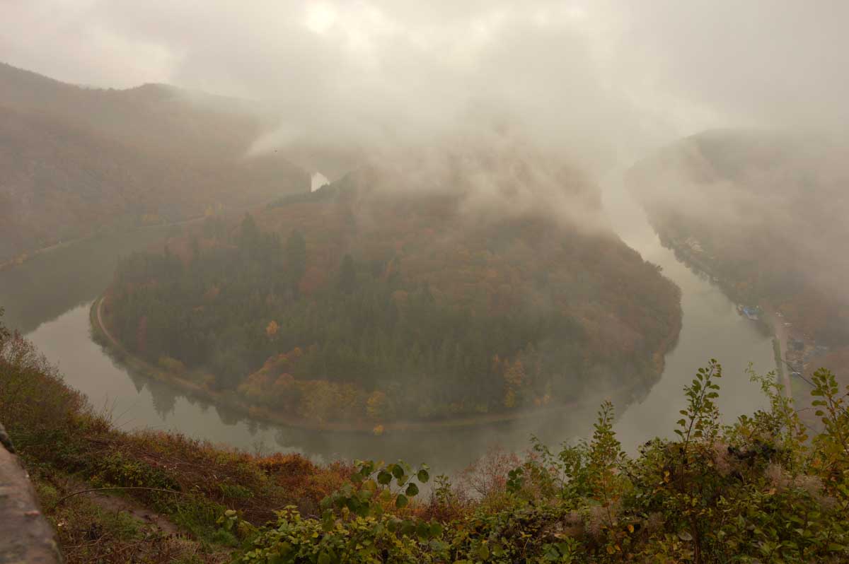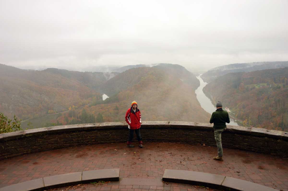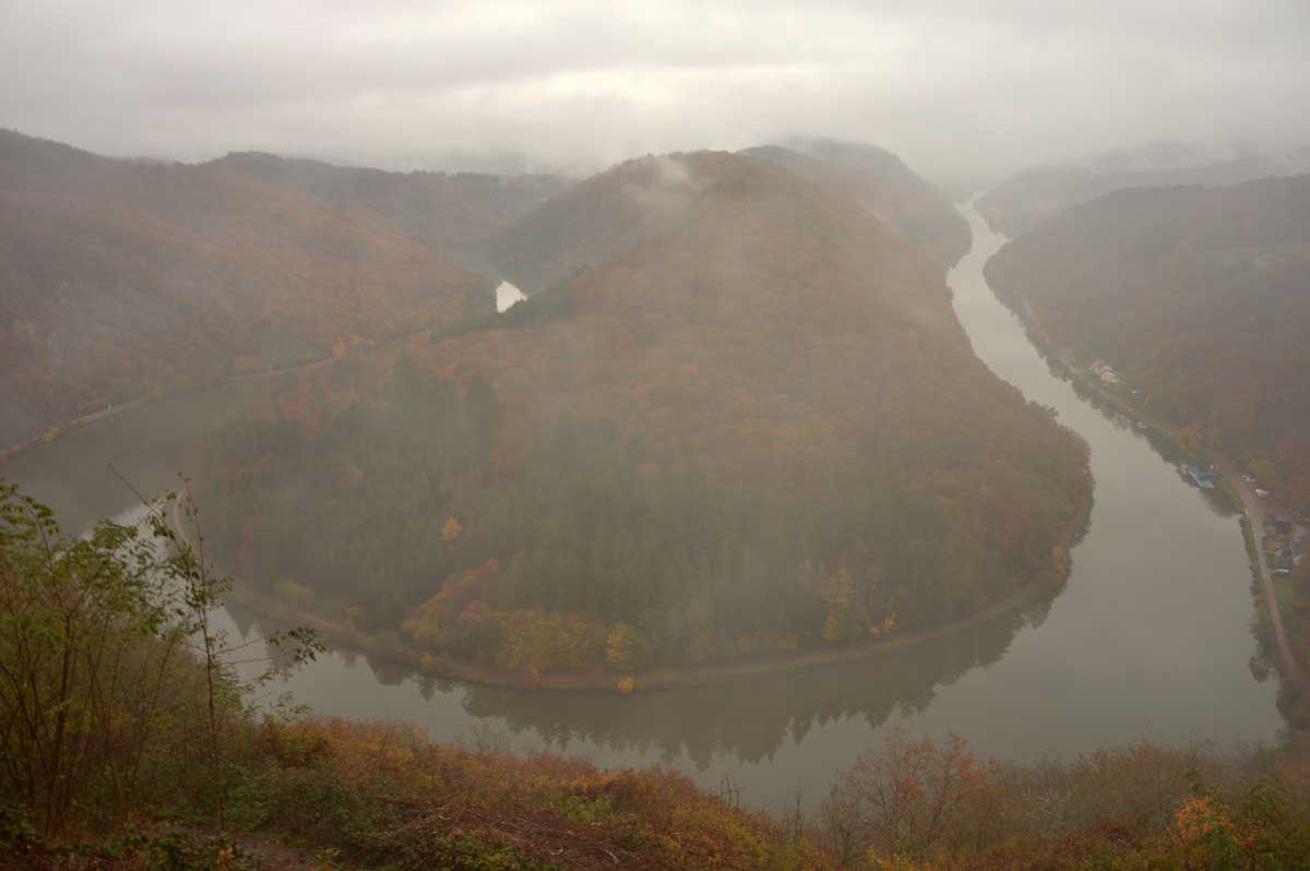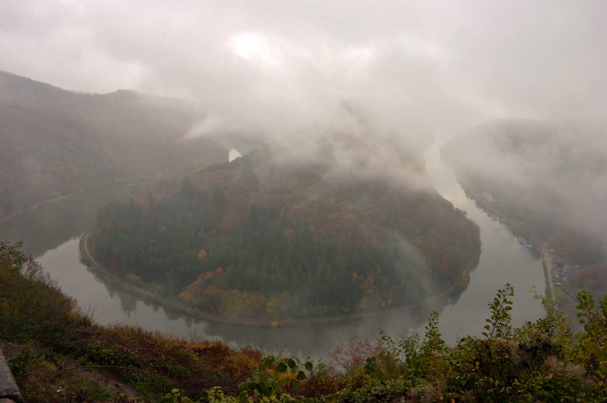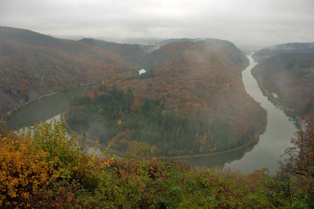 Eh bien mon lapinou, je sais pas si c’est du fait que j’ai éternué mais d’un coup, hop, le brouillard a dégagé temporairement et là j’ai vu la Boucle de la Sarre. Et oui, The boucle, après celle de la Moselle la veille. C’est-à-dire que la Sarre ne se contente pas de prendre sa source au Donon, elle prend aussi ses aises dans la Sarre, style je te contourne tranquille la colline au lieu de m’efforcer de l’éroder pendant des millénaires. Y’avait un passage, hop, je te le prends et je deviens une attraction touristique. Ah, on me dit dans l’oreillette que là on a envie que j’arrête, alors j’arrête. Faut pas trop solliciter le lecteur. Oui la lectrice non plus, OK ma poule.