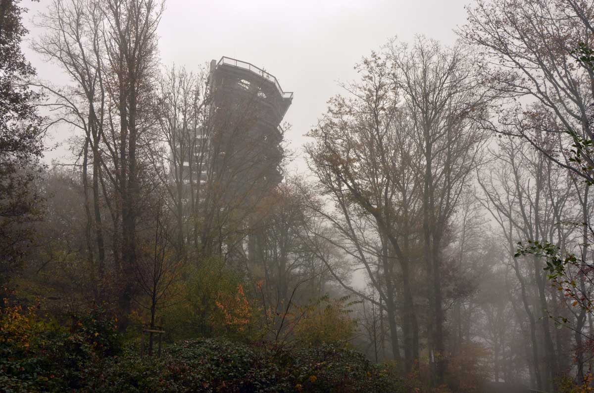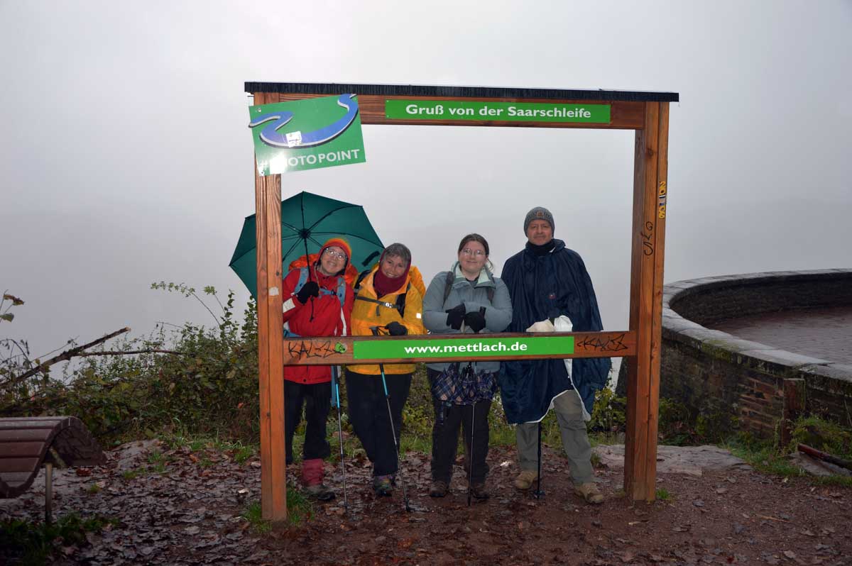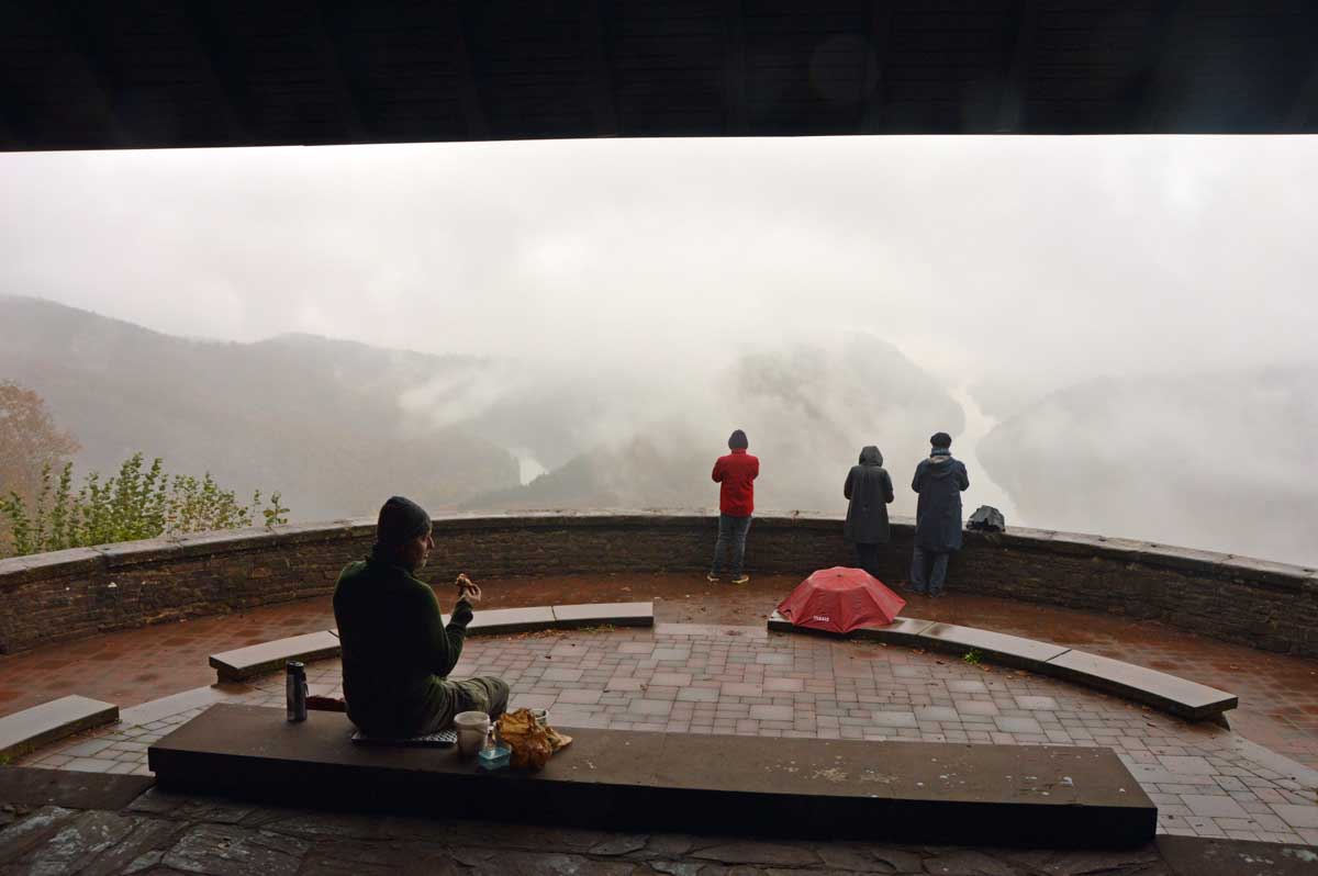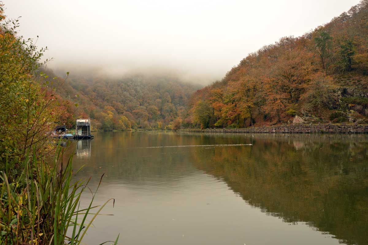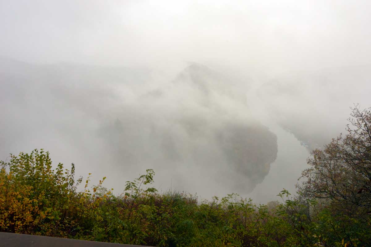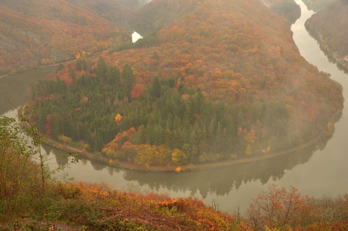 Eh bien mon lapinou, je sais pas si c’est du fait que j’ai éternué mais d’un coup, hop, le brouillard a dégagé temporairement et là j’ai vu la Boucle de la Sarre. Et oui, The boucle, après celle de la Moselle la veille. C’est-à-dire que la Sarre ne se contente pas de prendre sa source au Donon, elle prend aussi ses aises dans la Sarre, style je te contourne tranquille la colline au lieu de m’efforcer de l’éroder pendant des millénaires. Y’avait un passage, hop, je te le prends et je deviens une attraction touristique. Ah, on me dit dans l’oreillette que là on a envie que j’arrête, alors j’arrête. Faut pas trop solliciter le lecteur. Oui la lectrice non plus, OK ma poule.