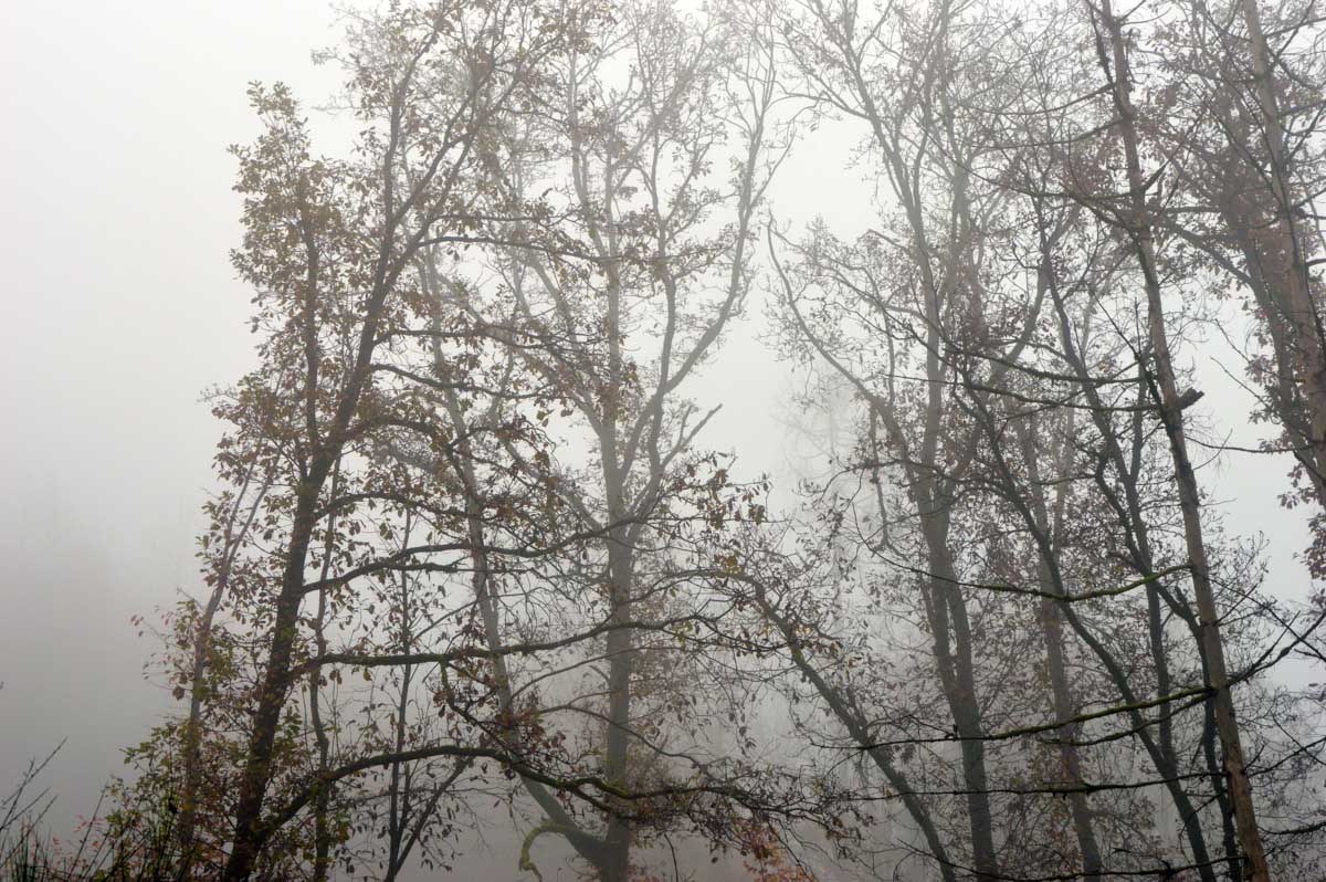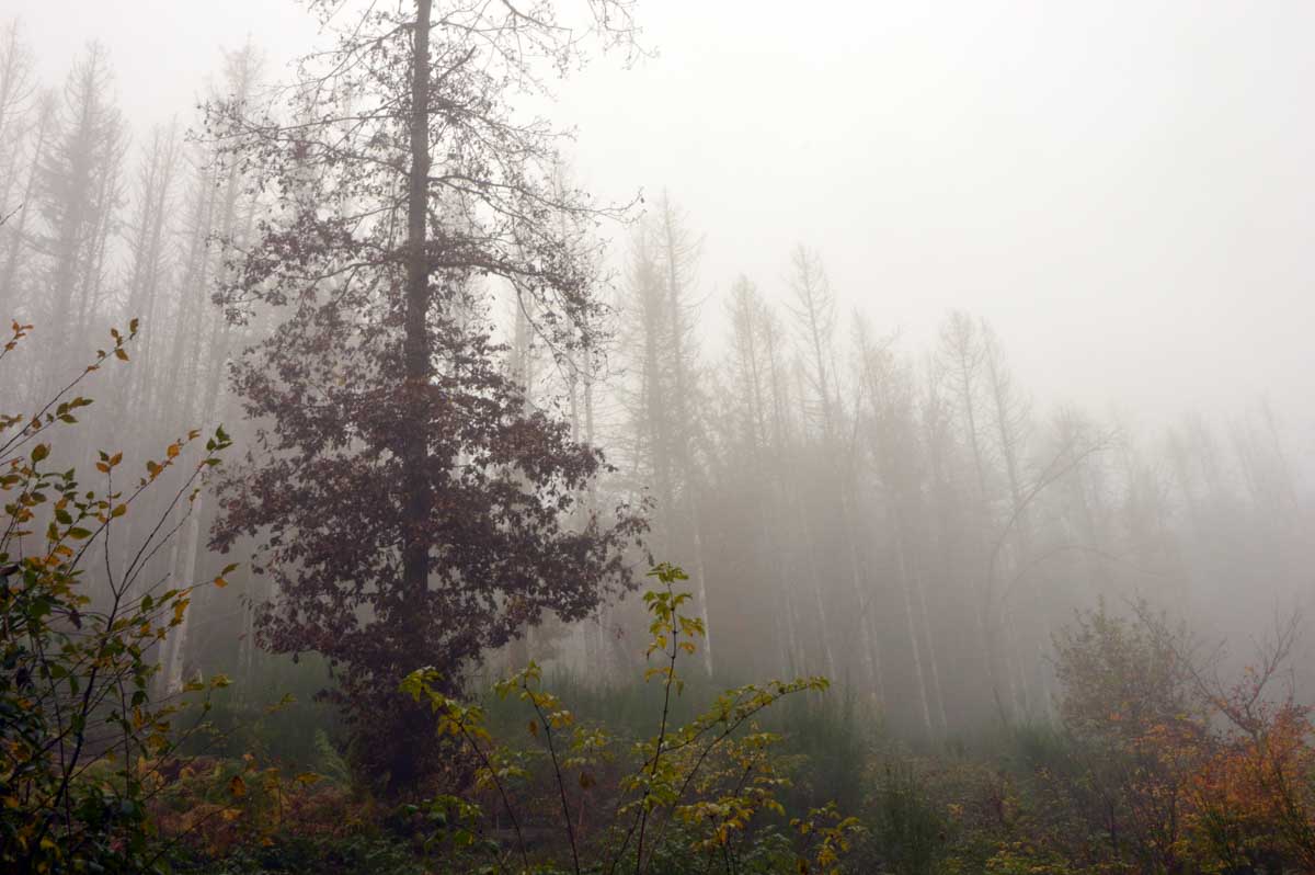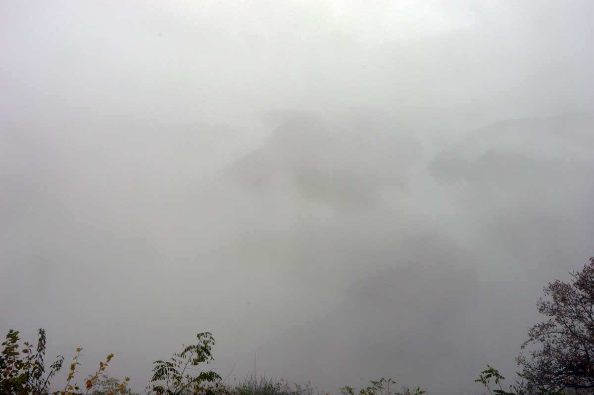 Ben oui y’a eu de la pluie. Tu l’as ton scoop ? On peut continuer la rando ? Alors schéma classique : montée, plat, descente. Mais là-haut, on a eu un point de vue avec point de vue pour commencer. Brouillard. Brume. Purée de pois. Nébuleuse blanche. Hydrométéore (culturel, celui-là). Bouillasse aussi, ça définit pas mal le machin.