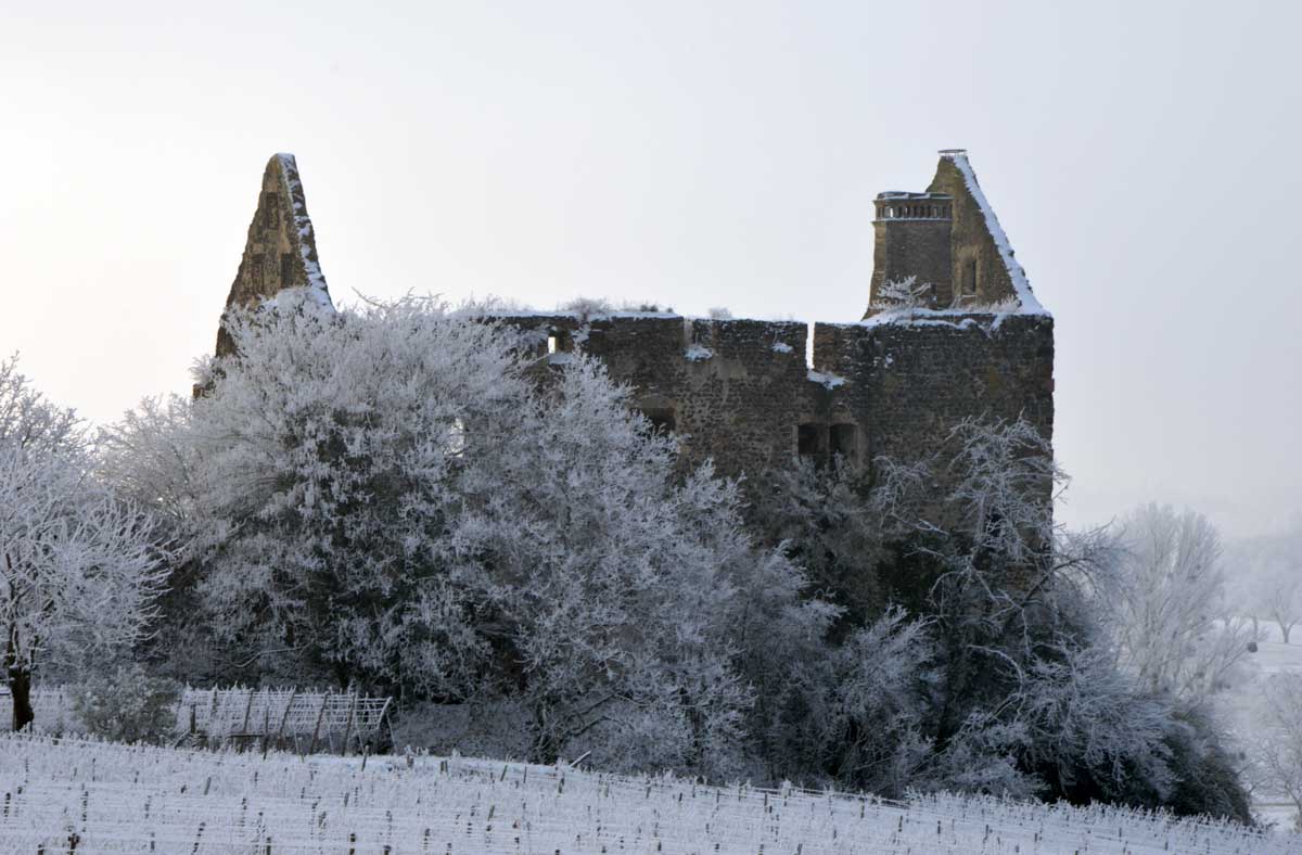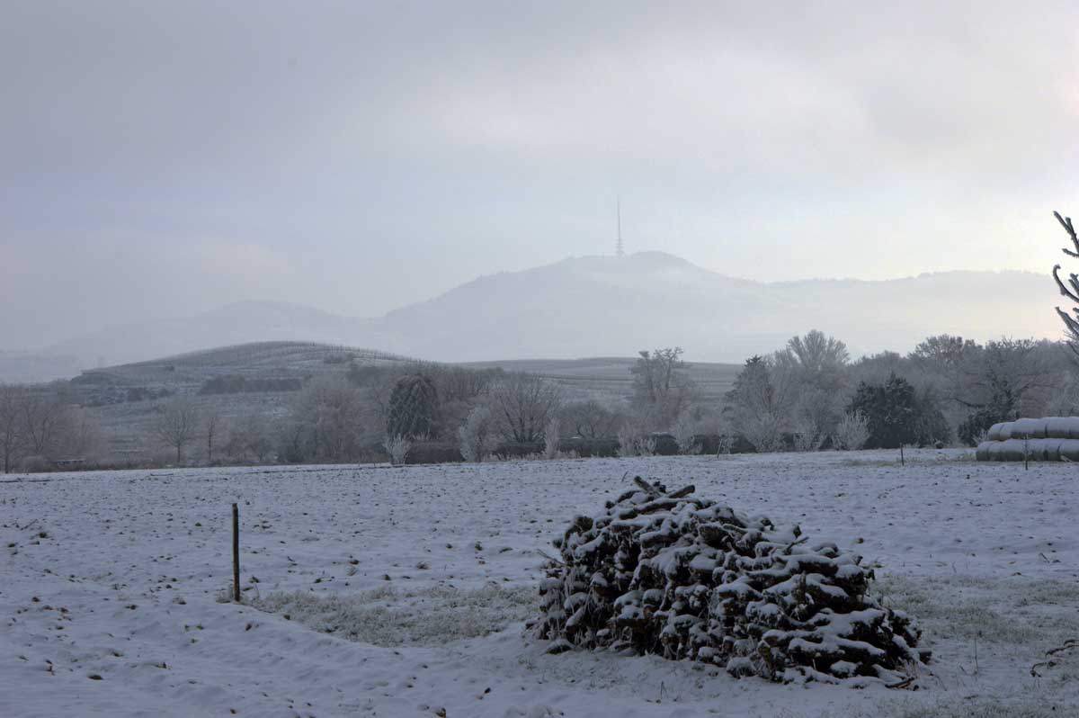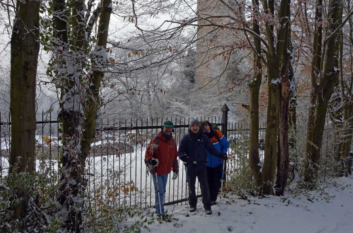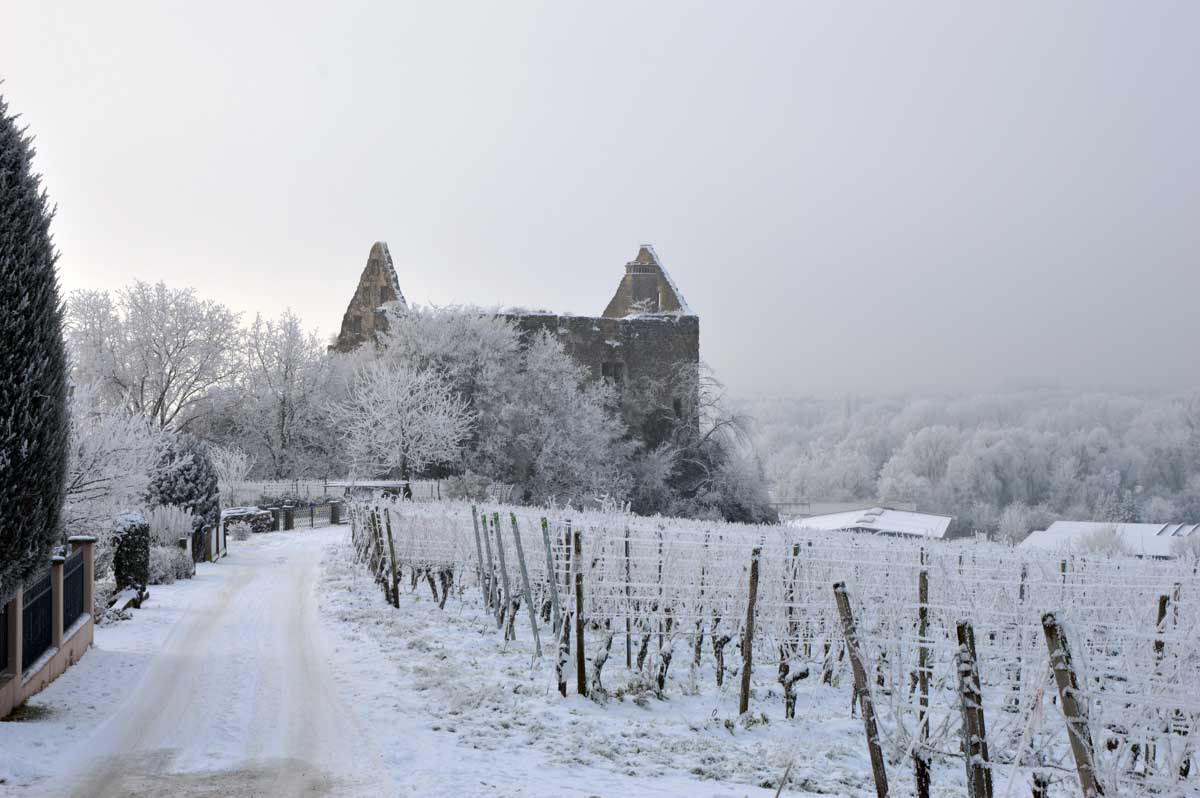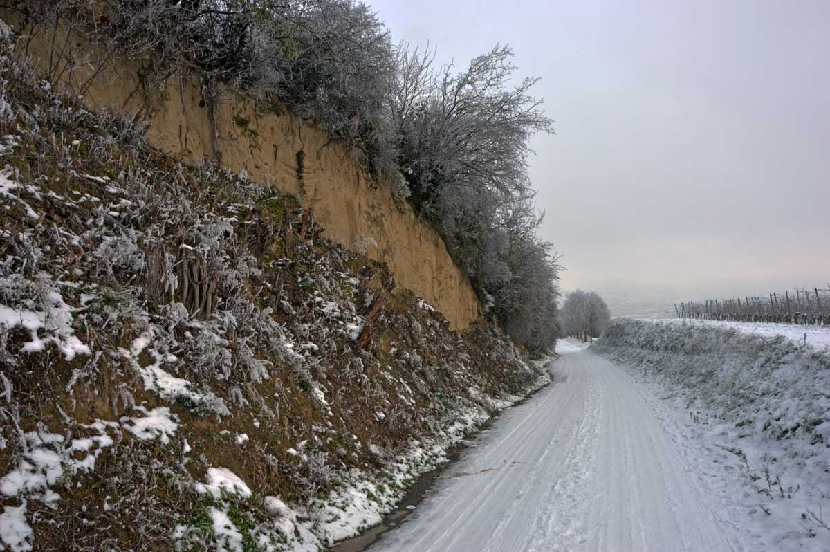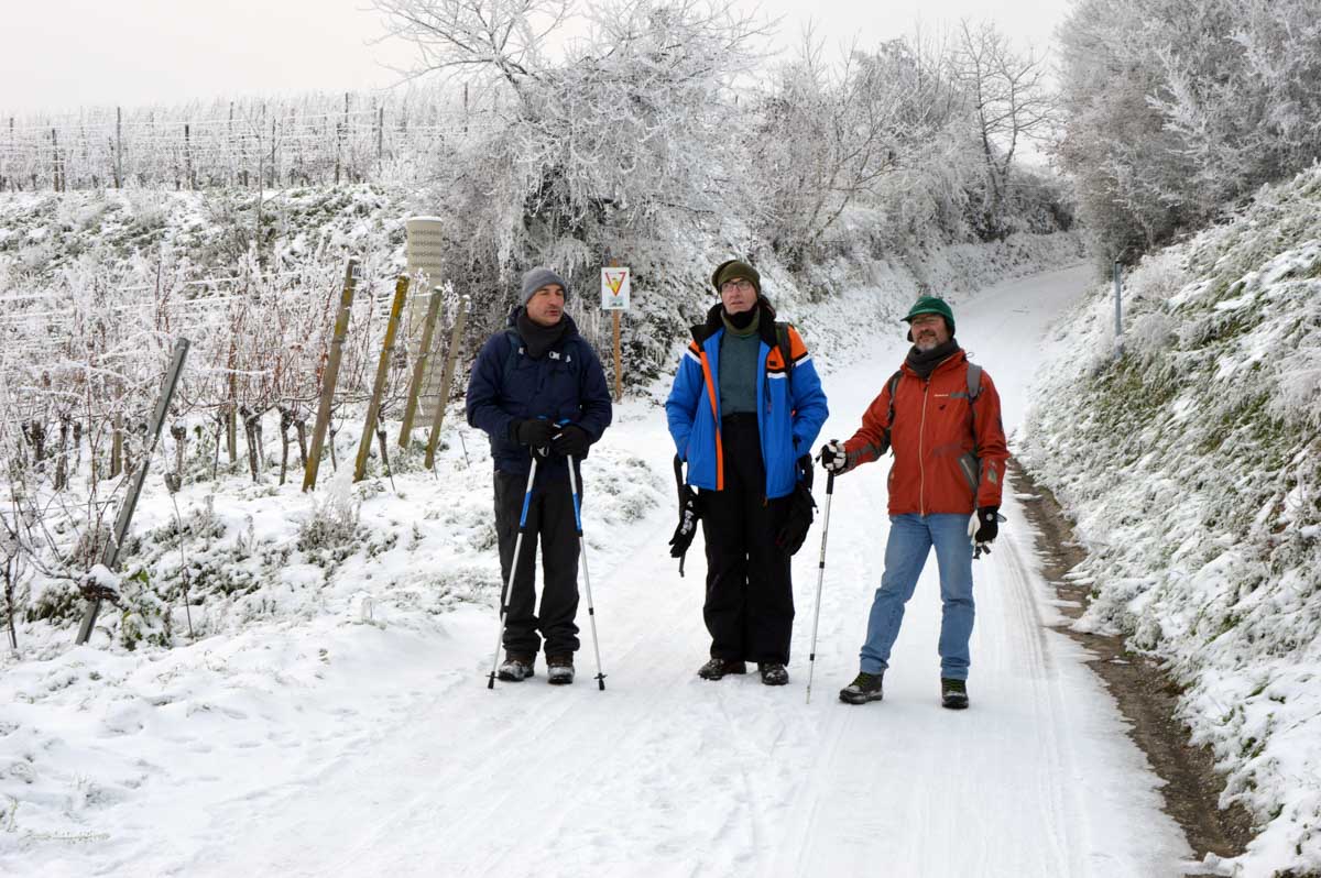 A la pointe nord de notre circuit se dresse le Sponeck. Après le fort romain du 4ème siècle dressé ici pour surveiller le Rhin, l’Histoire a vu s’élever un château, modifié, détruit, puis enfin sa tour reconstruite en 1917 par le peintre Hans Adolf Bühler. L’édifice appartient toujours à la famille et les jardins sont accessibles pour notre plus grand plaisir. Drôle de château que cette tour émergeant au milieu de la… aïe aïe.. ouhouhhh oupsla… forêt. Foutu verglas sous la neige ! Le chemin nous a emmenés à travers les vignes en étages et les Hohlwege, ces fameux chemins descendant le long de murs de loess, déjà typiques du Kaiserstuhl. Une dernière glissade, un dernier cri viril pour accompagner les contorsions anti-chutes, et c’était l’heure du café avant le retour.