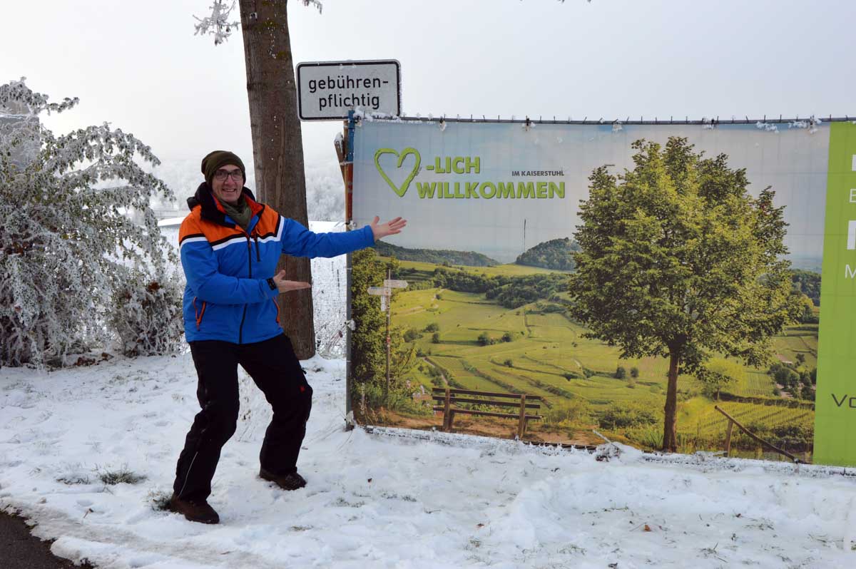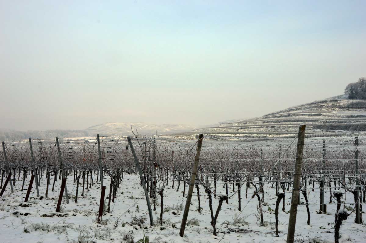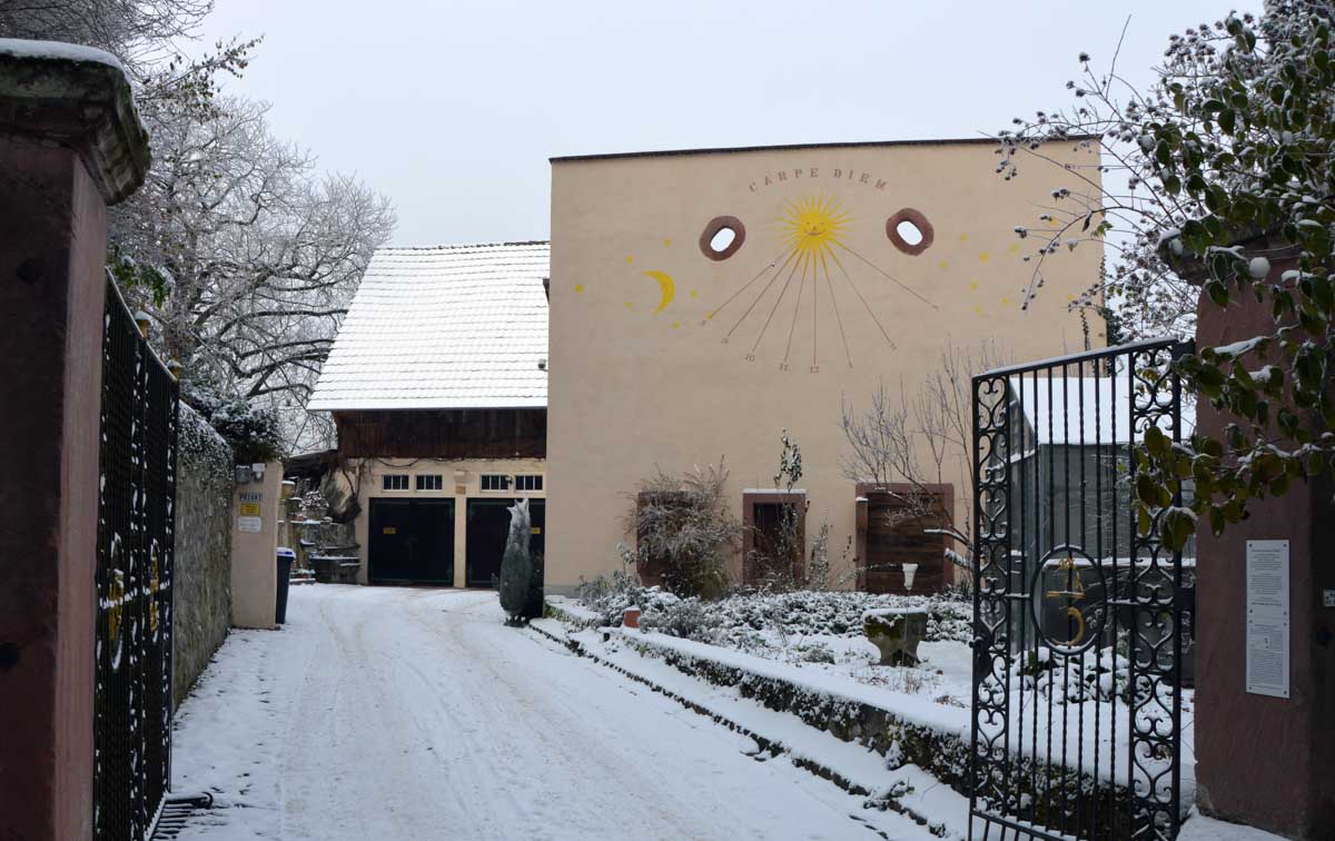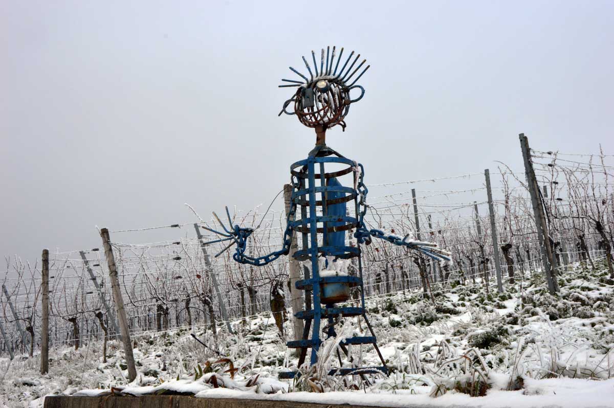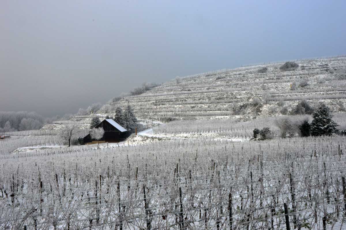 A la pointe nord de notre circuit se dresse le Sponeck. Après le fort romain du 4ème siècle dressé ici pour surveiller le Rhin, l’Histoire a vu s’élever un château, modifié, détruit, puis enfin sa tour reconstruite en 1917 par le peintre Hans Adolf Bühler. L’édifice appartient toujours à la famille et les jardins sont accessibles pour notre plus grand plaisir. Drôle de château que cette tour émergeant au milieu de la… aïe aïe.. ouhouhhh oupsla… forêt. Foutu verglas sous la neige ! Le chemin nous a emmenés à travers les vignes en étages et les Hohlwege, ces fameux chemins descendant le long de murs de loess, déjà typiques du Kaiserstuhl. Une dernière glissade, un dernier cri viril pour accompagner les contorsions anti-chutes, et c’était l’heure du café avant le retour.