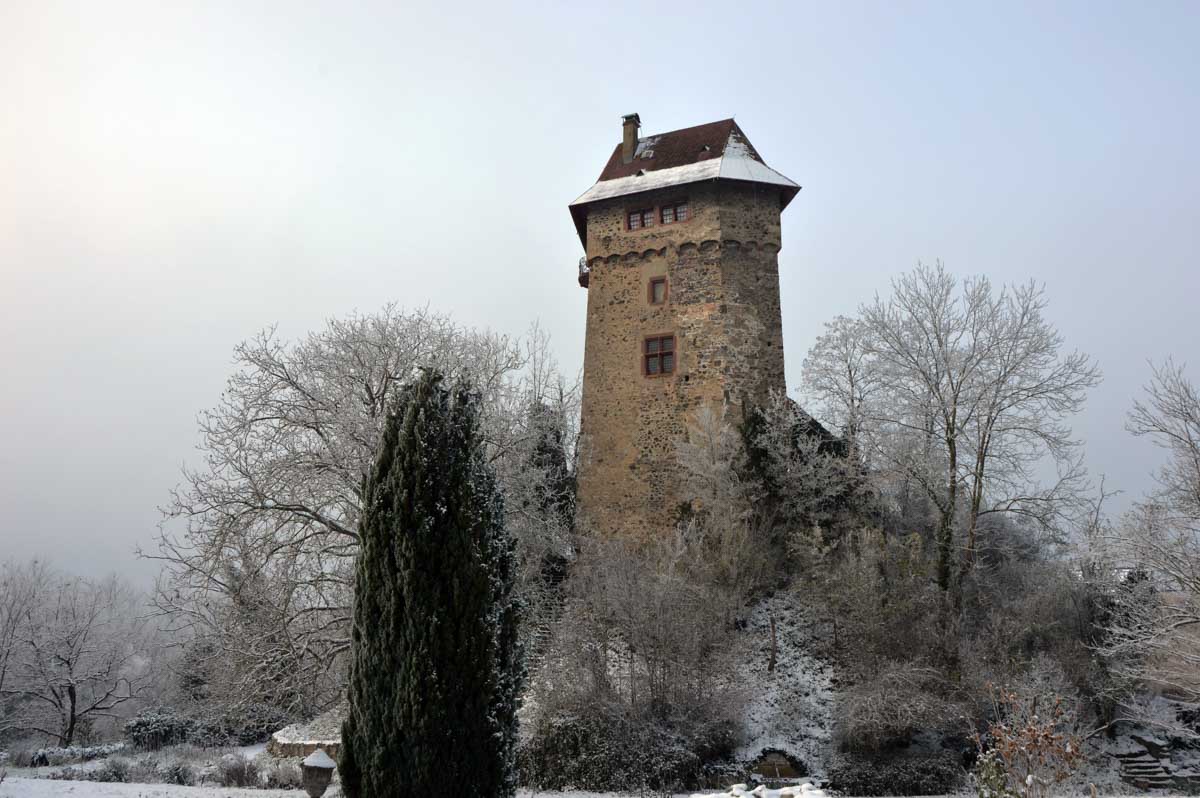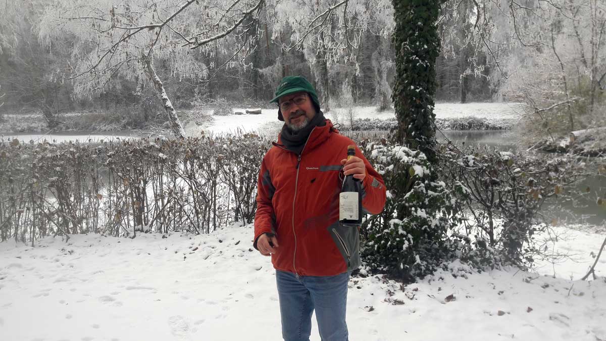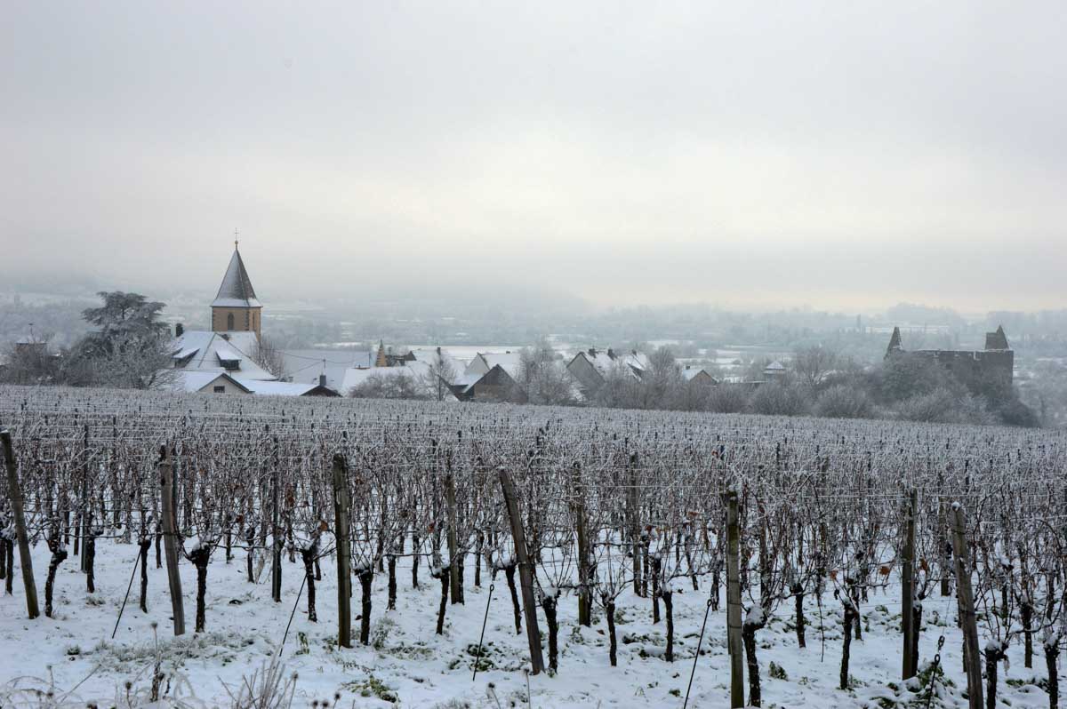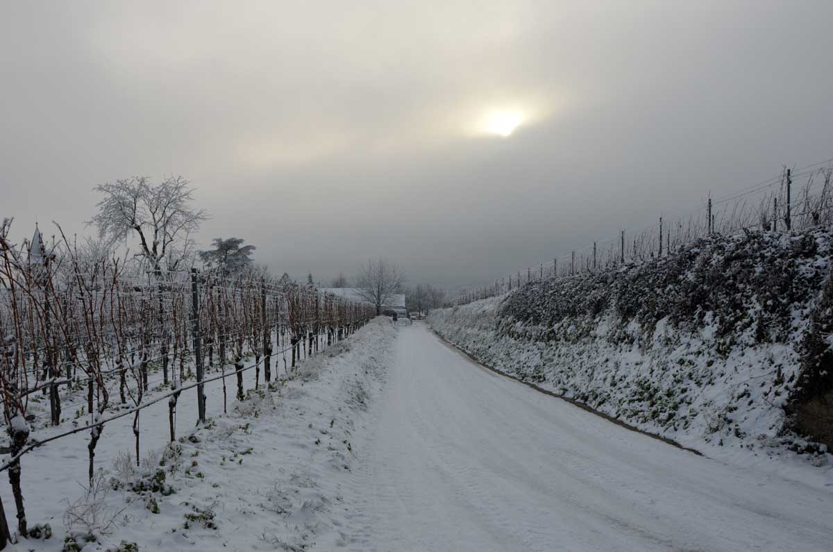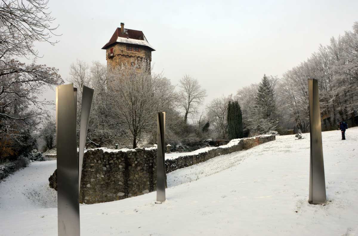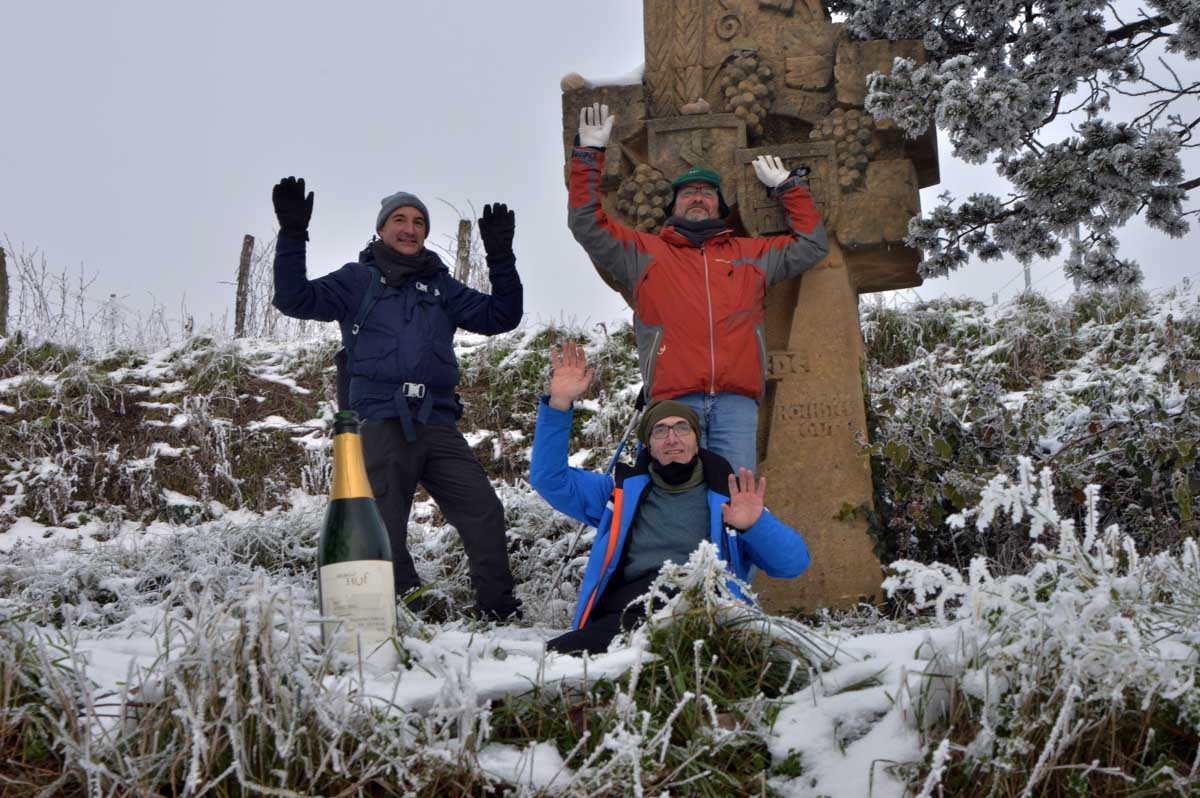 A la pointe nord de notre circuit se dresse le Sponeck. Après le fort romain du 4ème siècle dressé ici pour surveiller le Rhin, l’Histoire a vu s’élever un château, modifié, détruit, puis enfin sa tour reconstruite en 1917 par le peintre Hans Adolf Bühler. L’édifice appartient toujours à la famille et les jardins sont accessibles pour notre plus grand plaisir. Drôle de château que cette tour émergeant au milieu de la… aïe aïe.. ouhouhhh oupsla… forêt. Foutu verglas sous la neige ! Le chemin nous a emmenés à travers les vignes en étages et les Hohlwege, ces fameux chemins descendant le long de murs de loess, déjà typiques du Kaiserstuhl. Une dernière glissade, un dernier cri viril pour accompagner les contorsions anti-chutes, et c’était l’heure du café avant le retour.
