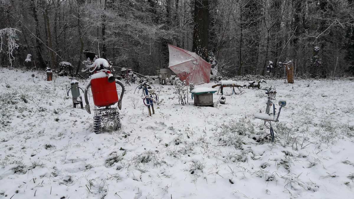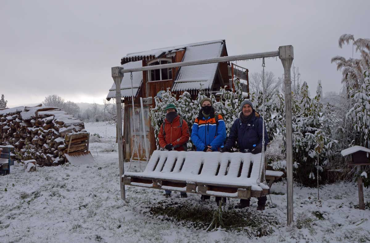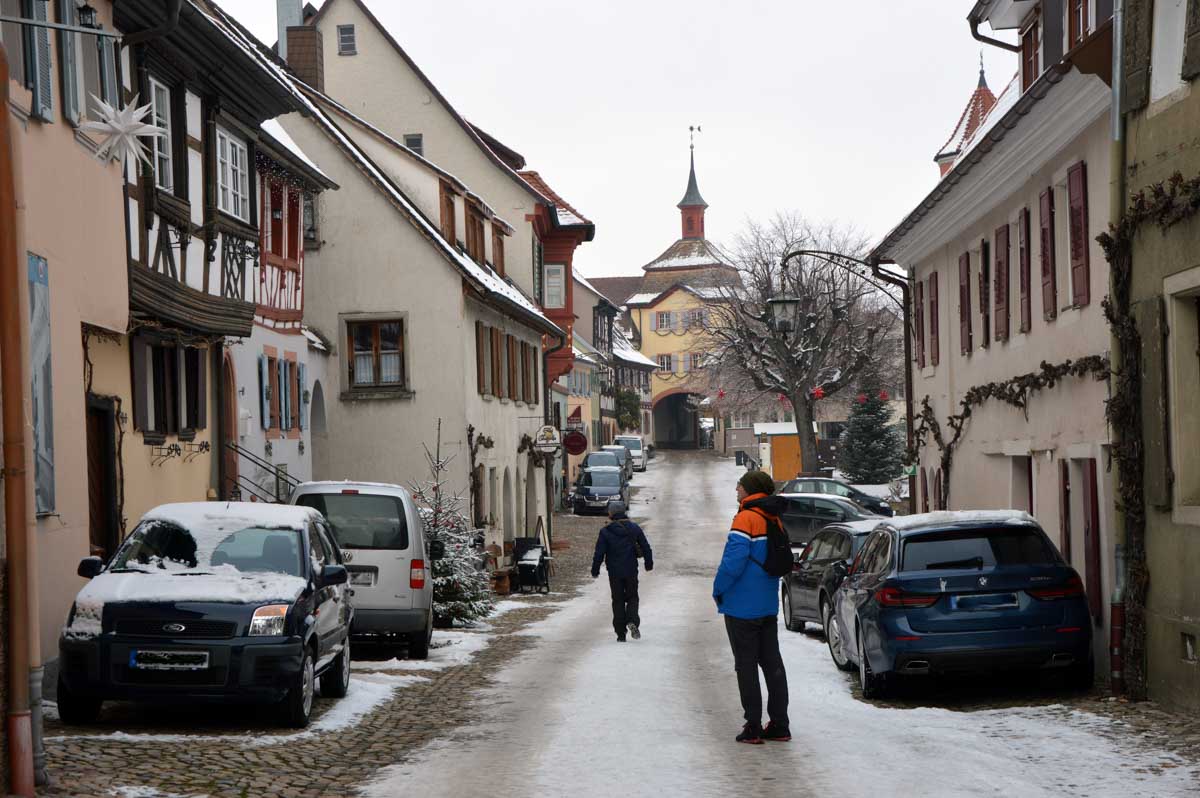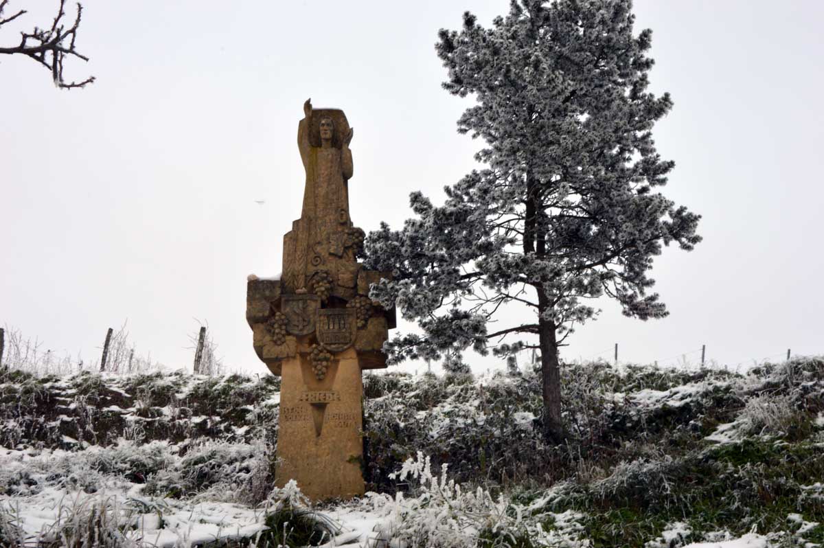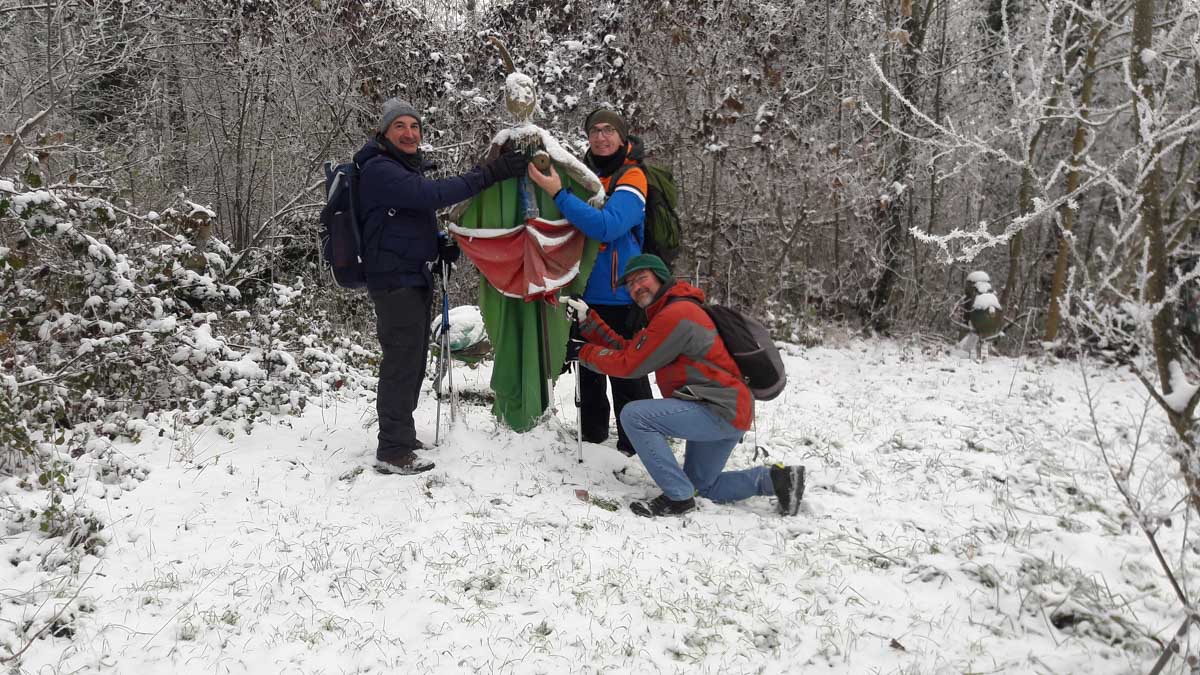 A la pointe nord de notre circuit se dresse le Sponeck. Après le fort romain du 4ème siècle dressé ici pour surveiller le Rhin, l’Histoire a vu s’élever un château, modifié, détruit, puis enfin sa tour reconstruite en 1917 par le peintre Hans Adolf Bühler. L’édifice appartient toujours à la famille et les jardins sont accessibles pour notre plus grand plaisir. Drôle de château que cette tour émergeant au milieu de la… aïe aïe.. ouhouhhh oupsla… forêt. Foutu verglas sous la neige ! Le chemin nous a emmenés à travers les vignes en étages et les Hohlwege, ces fameux chemins descendant le long de murs de loess, déjà typiques du Kaiserstuhl. Une dernière glissade, un dernier cri viril pour accompagner les contorsions anti-chutes, et c’était l’heure du café avant le retour.