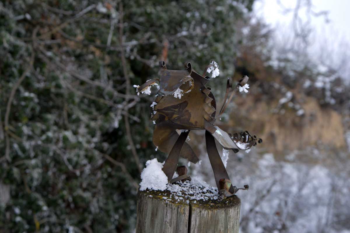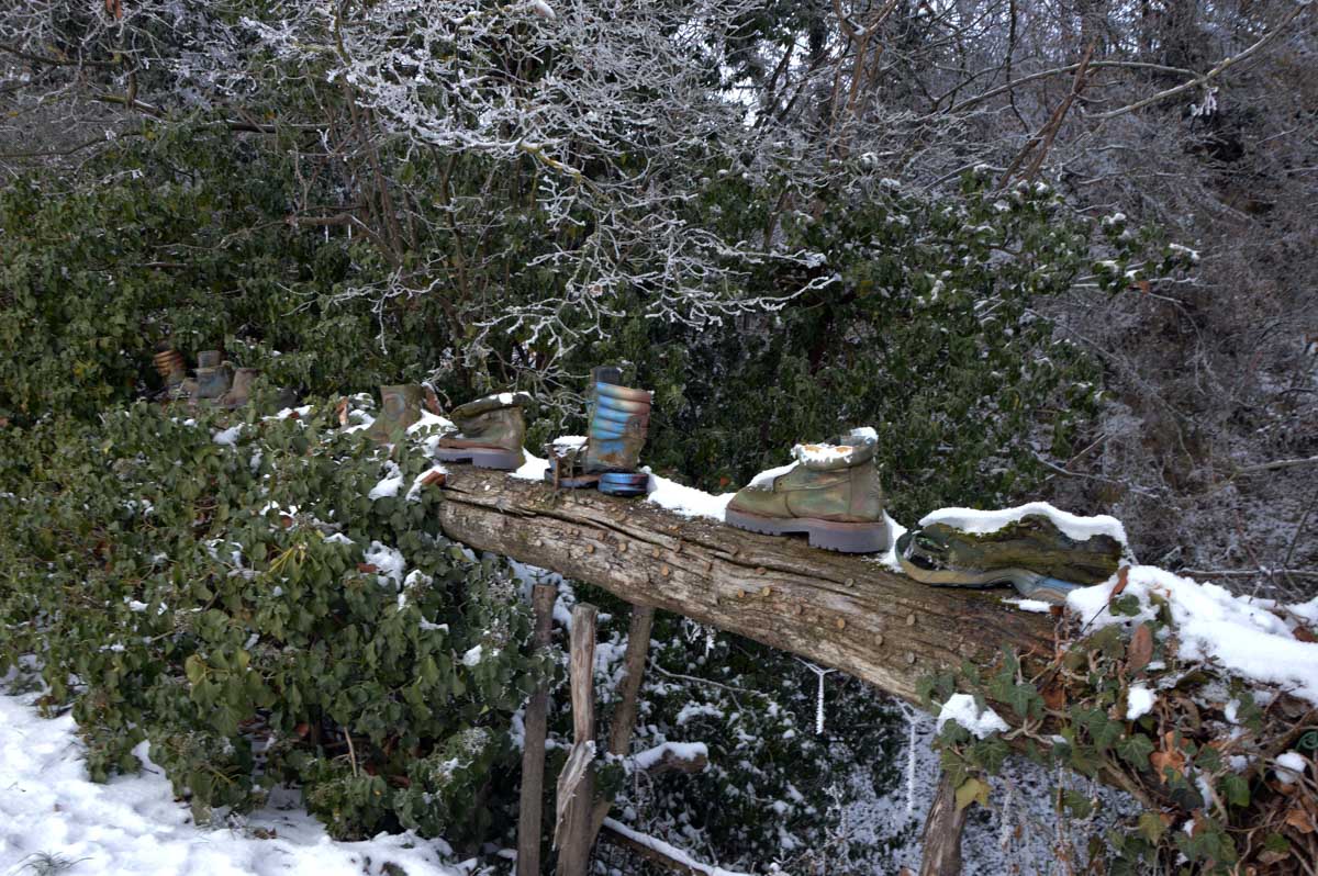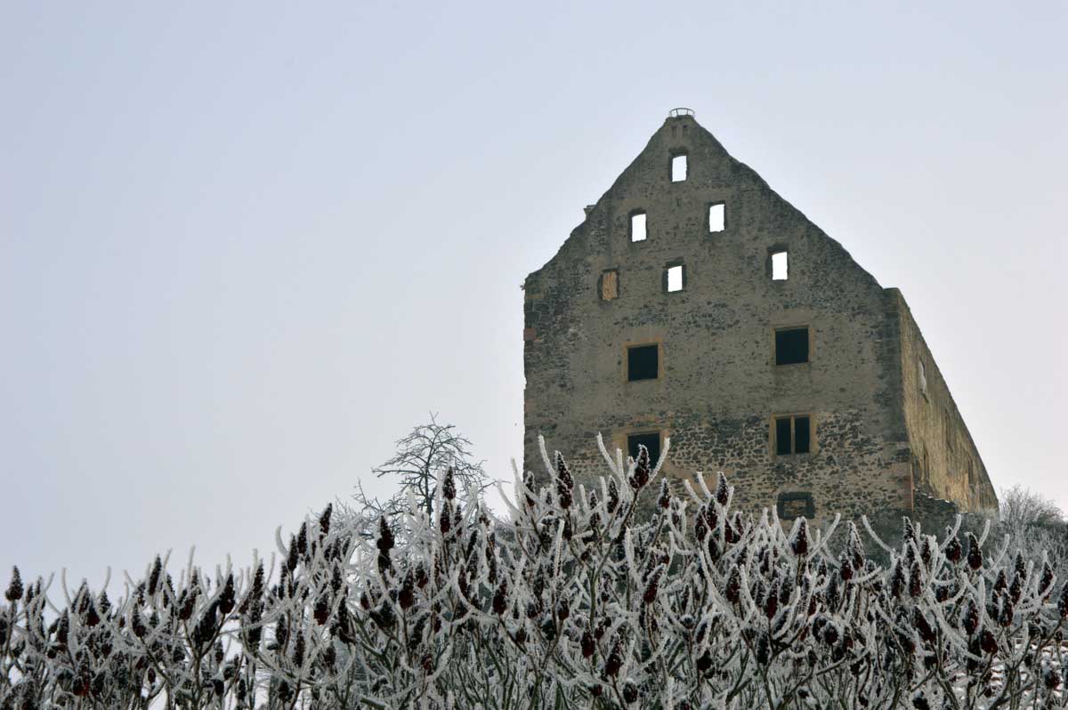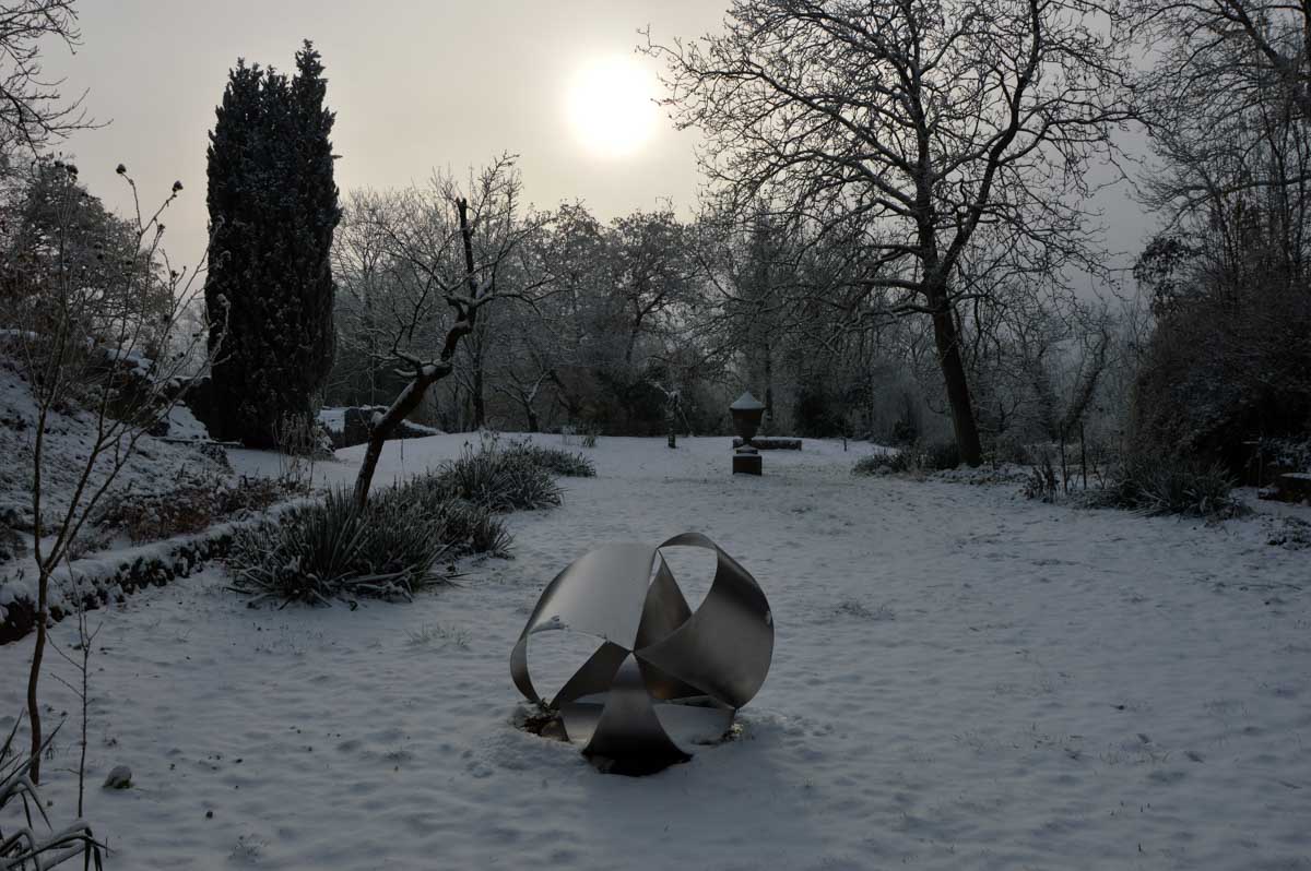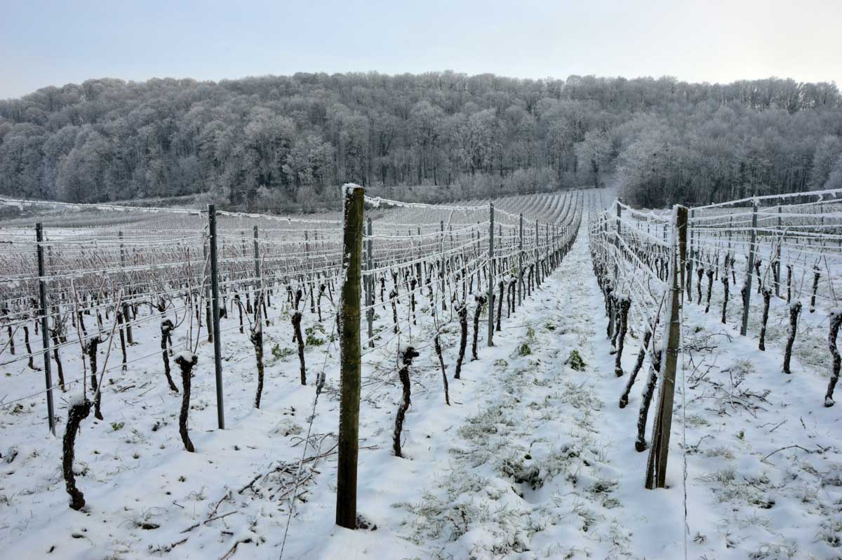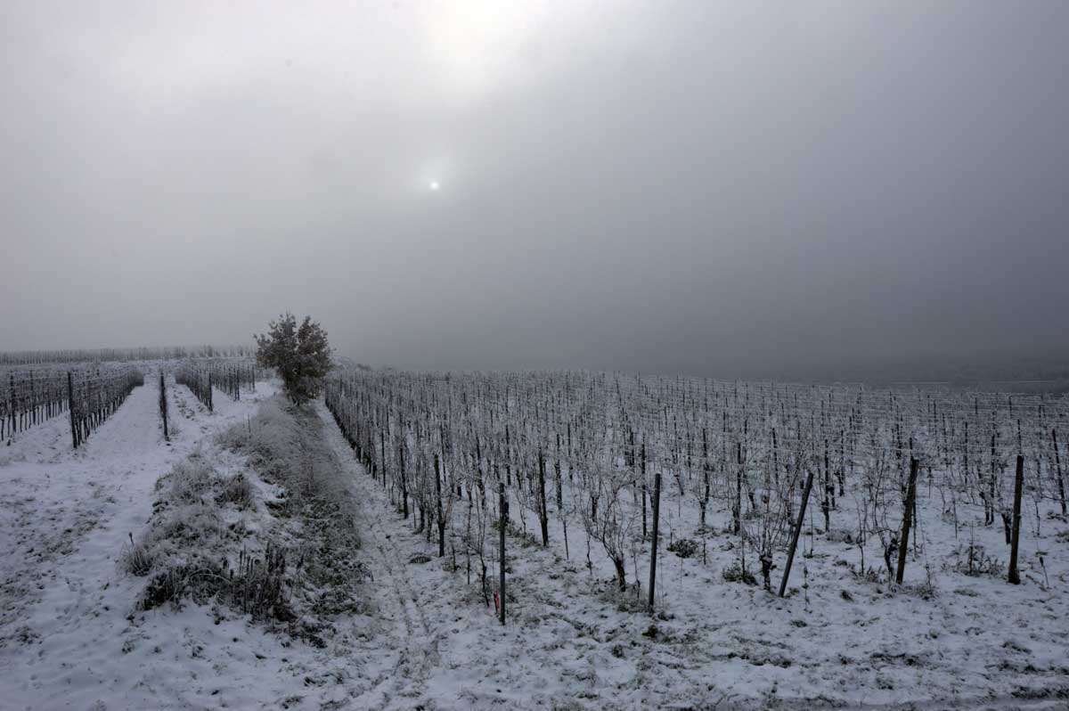 A la pointe nord de notre circuit se dresse le Sponeck. Après le fort romain du 4ème siècle dressé ici pour surveiller le Rhin, l’Histoire a vu s’élever un château, modifié, détruit, puis enfin sa tour reconstruite en 1917 par le peintre Hans Adolf Bühler. L’édifice appartient toujours à la famille et les jardins sont accessibles pour notre plus grand plaisir. Drôle de château que cette tour émergeant au milieu de la… aïe aïe.. ouhouhhh oupsla… forêt. Foutu verglas sous la neige ! Le chemin nous a emmenés à travers les vignes en étages et les Hohlwege, ces fameux chemins descendant le long de murs de loess, déjà typiques du Kaiserstuhl. Une dernière glissade, un dernier cri viril pour accompagner les contorsions anti-chutes, et c’était l’heure du café avant le retour.