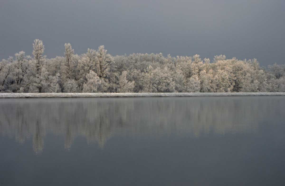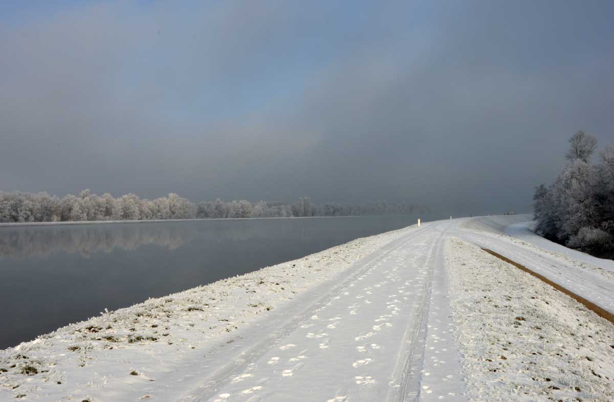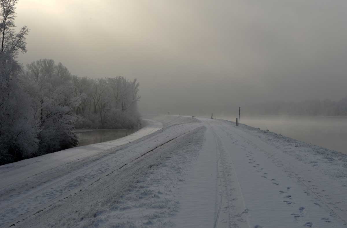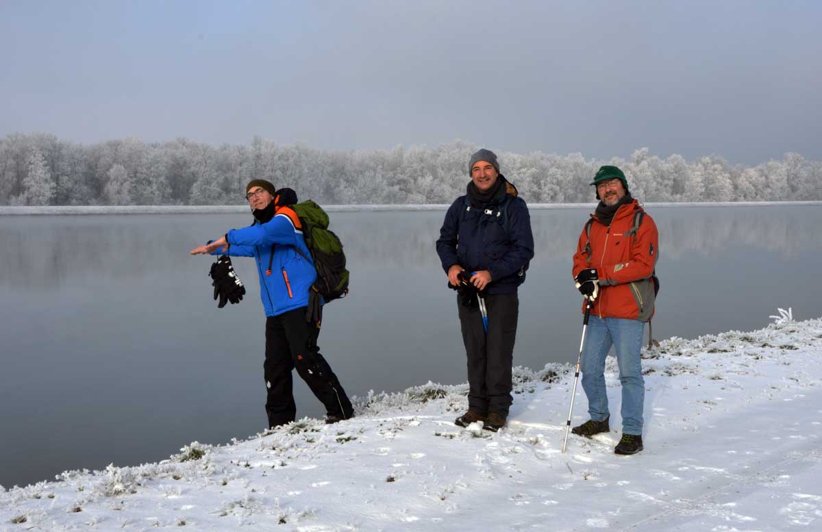 La neige remplaçant la glace dans la forêt rhénane, la progression fut plus facile jusqu’au Rhin, que nous avons découvert, émerveillés, dans un écrin blanc et brumeux. Spectacle rare. Il ne manquait plus qu’un vol d’oies sauvages pour parfaire… ah ben quand on parle du loup, enfin des oies, les voilà justement qui nous survolent en formation triangulaire.