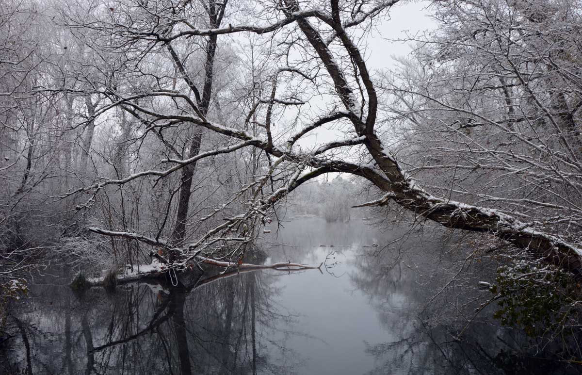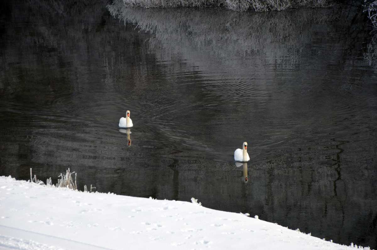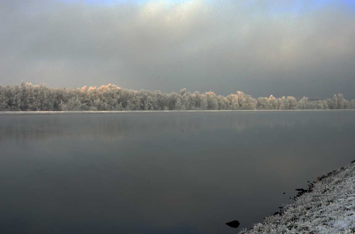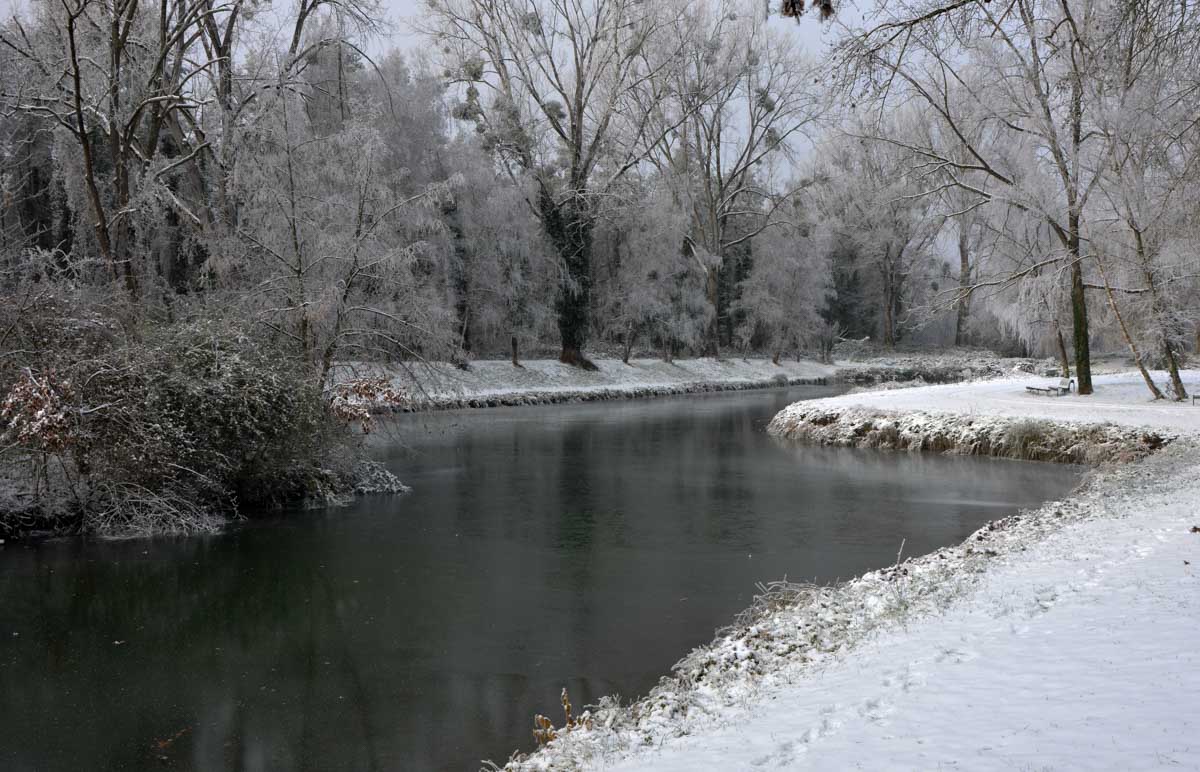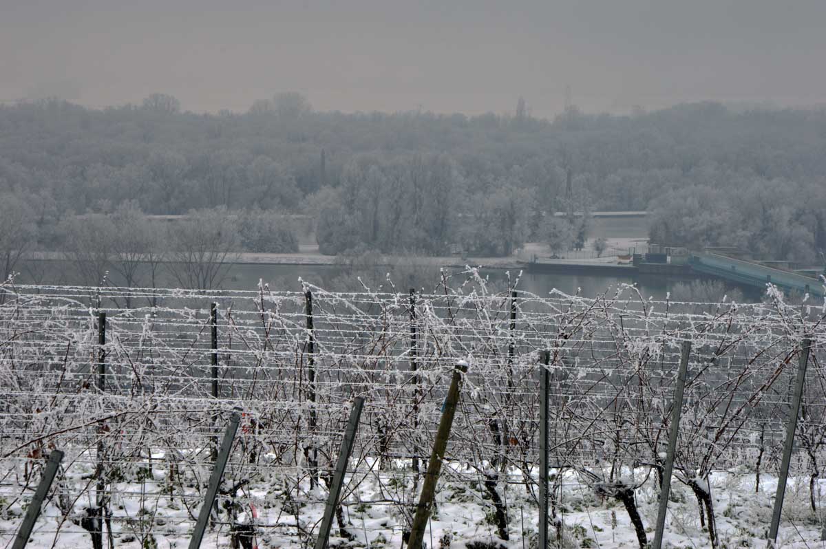 La neige remplaçant la glace dans la forêt rhénane, la progression fut plus facile jusqu’au Rhin, que nous avons découvert, émerveillés, dans un écrin blanc et brumeux. Spectacle rare. Il ne manquait plus qu’un vol d’oies sauvages pour parfaire… ah ben quand on parle du loup, enfin des oies, les voilà justement qui nous survolent en formation triangulaire.
