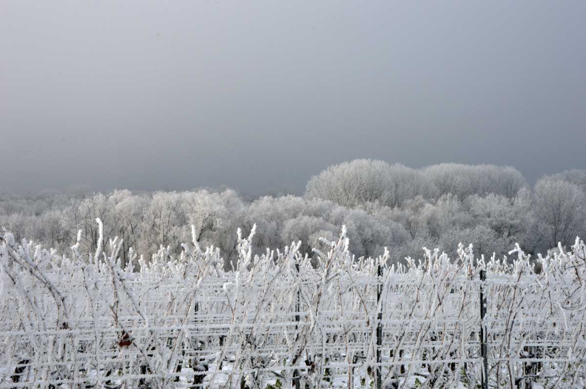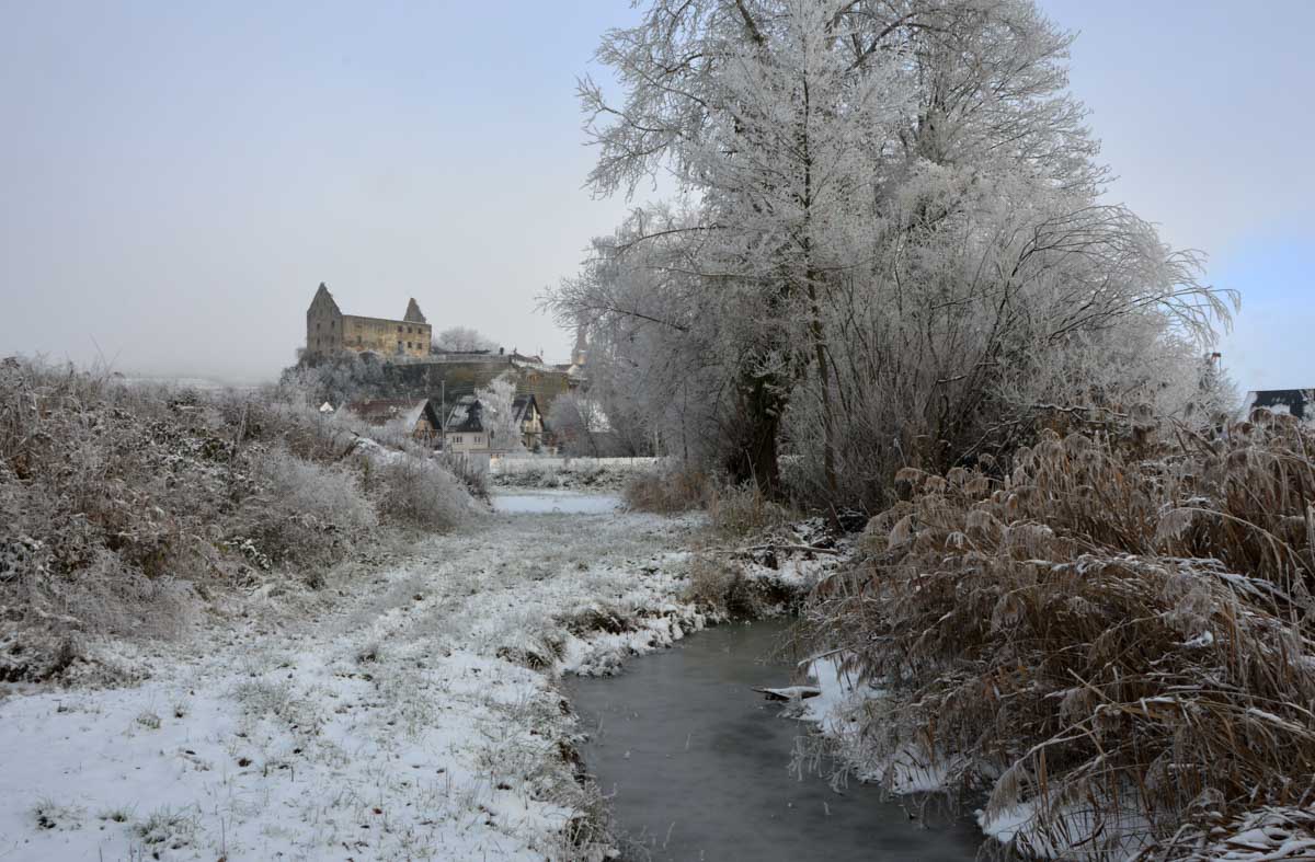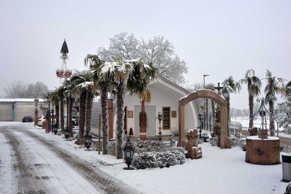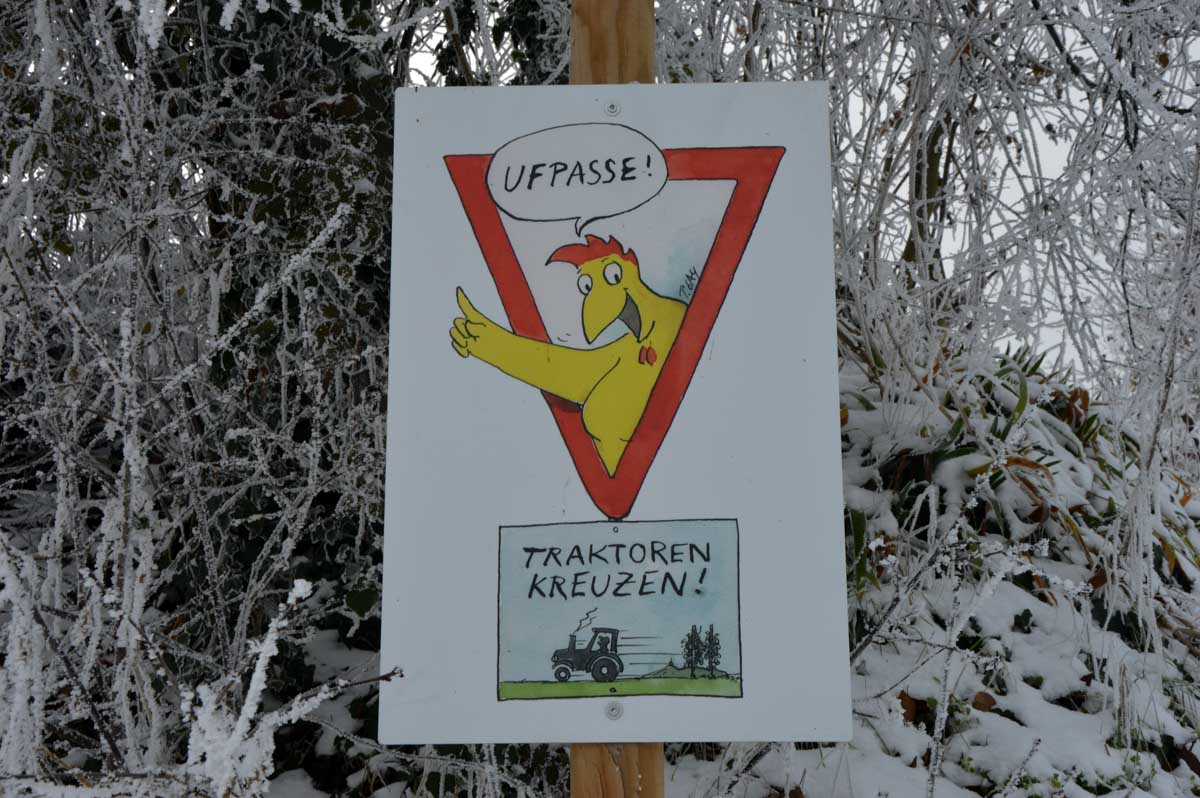 Premier château, une ruine comme il se doit, celui de Burkheim, puis la brume et le chemin vers Jägerhof où nous attendait une chapelle aussi originale que contemporaine, entourée de palmiers givrés, eux aussi. Dédiée à Saint-Georges, elle a été consacrée en 2011, et construite par Johann Traber, issu d’une célèbre famille d’artistes allemands funambules… ouillouillaille… Equilibristes en tous les cas, nous on ne l’est pas, la vache, ça glisse dans le coin du Jägerhof !