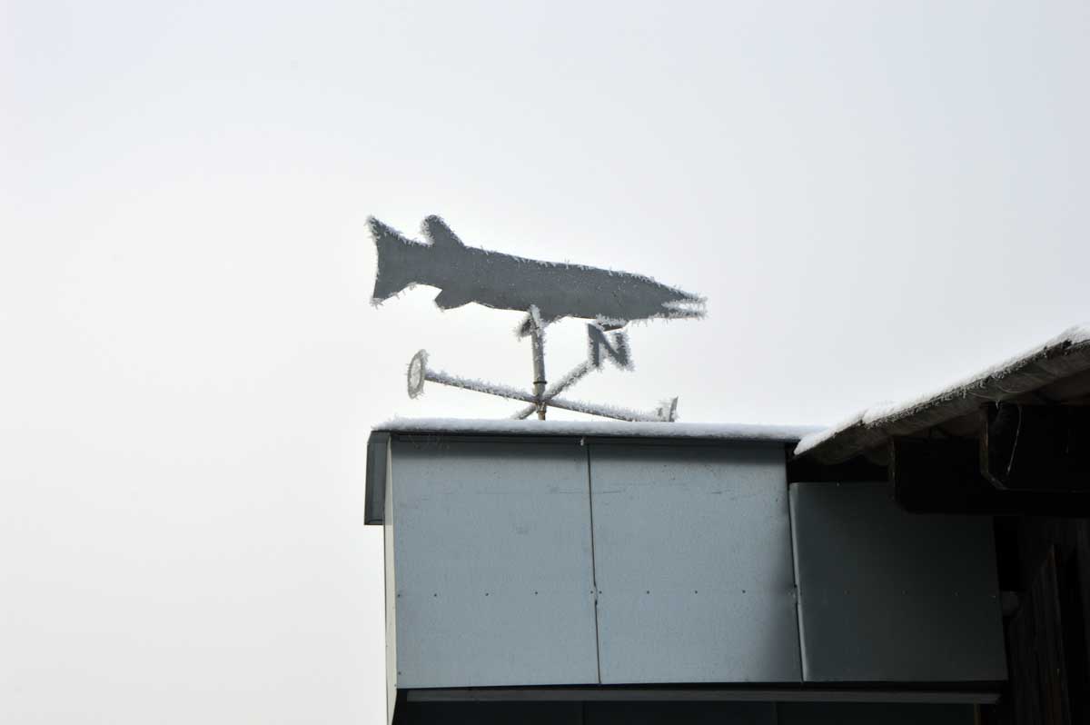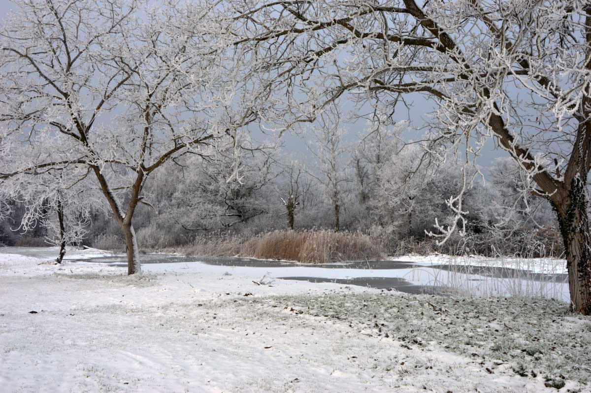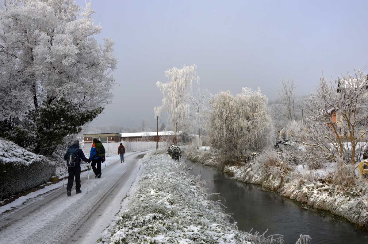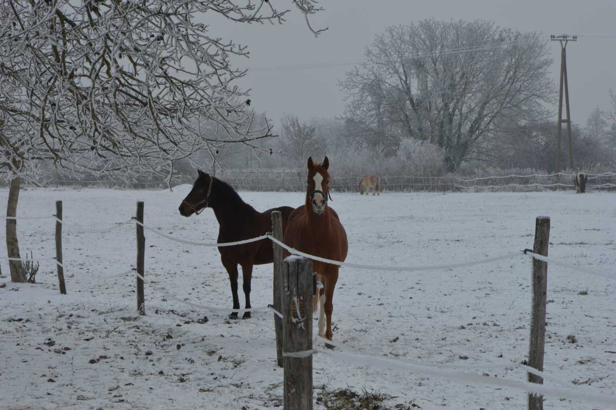Il fallait être givré pour sortir aujourd’hui, le thermomètre de la voiture indiquant -7°C ! Et à propos de givré, à peine sortis de voiture, le froid sec nous a… aaahhh ! J’ai failli me ramasser, ça glisse. Donc le froid nous a enveloppés.