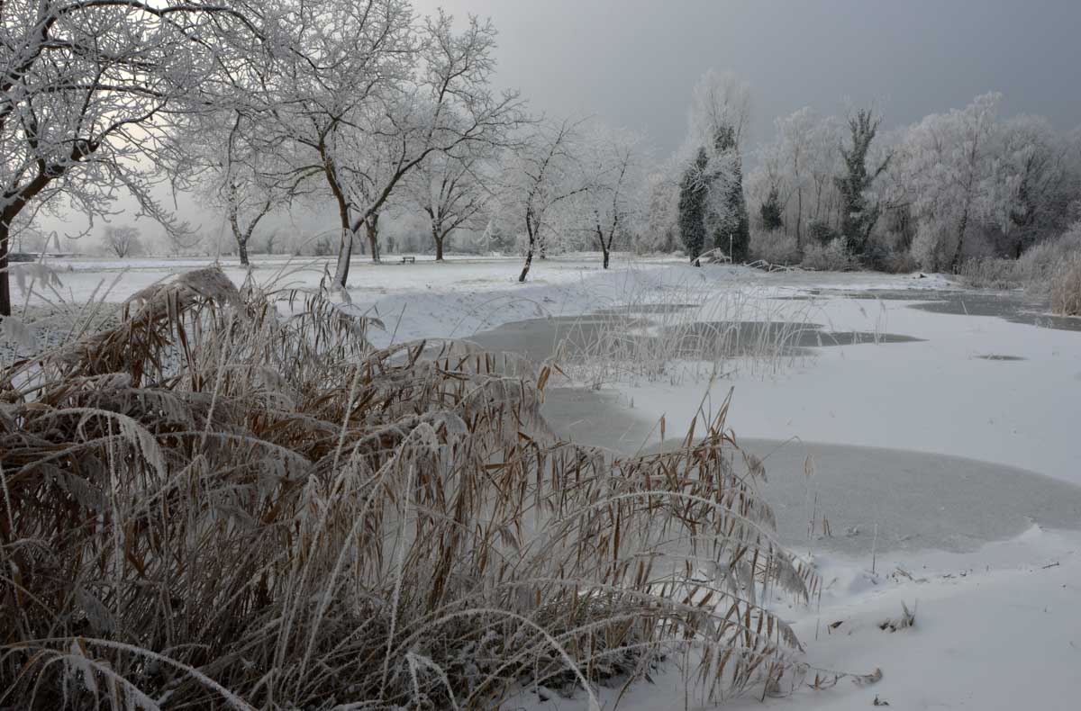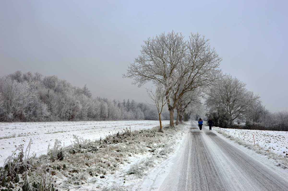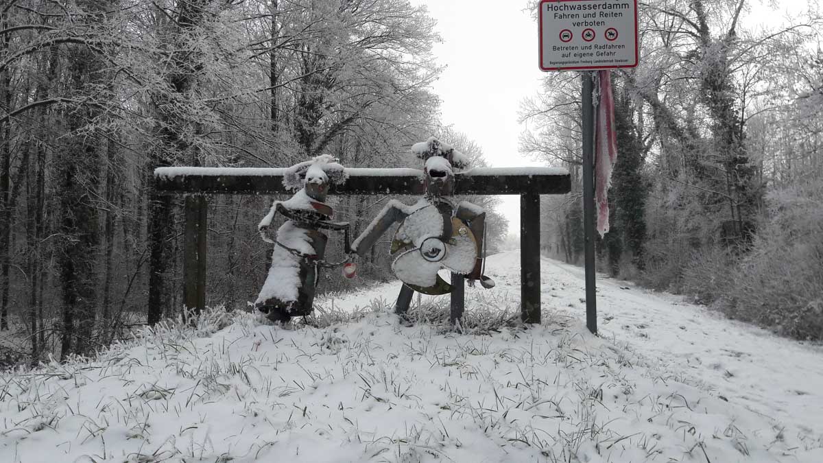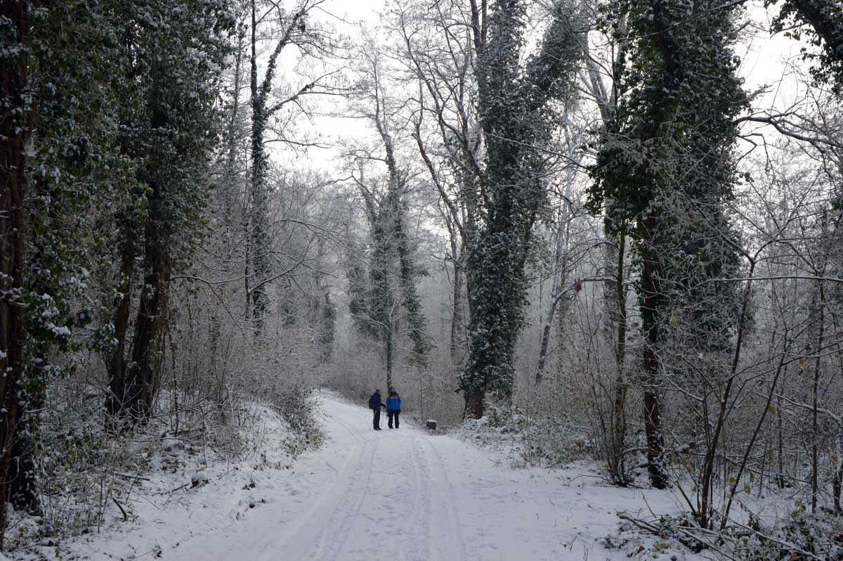 Mais par ce temps sec, habillés en conséquence, nous avions bien chaud et pouvions profiter de ce paysage féérique, à savoir les prés et la forêt rhénane sous la neige… iiiihaaaiii… qu’est-ce que c’était ? Oh, une presque chute, magnifiquement rattrapée par un moulinet de bras assorti de sonorités quasi-animales.