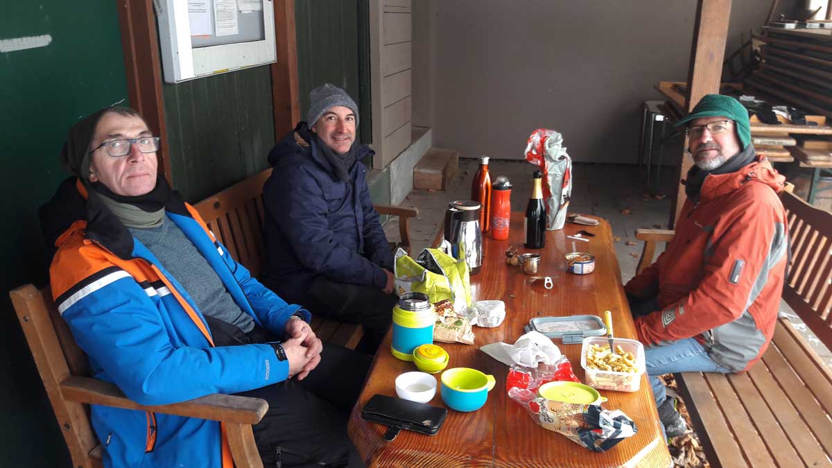 Retour dans la forêt pour cheminer tranquillement vers le nord et… ooohhhaaiilllou ! Ah, une gamelle, fallait bien que ça arrive. Plus de cris que de mal, et nous voici attablés sous un abri inattendu pour déguster notre déjeuner.