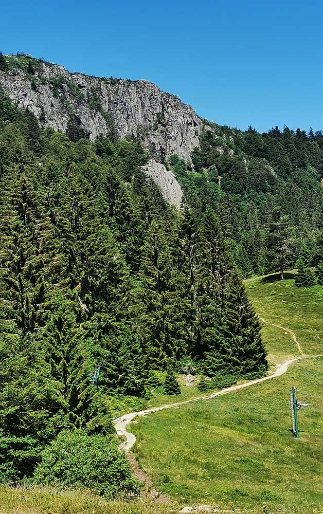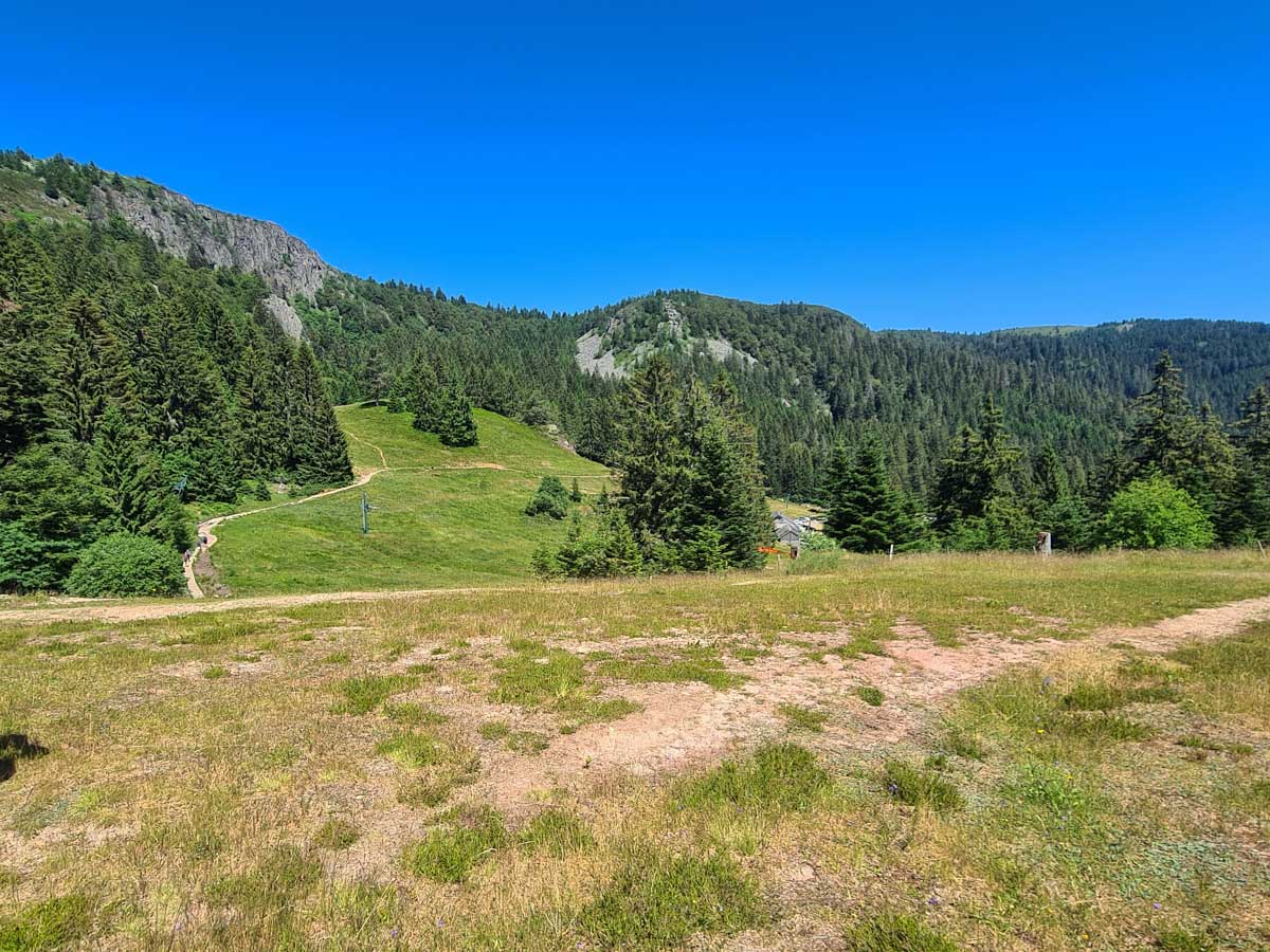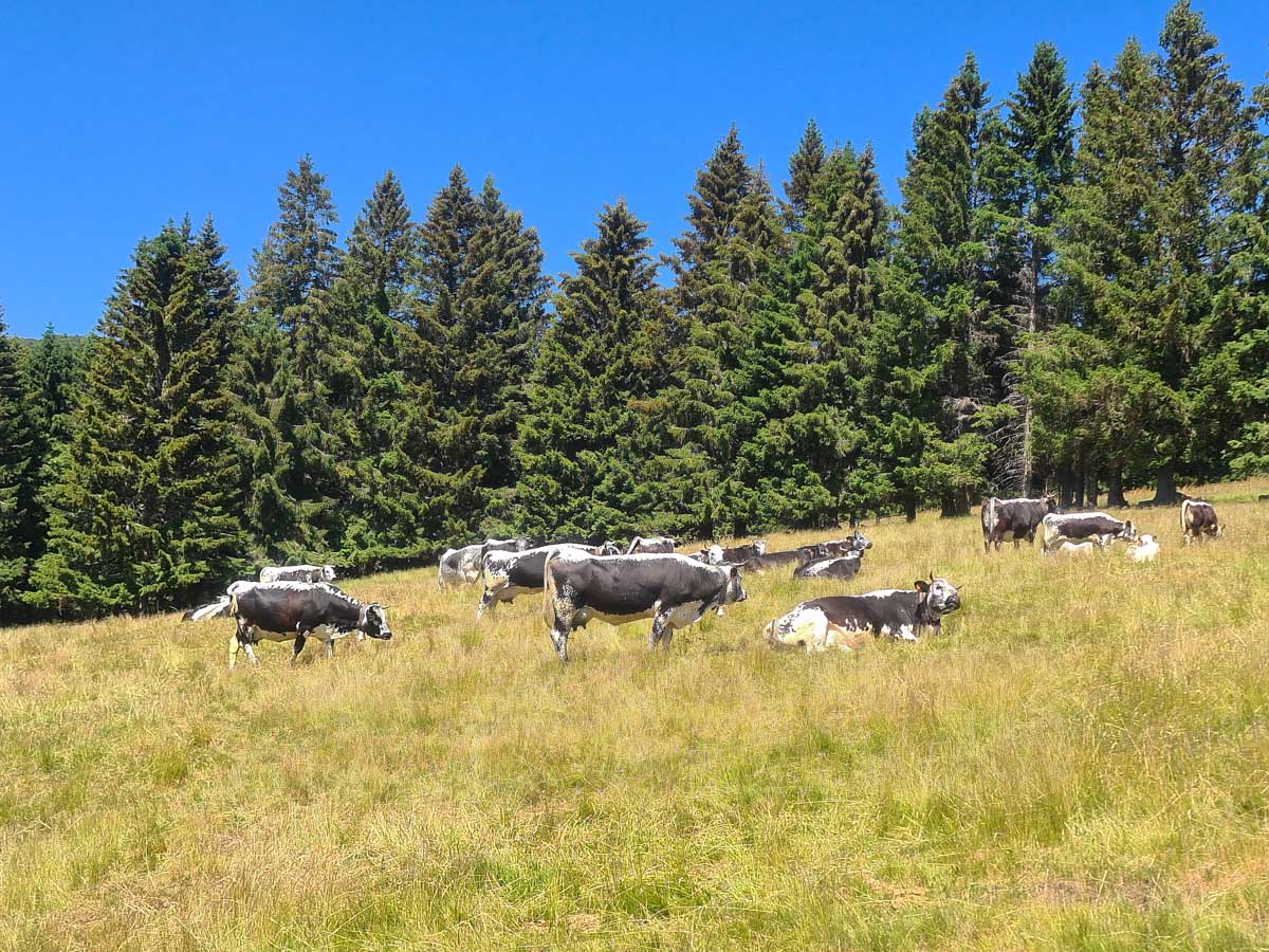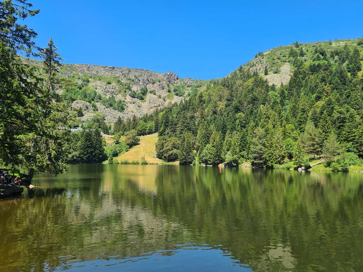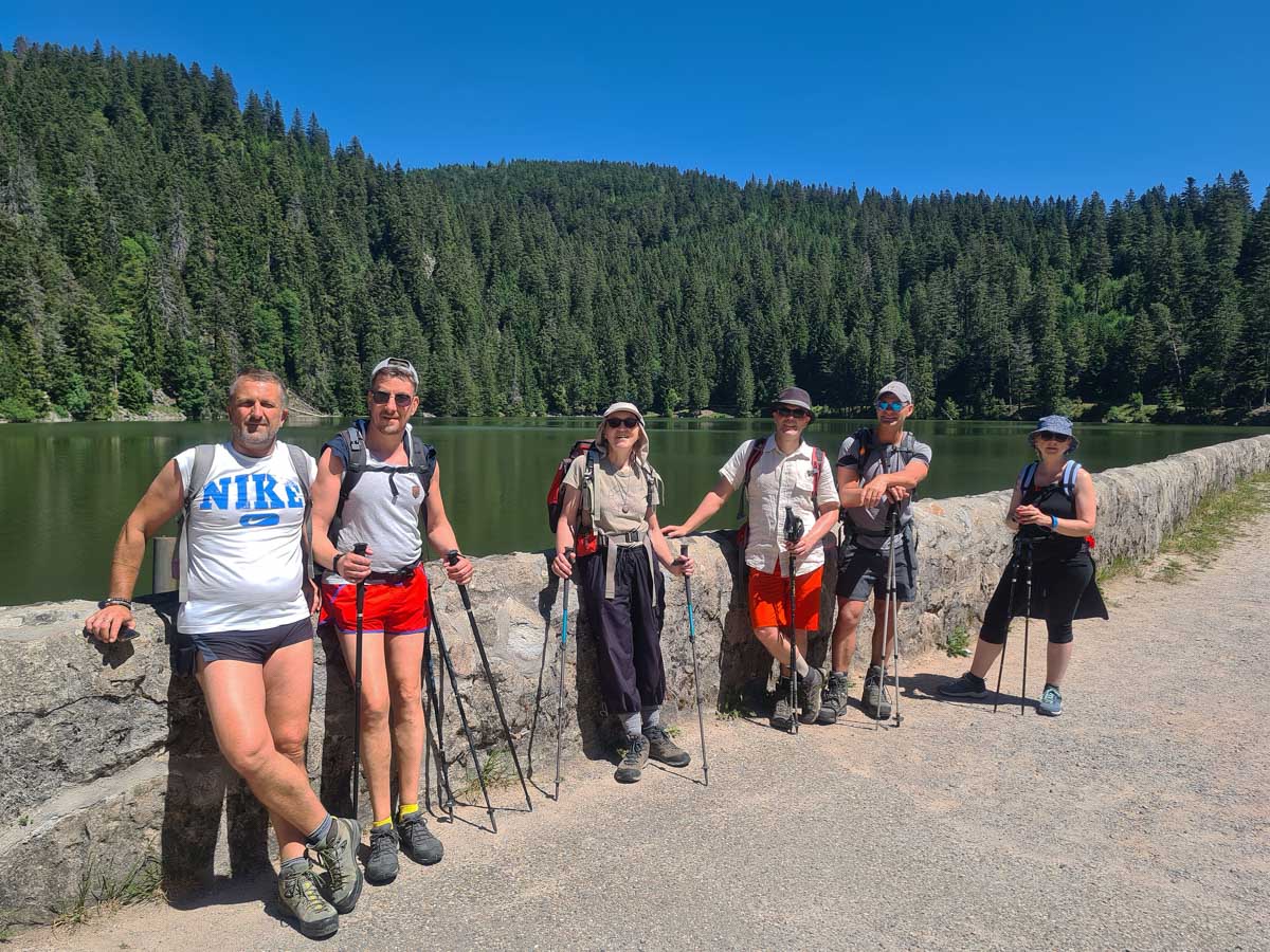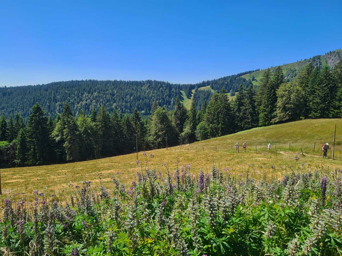 Une fois n’est pas coutume, toute la matinée durant, nous n’avons fait que descendre dans l’ombre de la forêt. Nous nous sommes offerts un déjeuner au bord du Lac des Truites (connu aussi sous le nom de Forlet), et nous avons ensuite rejoint la ferme-auberge dans ce magnifique site glaciaire. Un décor presqu’alpin. Certains gourmands et aussi certaines gourmandes se sont laissés tenter par du siesskass, d’autres par une glace. Une fois rassasiés, sustentés, abreuvés, nous repartîmes avec courage dans l’après-midi brûlant. En fait la température est tout à fait supportable à cette altitude, c’est juste pour impressionner Karina-Iris, qu’avait qu’à être là, celle-là aussi !