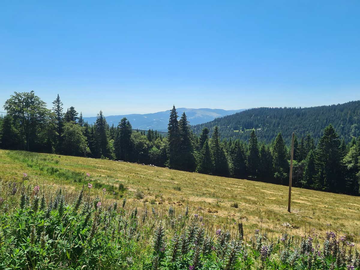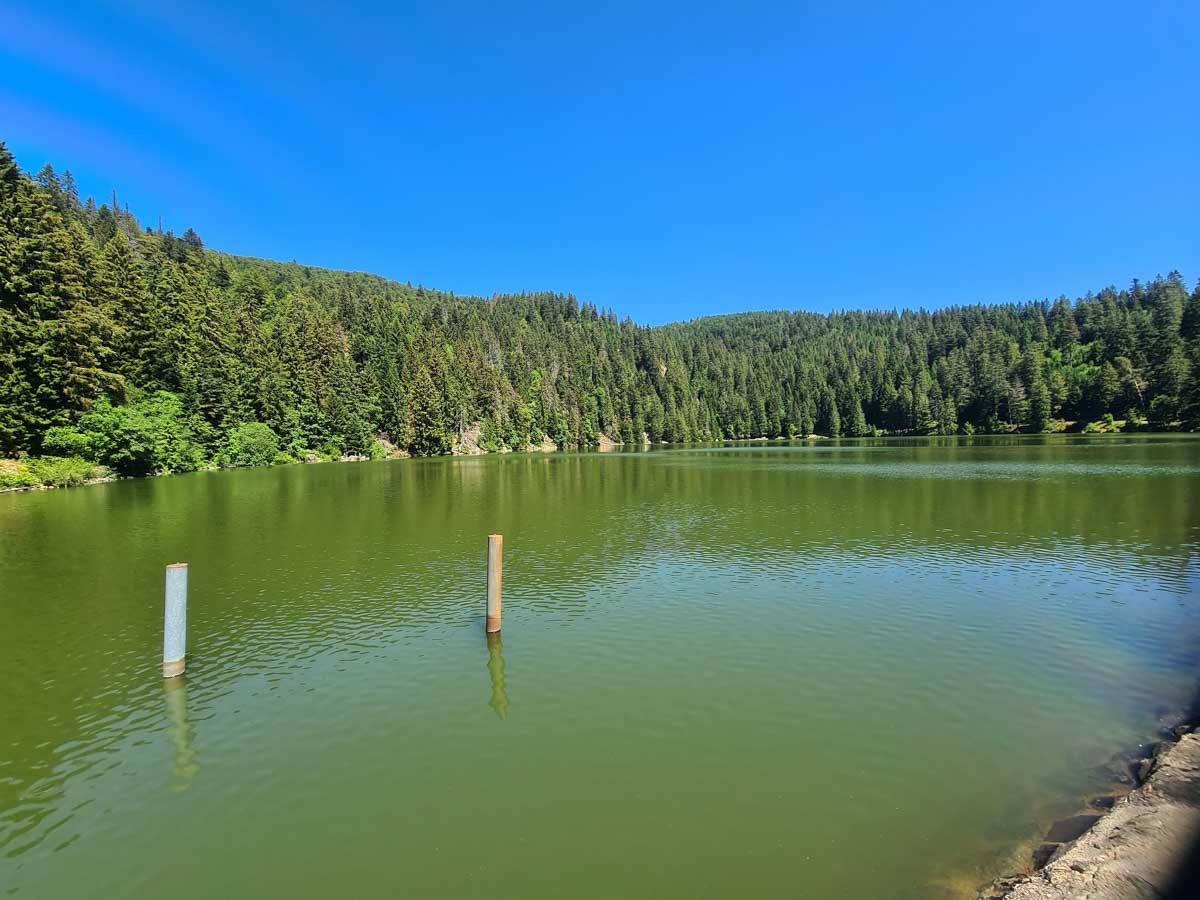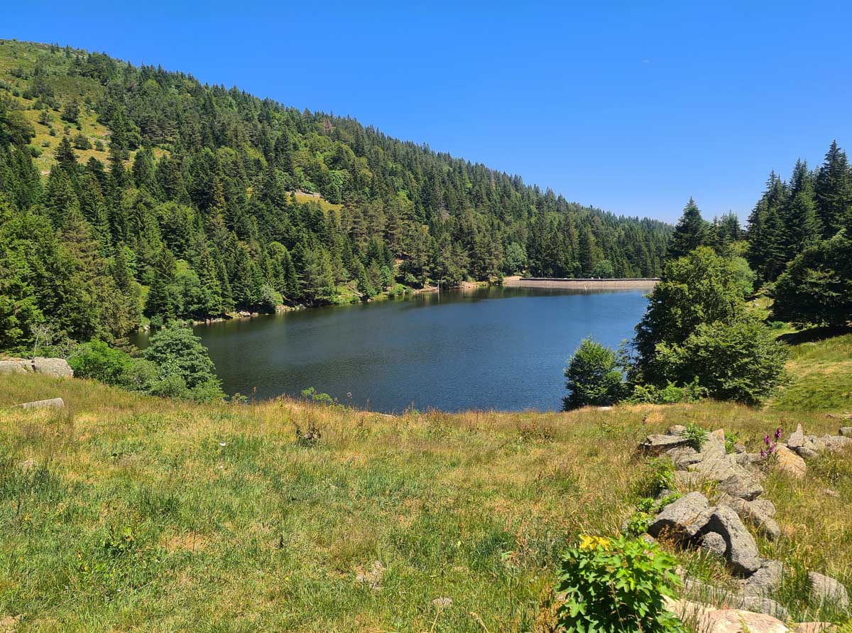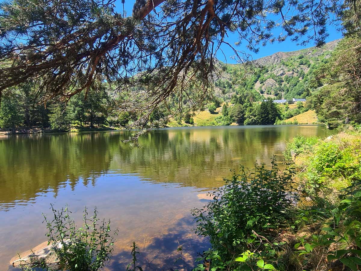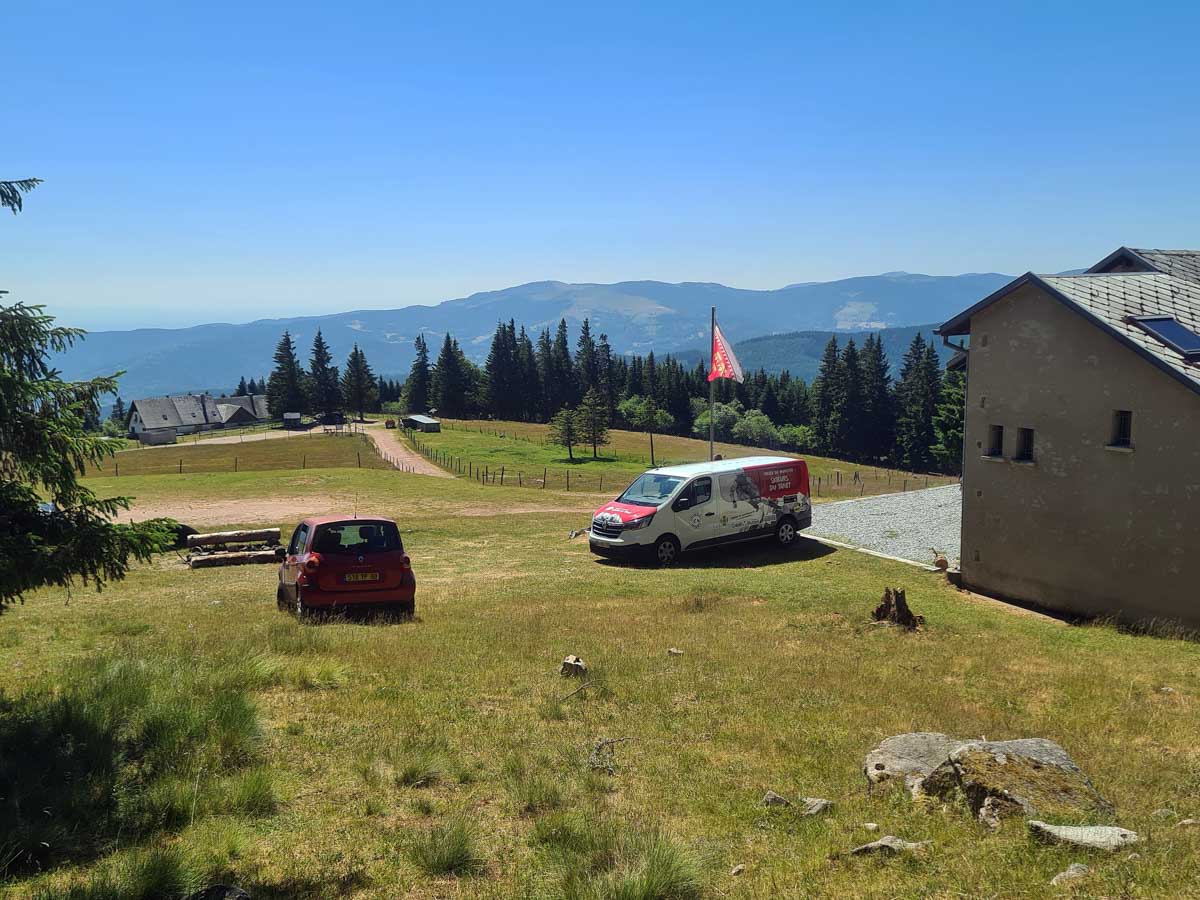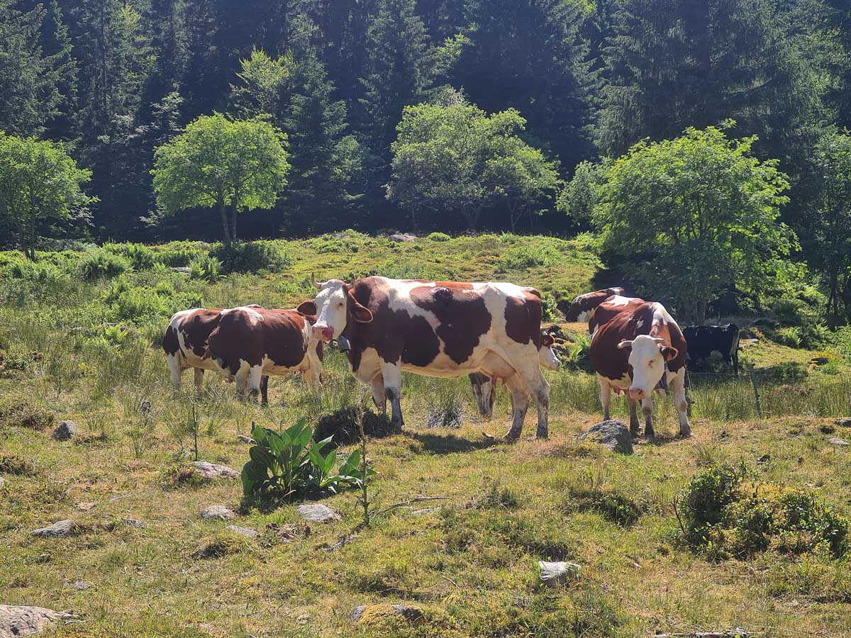 Une fois n’est pas coutume, toute la matinée durant, nous n’avons fait que descendre dans l’ombre de la forêt. Nous nous sommes offerts un déjeuner au bord du Lac des Truites (connu aussi sous le nom de Forlet), et nous avons ensuite rejoint la ferme-auberge dans ce magnifique site glaciaire. Un décor presqu’alpin. Certains gourmands et aussi certaines gourmandes se sont laissés tenter par du siesskass, d’autres par une glace. Une fois rassasiés, sustentés, abreuvés, nous repartîmes avec courage dans l’après-midi brûlant. En fait la température est tout à fait supportable à cette altitude, c’est juste pour impressionner Karina-Iris, qu’avait qu’à être là, celle-là aussi !