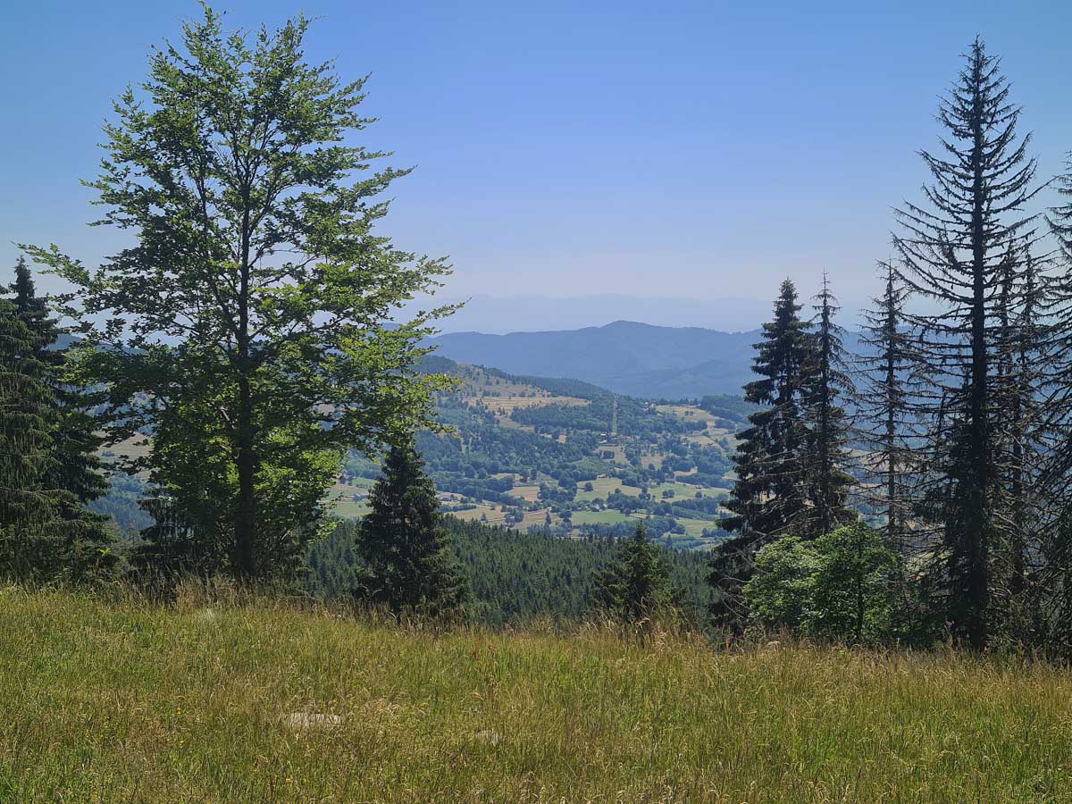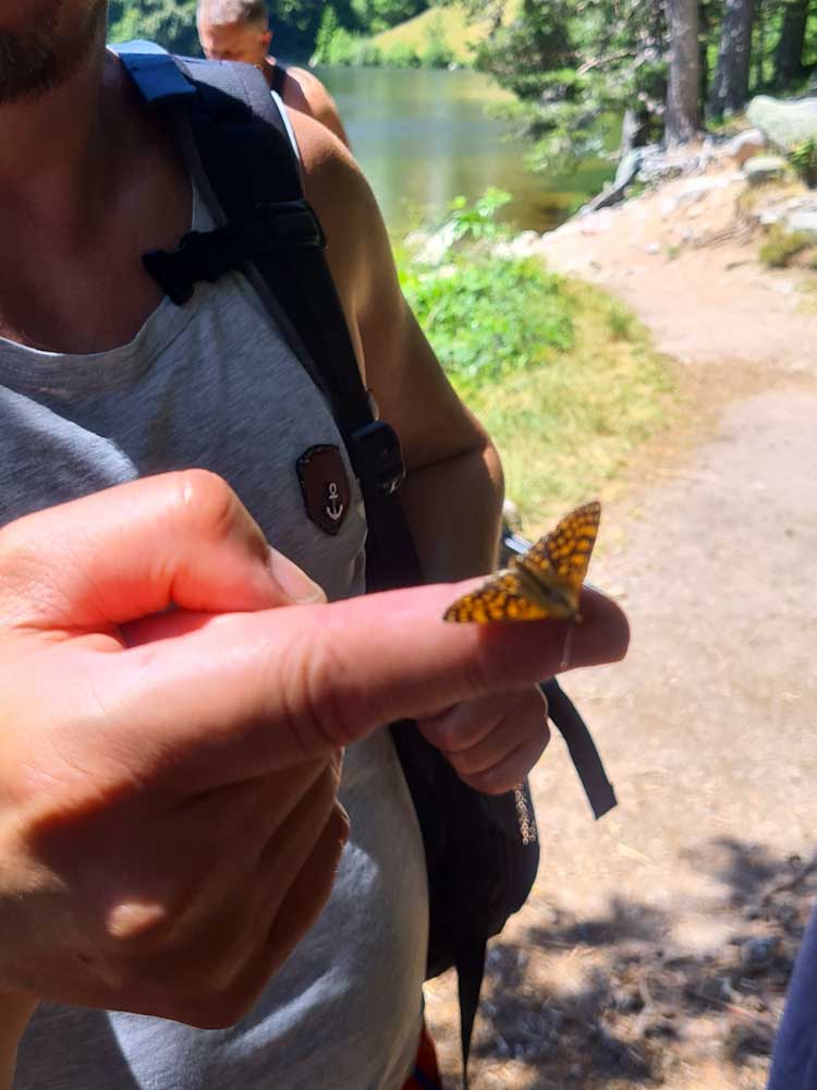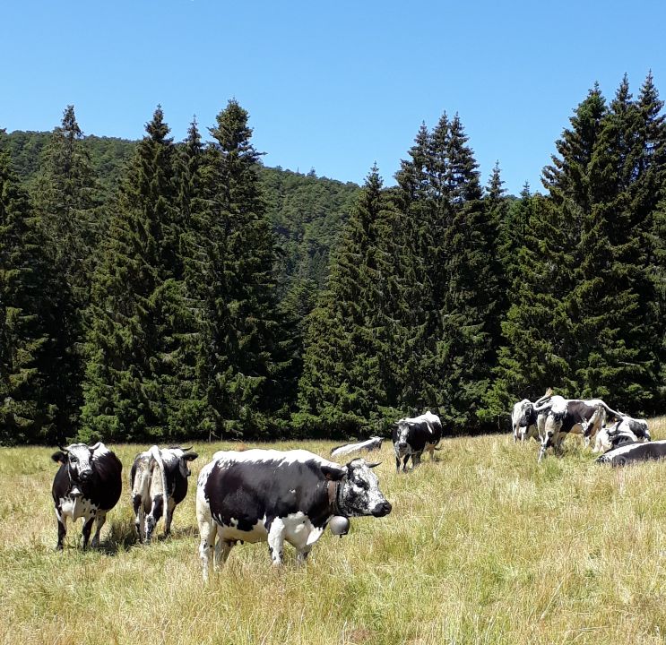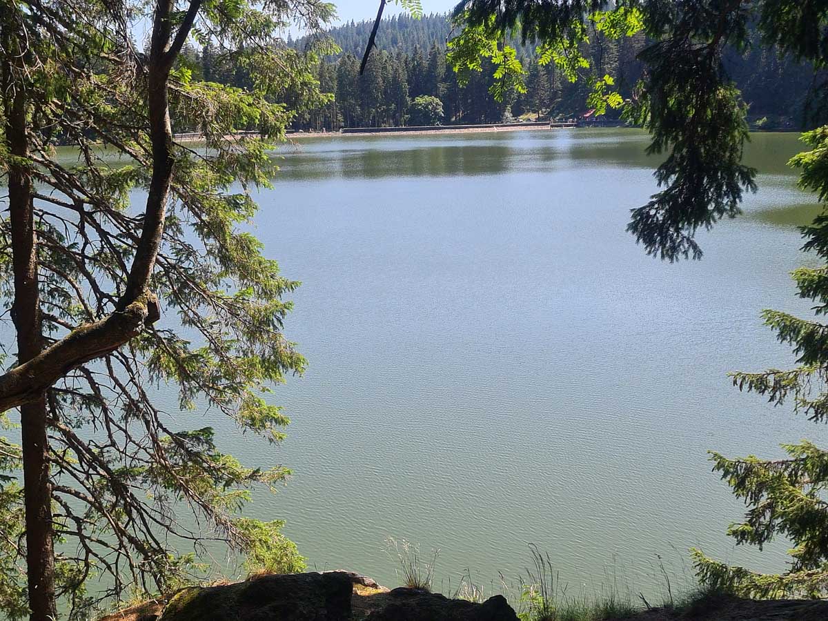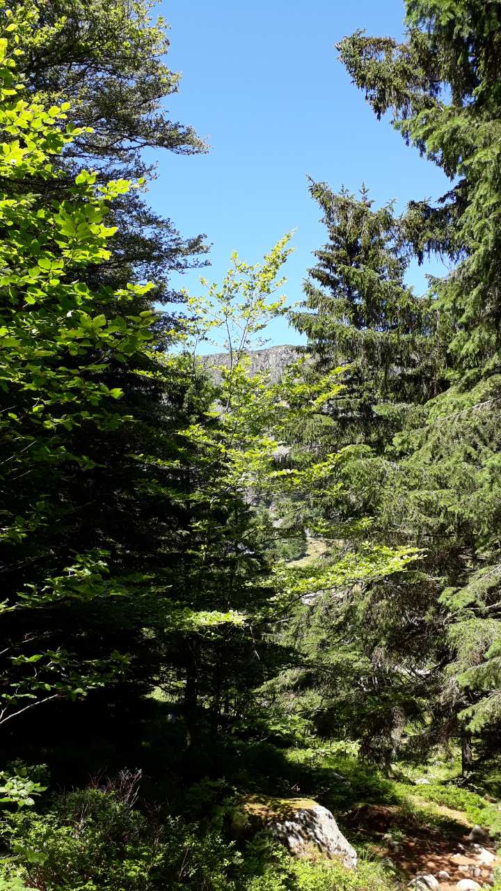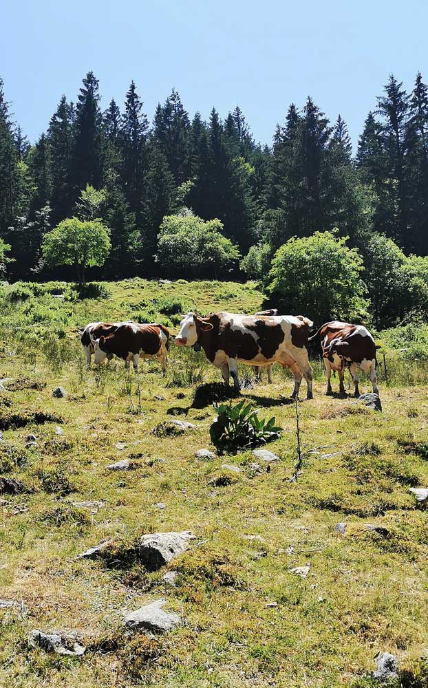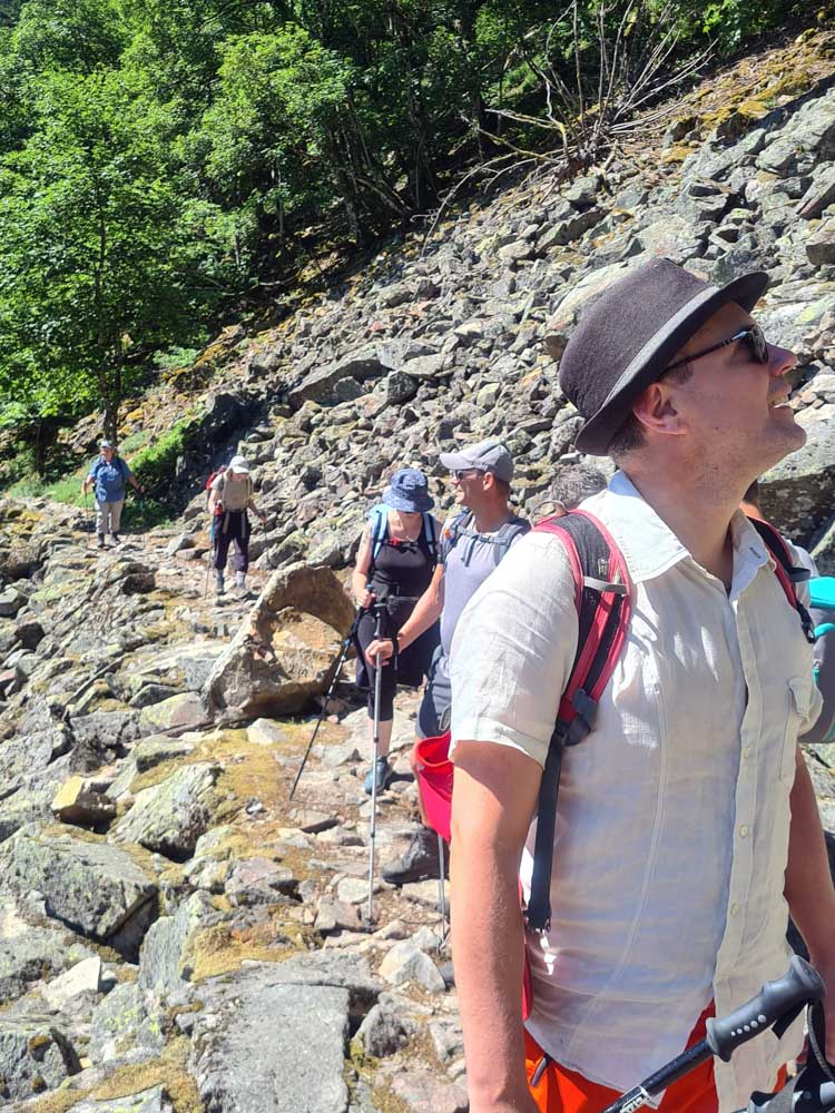 Une fois n’est pas coutume, toute la matinée durant, nous n’avons fait que descendre dans l’ombre de la forêt. Nous nous sommes offerts un déjeuner au bord du Lac des Truites (connu aussi sous le nom de Forlet), et nous avons ensuite rejoint la ferme-auberge dans ce magnifique site glaciaire. Un décor presqu’alpin. Certains gourmands et aussi certaines gourmandes se sont laissés tenter par du siesskass, d’autres par une glace. Une fois rassasiés, sustentés, abreuvés, nous repartîmes avec courage dans l’après-midi brûlant. En fait la température est tout à fait supportable à cette altitude, c’est juste pour impressionner Karina-Iris, qu’avait qu’à être là, celle-là aussi !