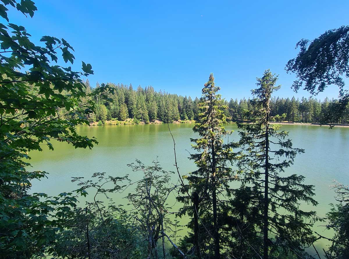 Premier objectif : le Lac Vert (1044 m). Nous avons longé la rive Est du lac puis nous nous dirigêames au travers des pâturages jaunis par la sécheresse vers la ferme du Lac Vert et le chalet Erichson d’où nous avons commencé la partie en aller-retour vers notre second objectif: le Lac des Truites (1066 m).