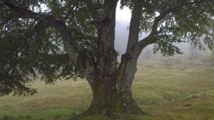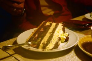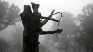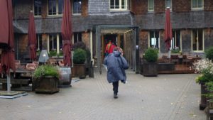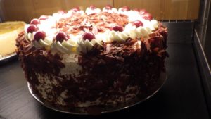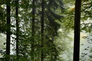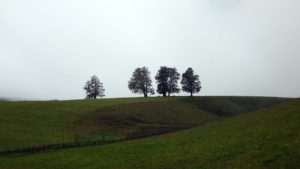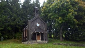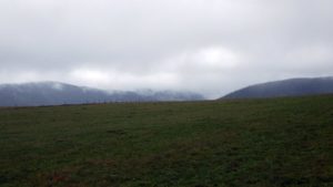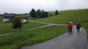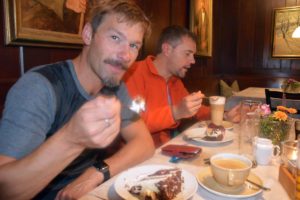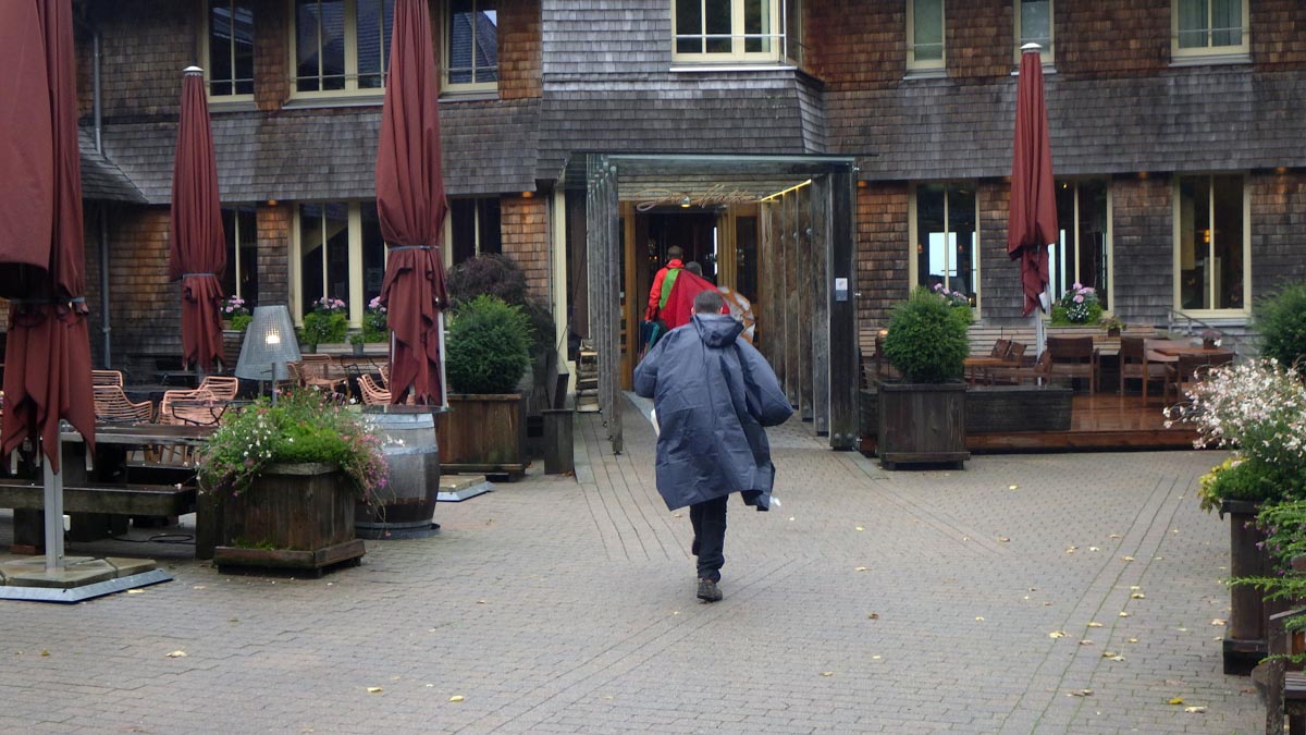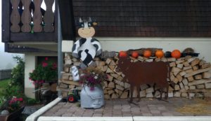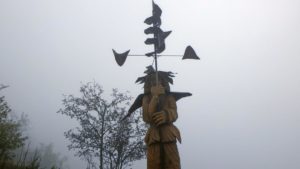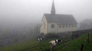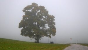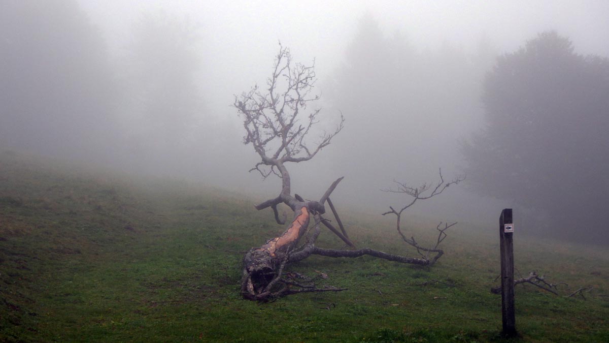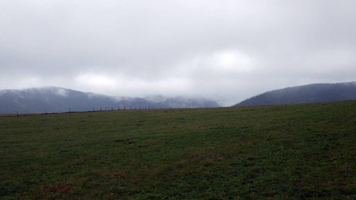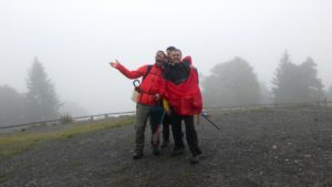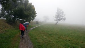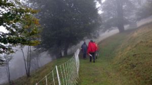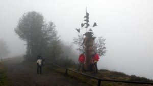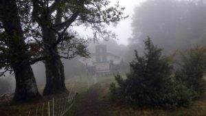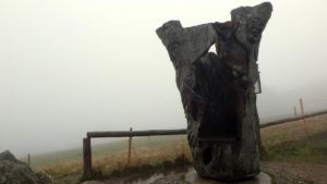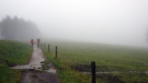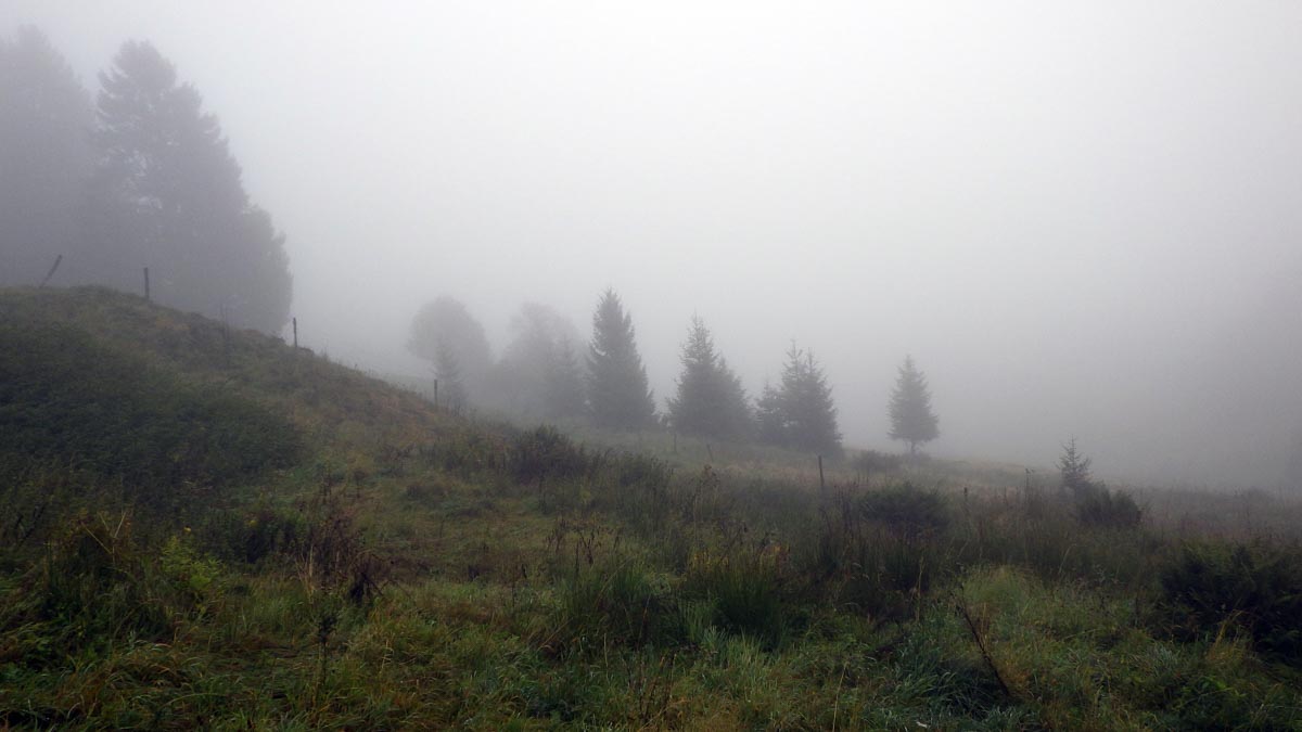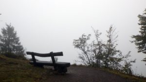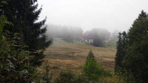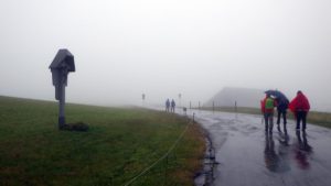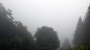 Le brouillard donnait une ambiance particulière à la montagne, avec des arbres émergeant comme des fantômes. Allions-nous nous laisser abattre et renoncer au Kaffee-Kuchen ? Certainement pas ! Tant qu’à être sur place, autant manger une vraie Forêt-Noire servie par une dame en costume local.