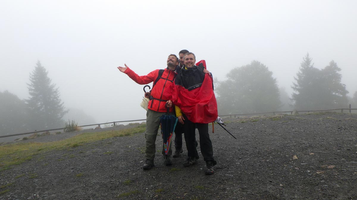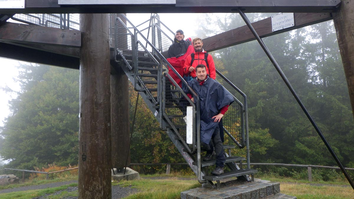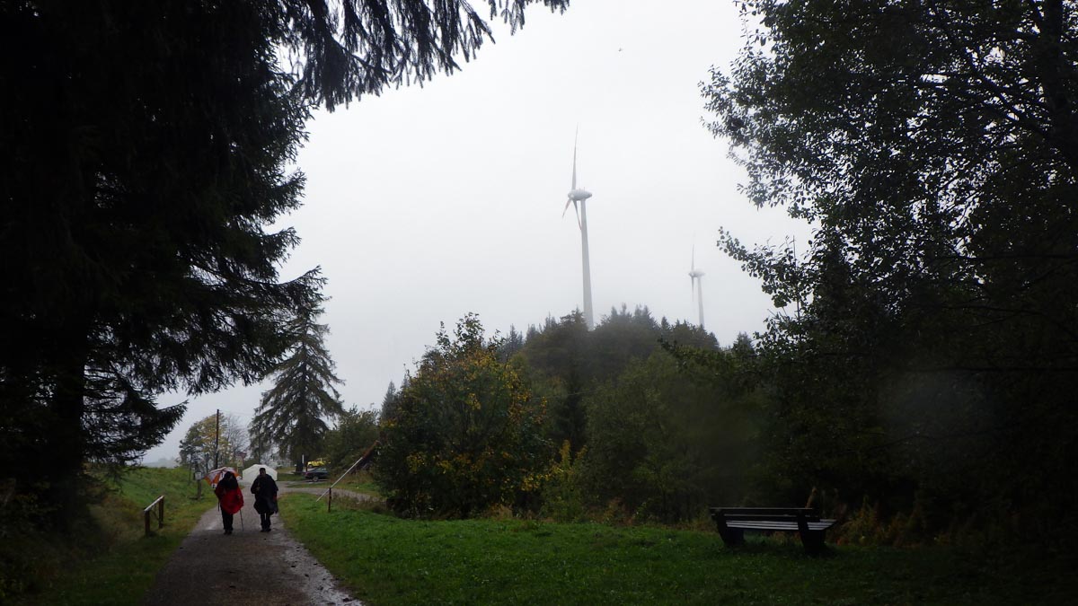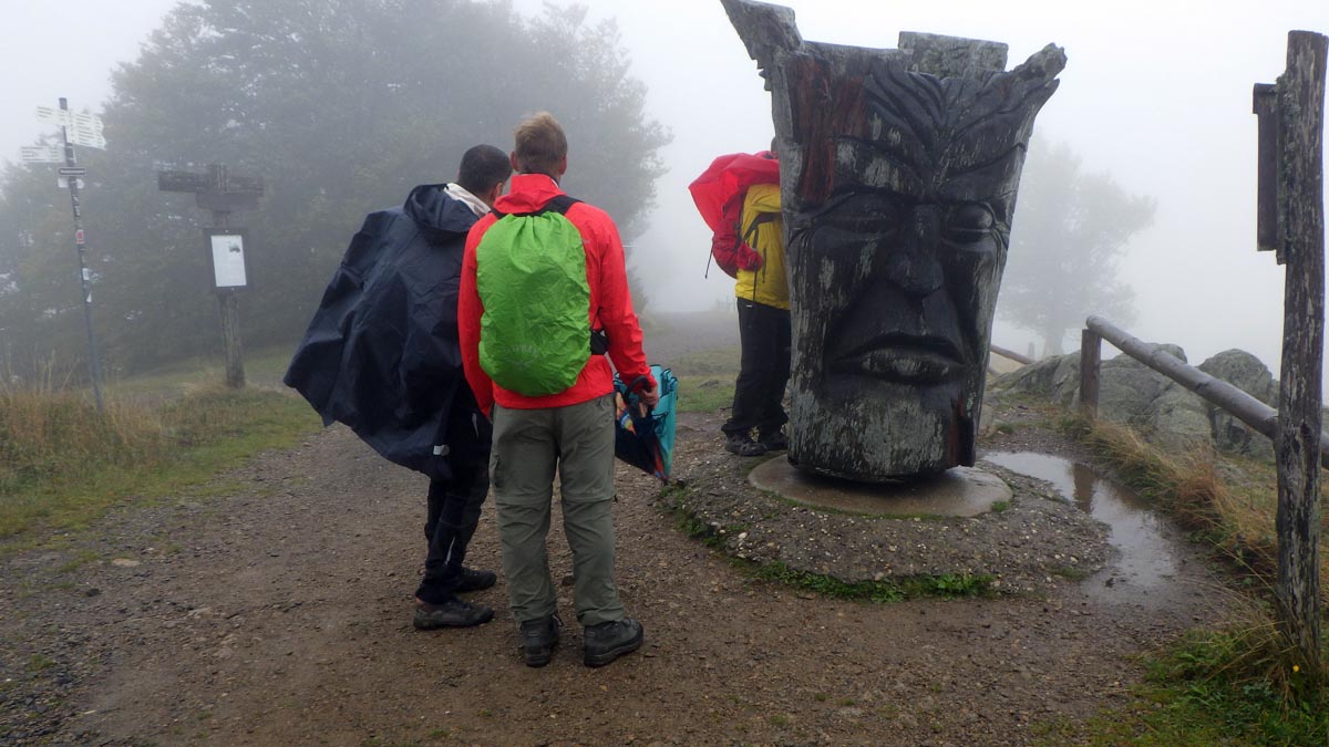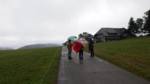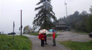 Le nom du Schauinsland, à 1284 m, signifie « regarde le pays ». Nous avons regardé mais n’avons rien vu pour cause de nuages, de pluie ou de brouillard. Mais quelle importance puisque nous nous sommes aérés durant une belle journée de rire ? Equipés, motivés, nous voici partis pour l’ascension de ce sommet de Forêt-Noire sur lequel nous attendait une tour d’observation. D’ailleurs elle nous attend toujours car nous avons juste posé au pied de son escalier !