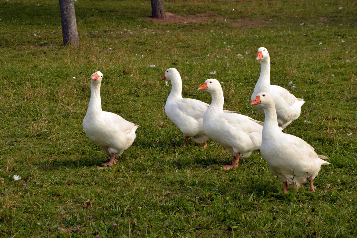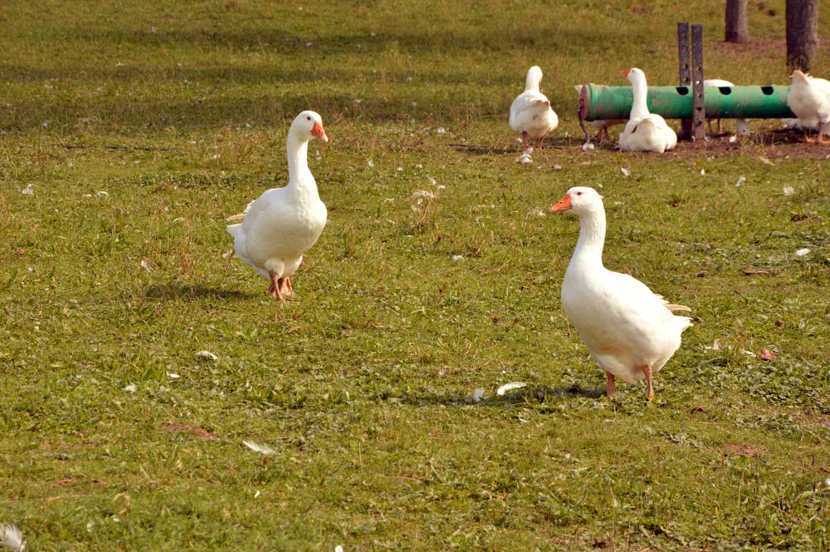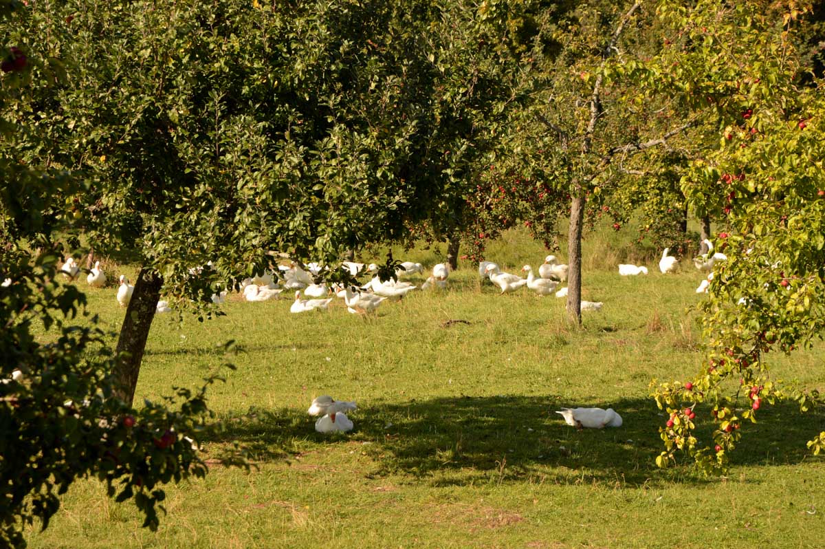 Juste à côté, nous vîmes un élevage de Weinachtsgänze, autrement dit des oies de Noël. J’eus pitié, les pauvres, si elles savaient ce qui les attend pour Noël… En attendant elles ont l’air heureuses dans ce véritable champ d’oies, oui un champ, pas un chant d’oie dont on sait qu’elle cacarde, entre autres. Enfin qu’on l’entend avant de la voir.