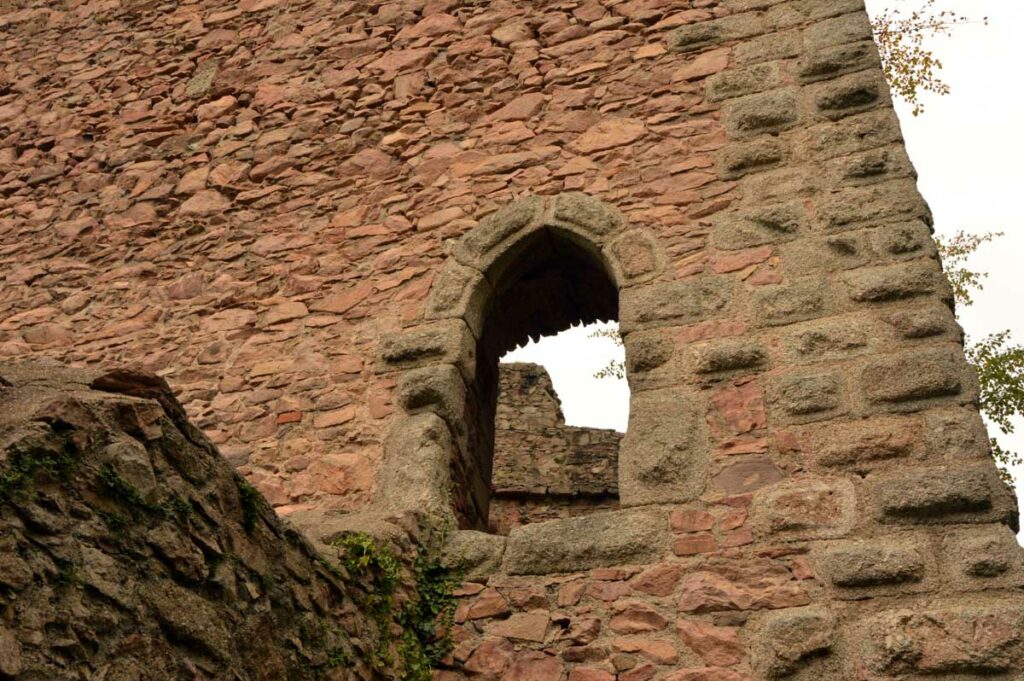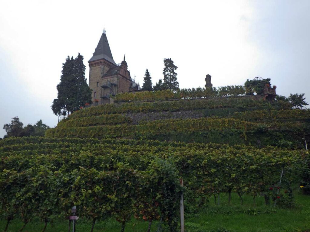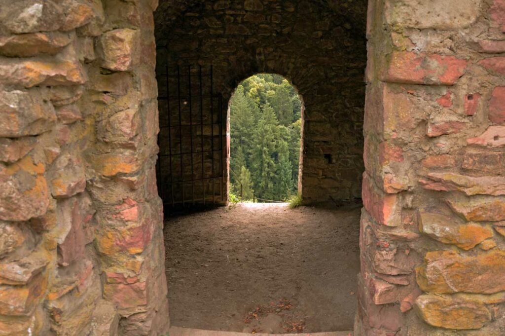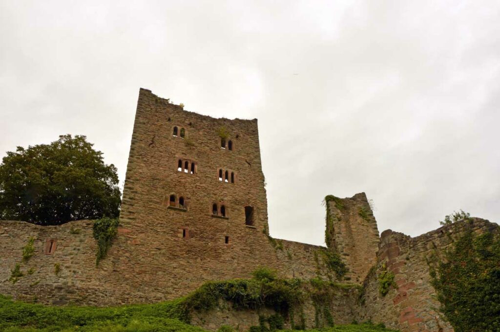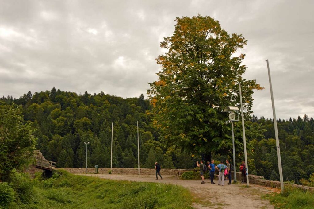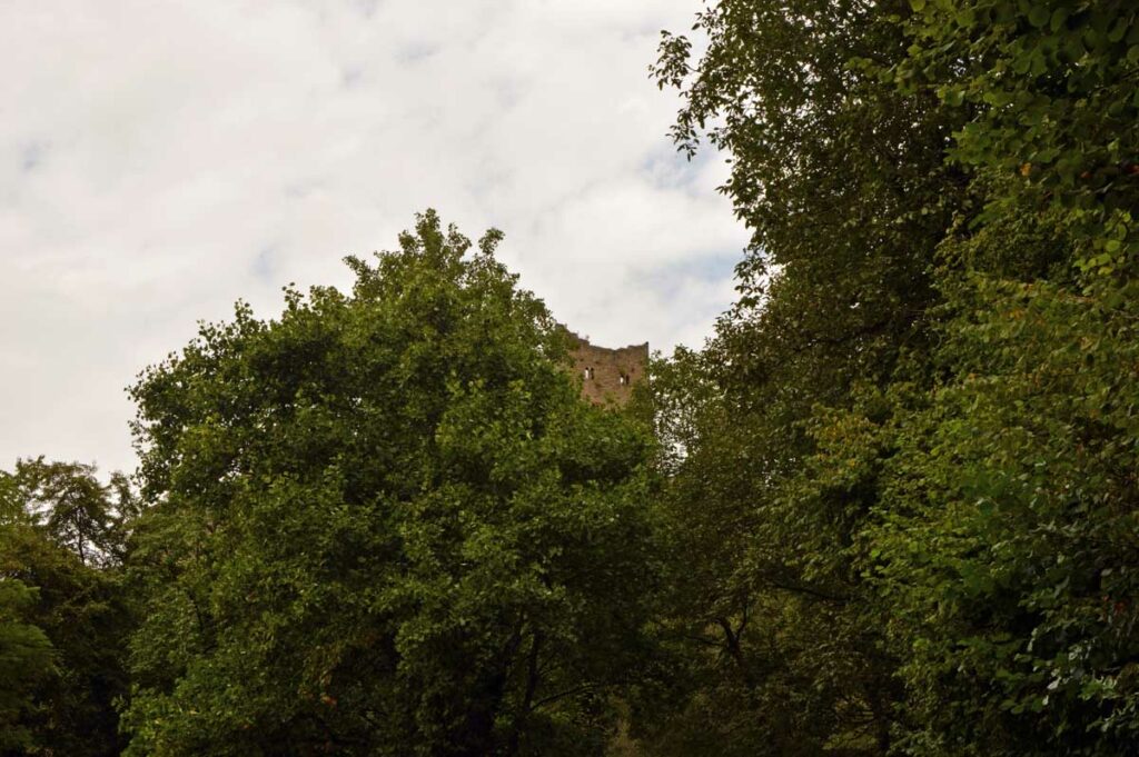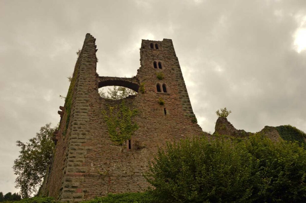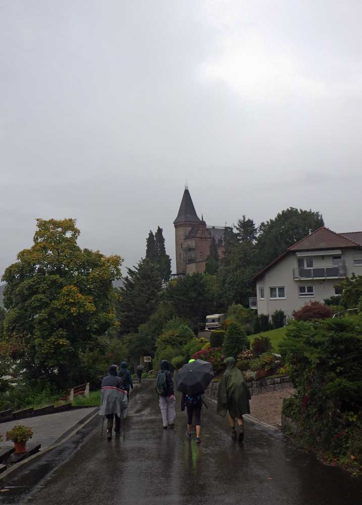 Et donc il a sa statue à Oberkirch, qui représente le personnage en couverture originale du livre. Un pied palmé, l’autre en sabot, des cornes, t’as envie de fuir ! Mais impossible de courir dans la montée et le temps de me mettre en sueur, voilà déjà le château du Schauenburg. Enfin château, on se comprend. La ruine, hein. C’est là que tu te dis que la qualité allemande, laisse-moi m’esclaffer, permets-moi de pouffer, autorise-moi à me gondoler comme un vénitien amoureux, tolère que je parte en fou-rire !
