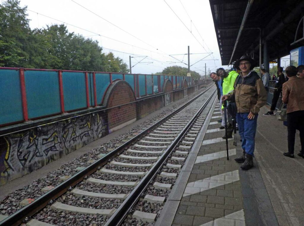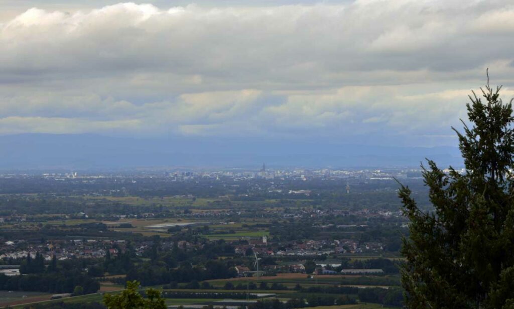Et alors là, ce fut un défilé de « Fels », de « Stein », avec des points de vue sur la plaine que se partagent l’Alsace et le Bade-Württemberg et même sur la cathédrale de Strasbourg ! Moi ce qui m’a rassurée, c’est que dès que tu sors de la forêt et des falaises, tu trouves de la vigne. Ce qui me met tout de suite l’eau à la bouche. Ben non, c’est pas le raisin lui-même que j’aime, tu penses… Sont bien ces gens-là, ils font du vin qui se boit bien une fois que tu as survécu au premier verre, et ils brassent des bières délicieuses servies au minimum par 50 cl. Pas comme ici où tu passes ton temps à commander des 25 cl, au point que t’en commandes deux tout de suite pour pas user prématurément les semelles du serveur. Et comme à Kappelrodeck il a fallu attendre le train du retour pour retrouver nos voitures (parce que non, grand malin, c’était pas une boucle !), nous nous offrîmes un Kaffee-Kuchen. Curieusement, ce mot-là, je l’écris toujours sans que mon clavier ait fourché !
