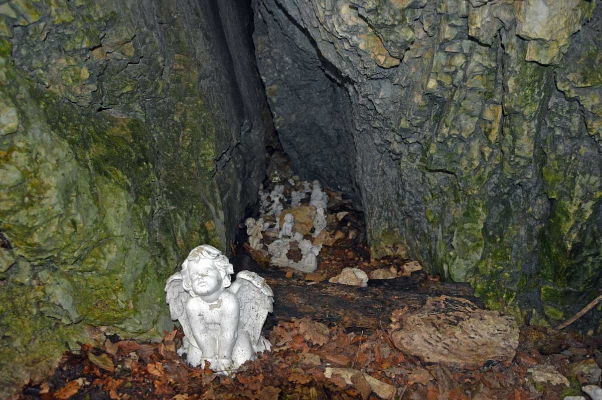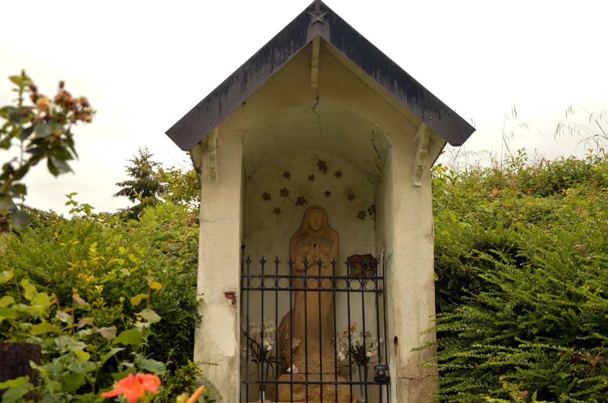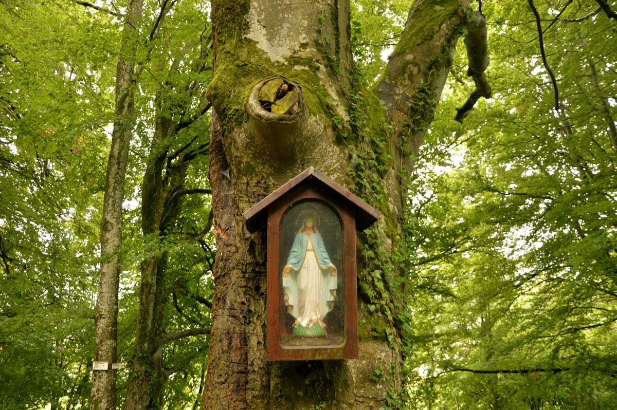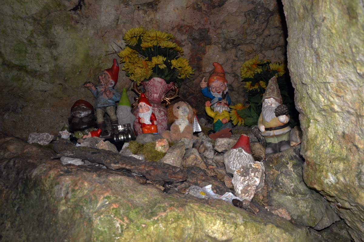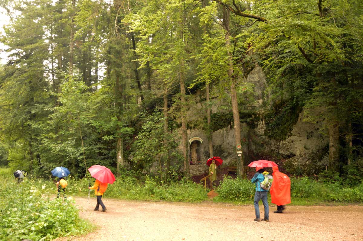 Tu me croyais zau bout de mes zémotions ? Que nenni ! Voici un canyon, une fêlure tectonique, le Grand Rift Alsacien, la dérive d’incontinents, une faille tempo-spationnelle, un gouffre où s’engouffrer, un vertige calcaire, un néant derthalien, et tout le bazar, mon canard, ben il ne porte même pas de nom. On parle de l’Erdwiebelenfelsen, mais va placer ça dans une soirée ! Et là-dedans se trouve la Grotte des Nains. C’est joli comme coin, en quelques pas, t’es dans un décor de cinéma, tu t’attends juste à ce qu’Indiana Jones (le vrai) arrive sur son canasson et que son fouet dérape pour te claquer le postér… enfin revenons à nos… non, y’avait même pas de moutons. Ambiance colo au centre de vacances Don Bosco à Ferrette. Le charme des années soixante-dix, un accueil de qualité, des gens super sympas, j’ai a-do-ré. Et demain, je te parle de leur chapelle, elle te donne direct envie de te (con)fesser. Indie ! Reviens avec ton fouet !